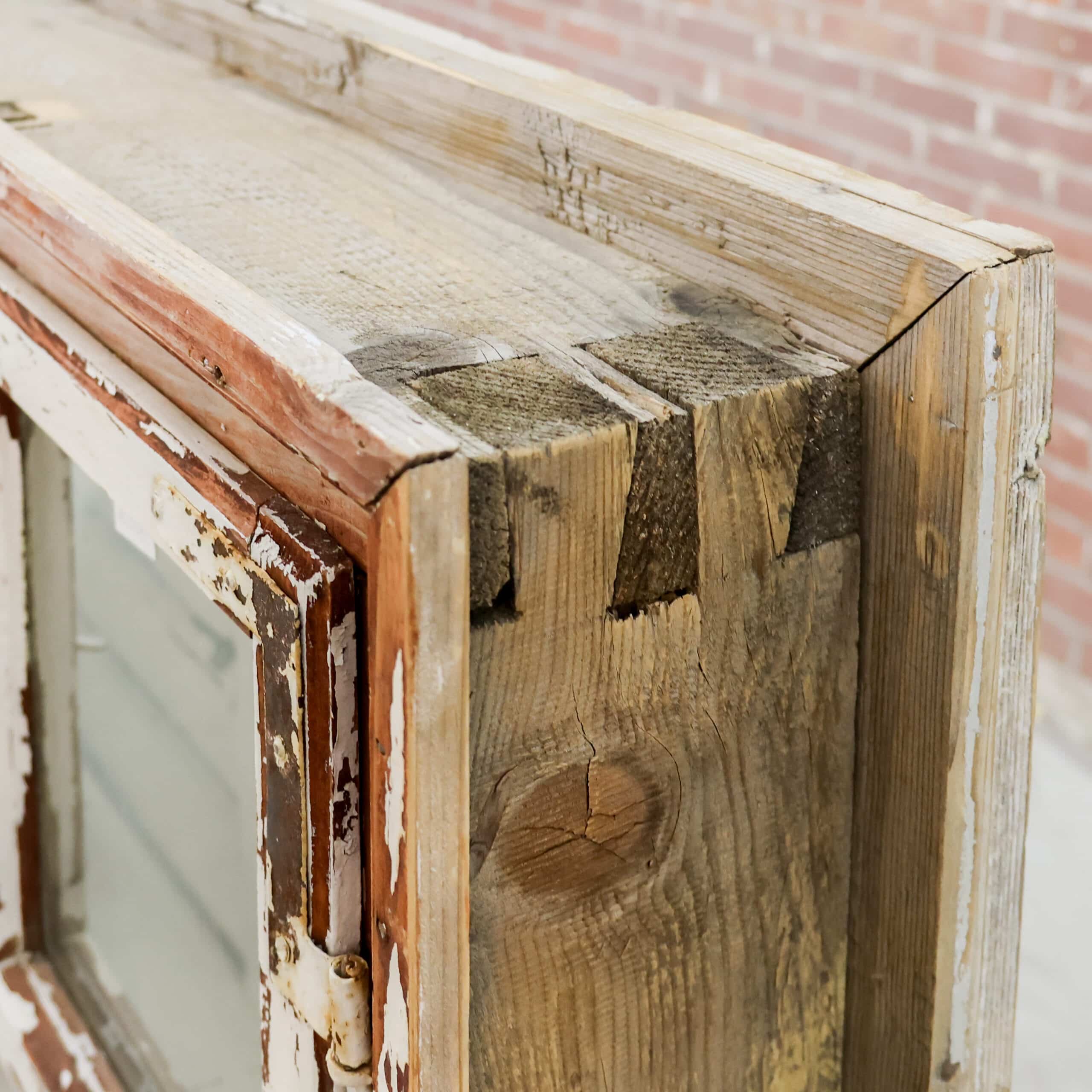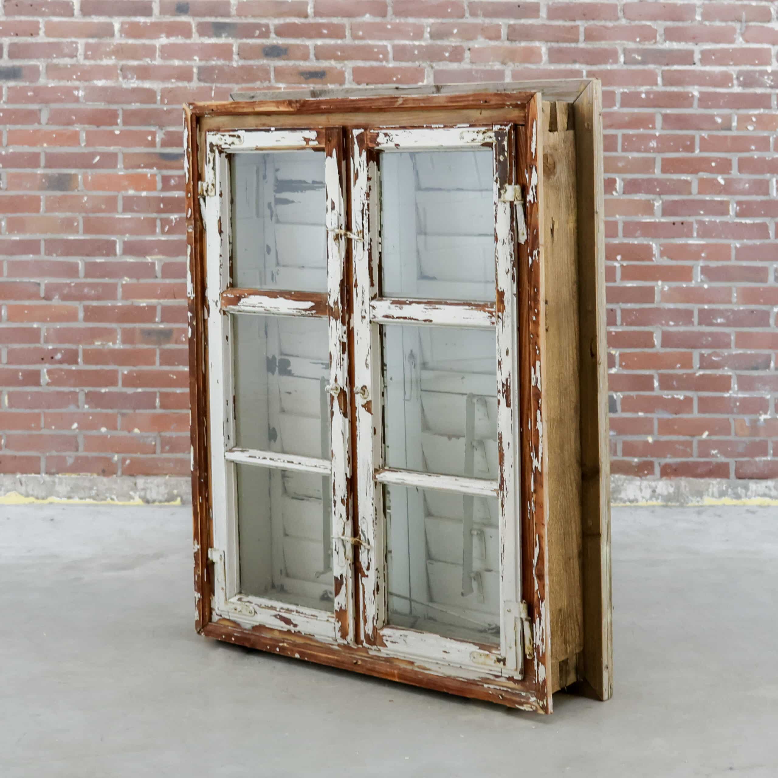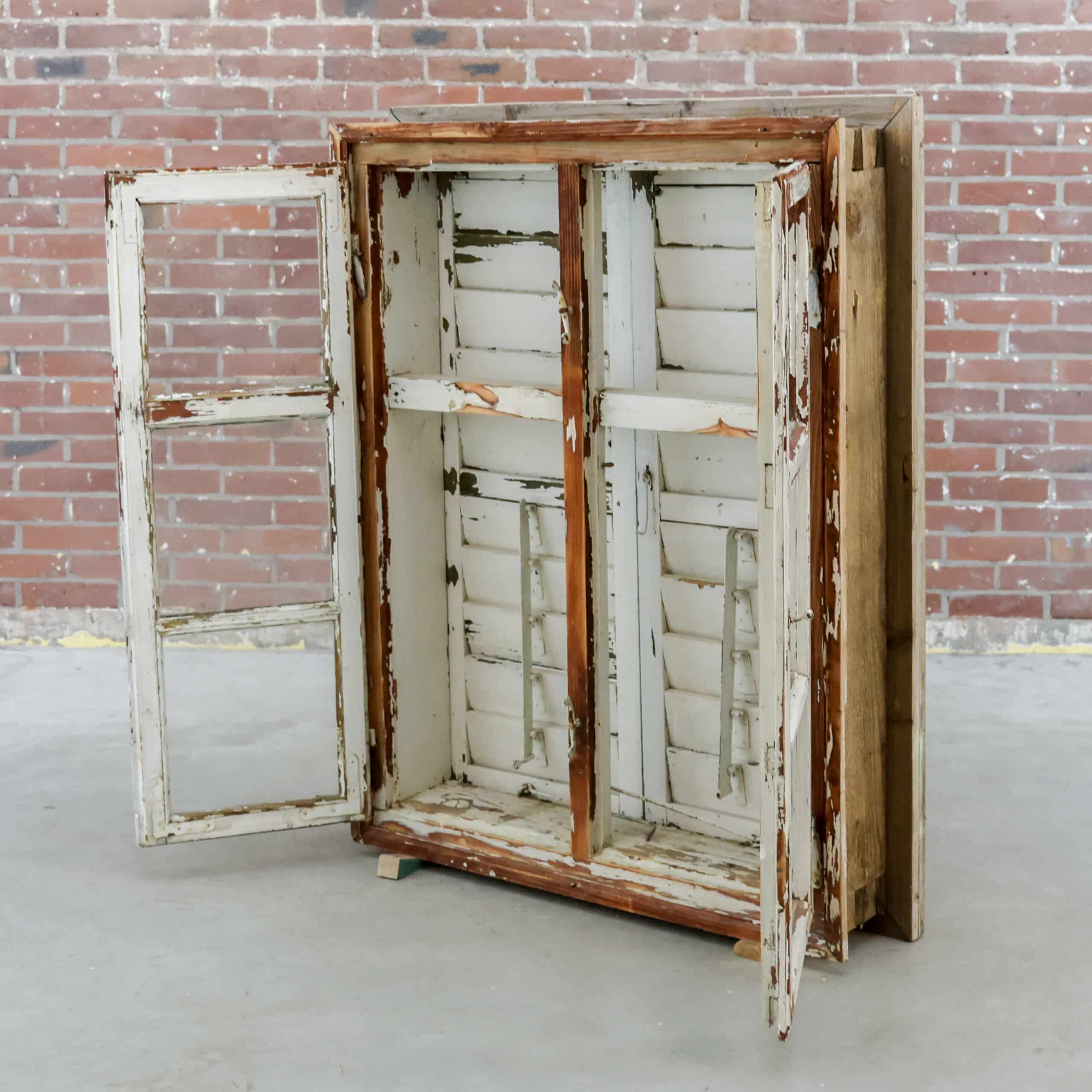 Pachtig brocante raamkozijn met originele luiken en glas, rijk aan karakter en een schitterende doorleefde verflaag in zachte crème- en aardetinten. De authentieke sluitingen, scharnieren en het verweerde hout geven dit stuk een stoere, landelijke uitstraling met een verhaal. Perfect als wanddecoratie of sfeervol element in een veranda of interieur met vintage ziel.