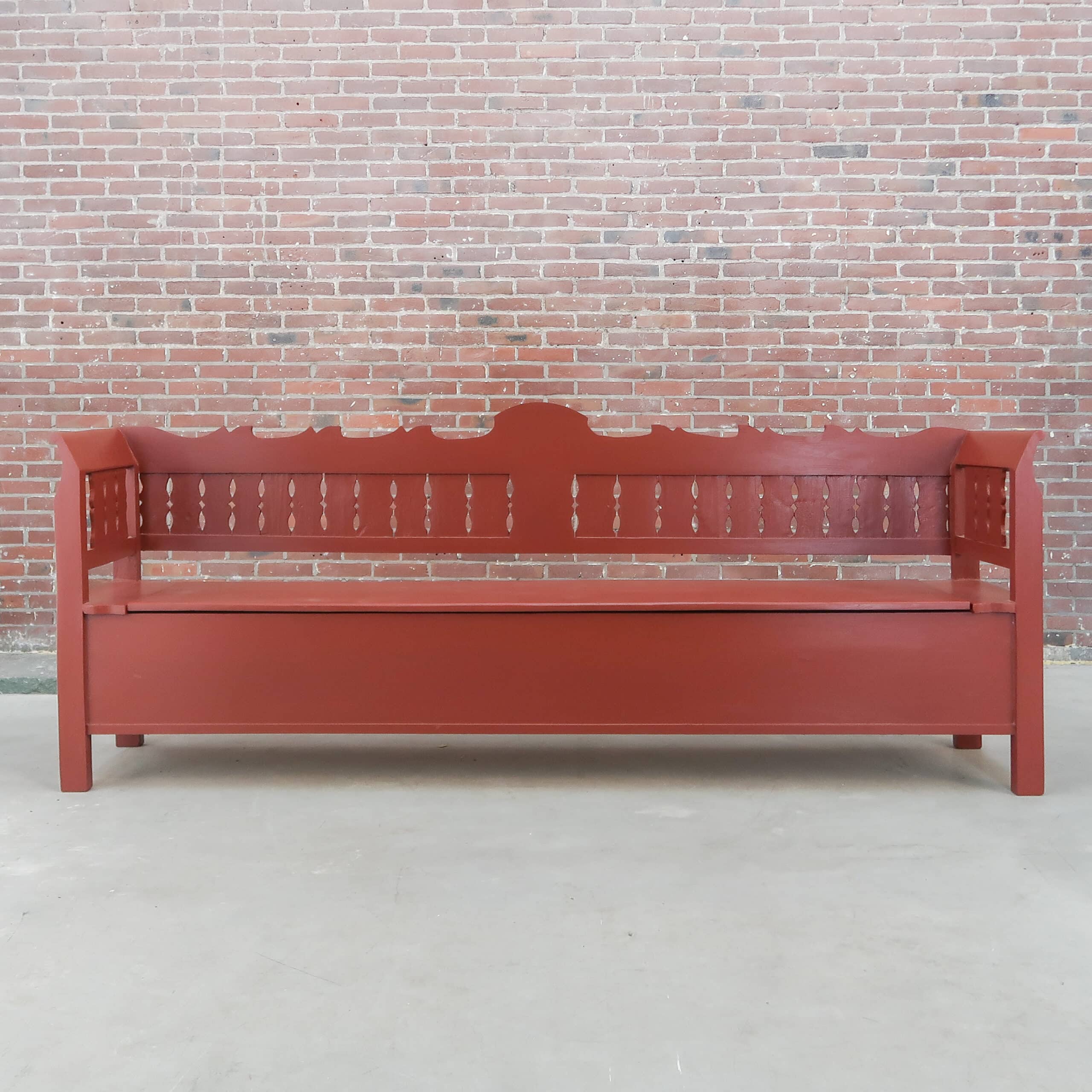 Mooie brocante klepbank die nu bij ons in de winkel staat. Hij heeft een prachtige rode kleur gekregen en die extra opbergruimte is altijd fijn!