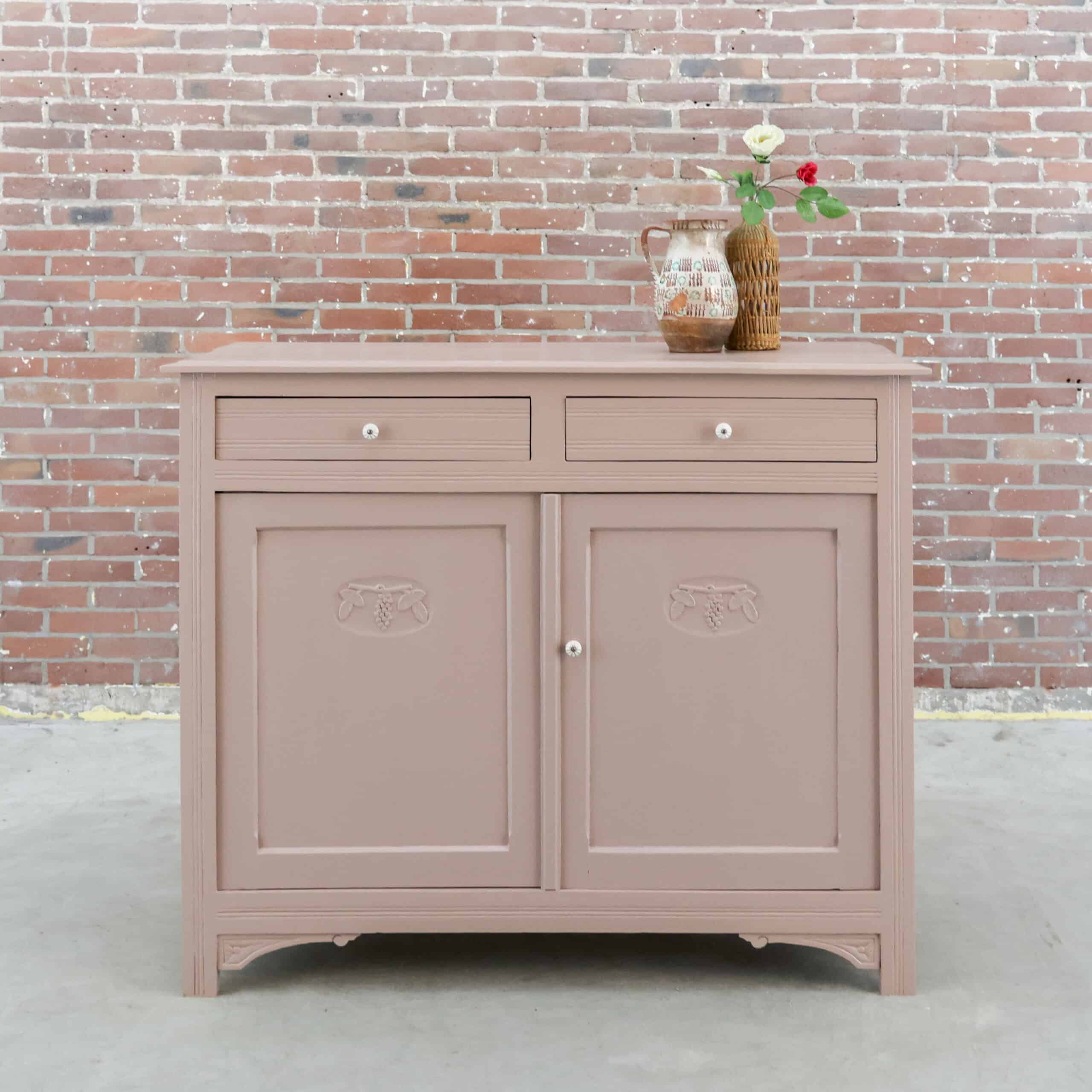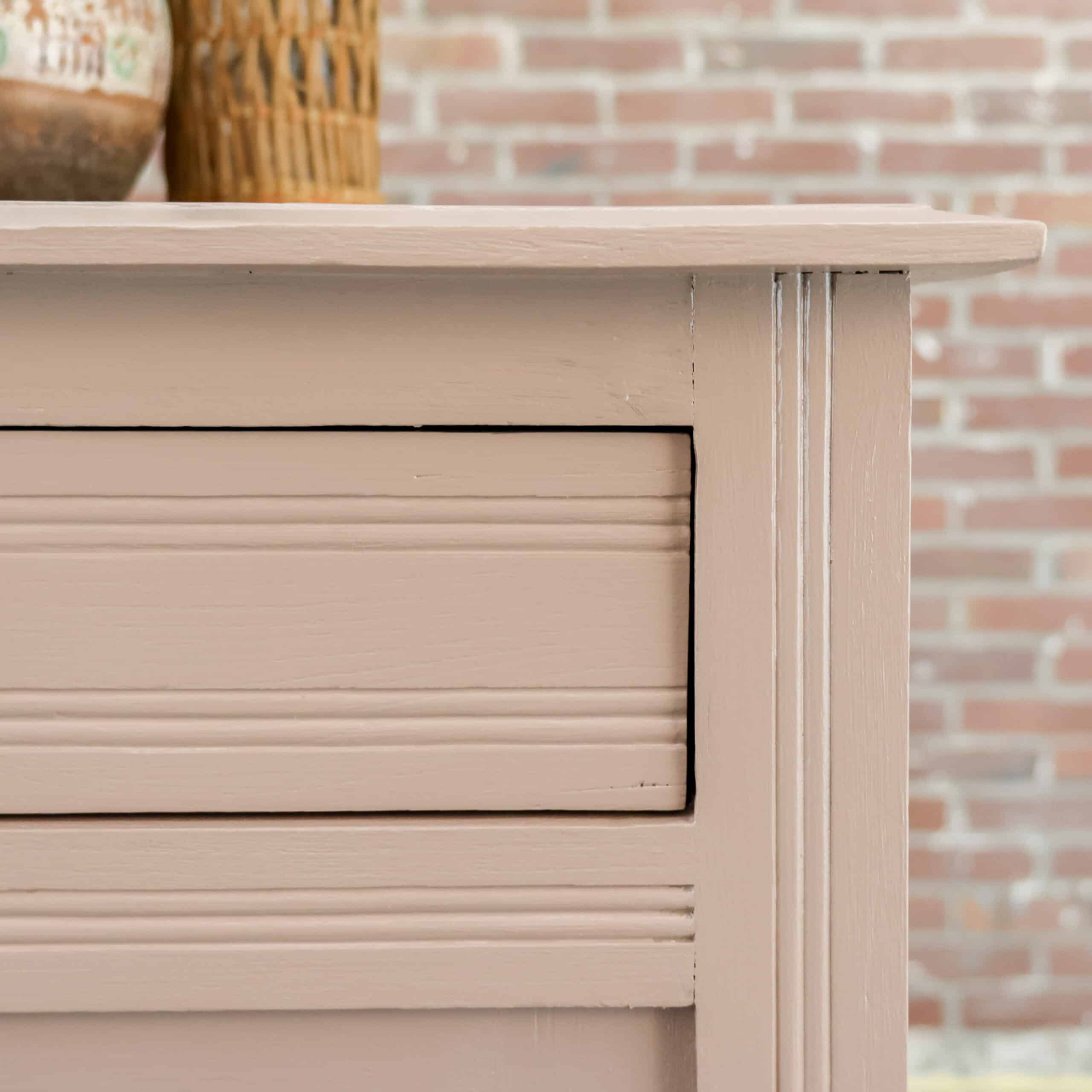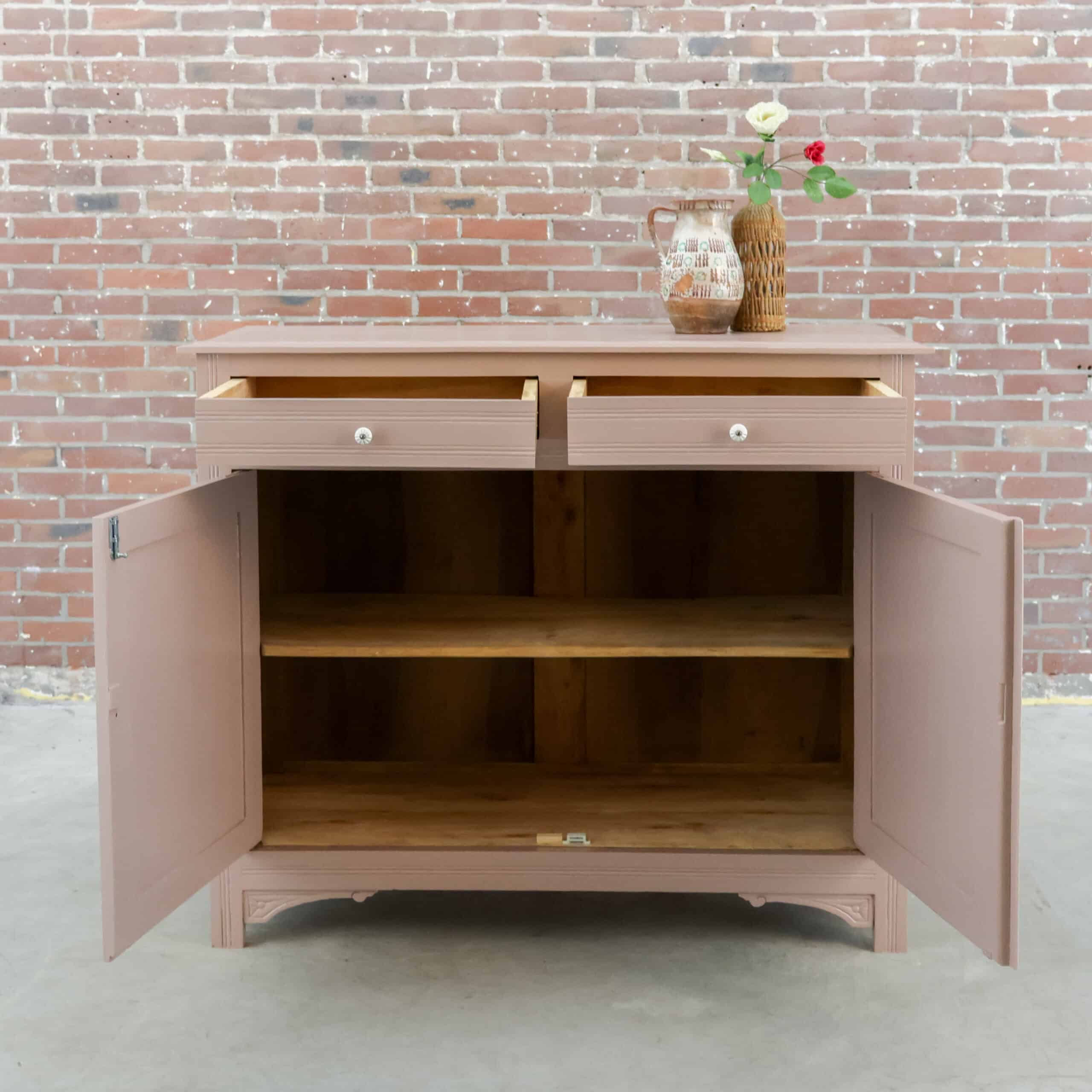 Leuk brocante dressoir met een mooie warme roze kleur! Het kastje heeft twee fijne lades en simpele klassieke look. Handig voor bijvoorbeeld een babykamer.