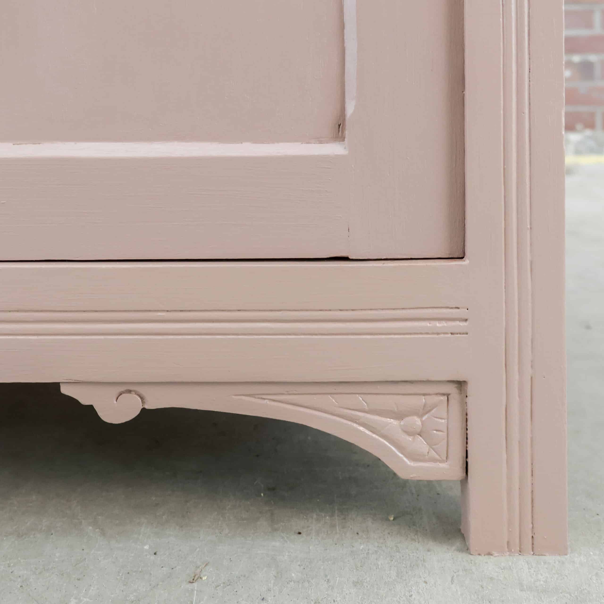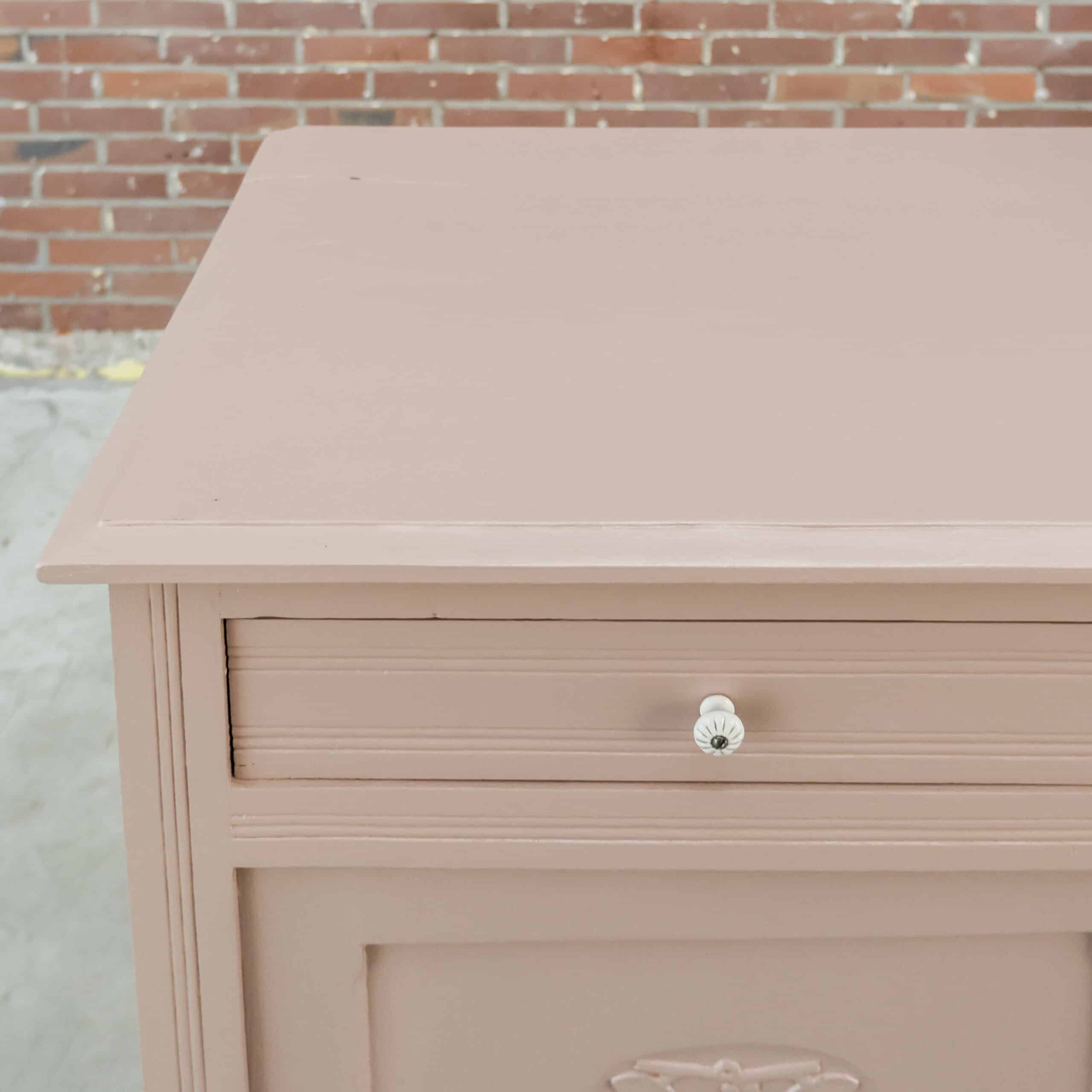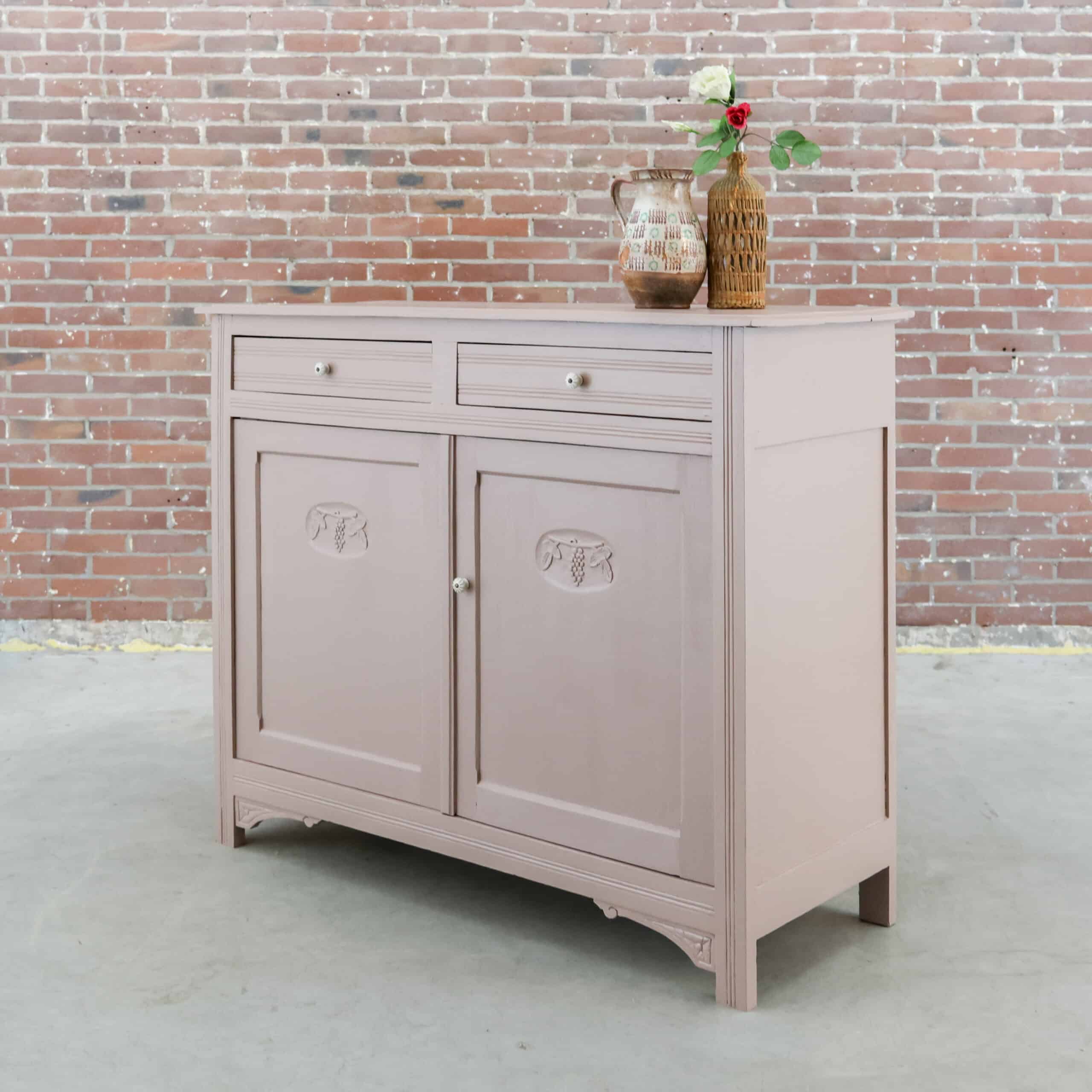 Leuk brocante dressoir met een mooie warme roze kleur! Het kastje heeft twee fijne lades en simpele klassieke look. Handig voor bijvoorbeeld een babykamer.