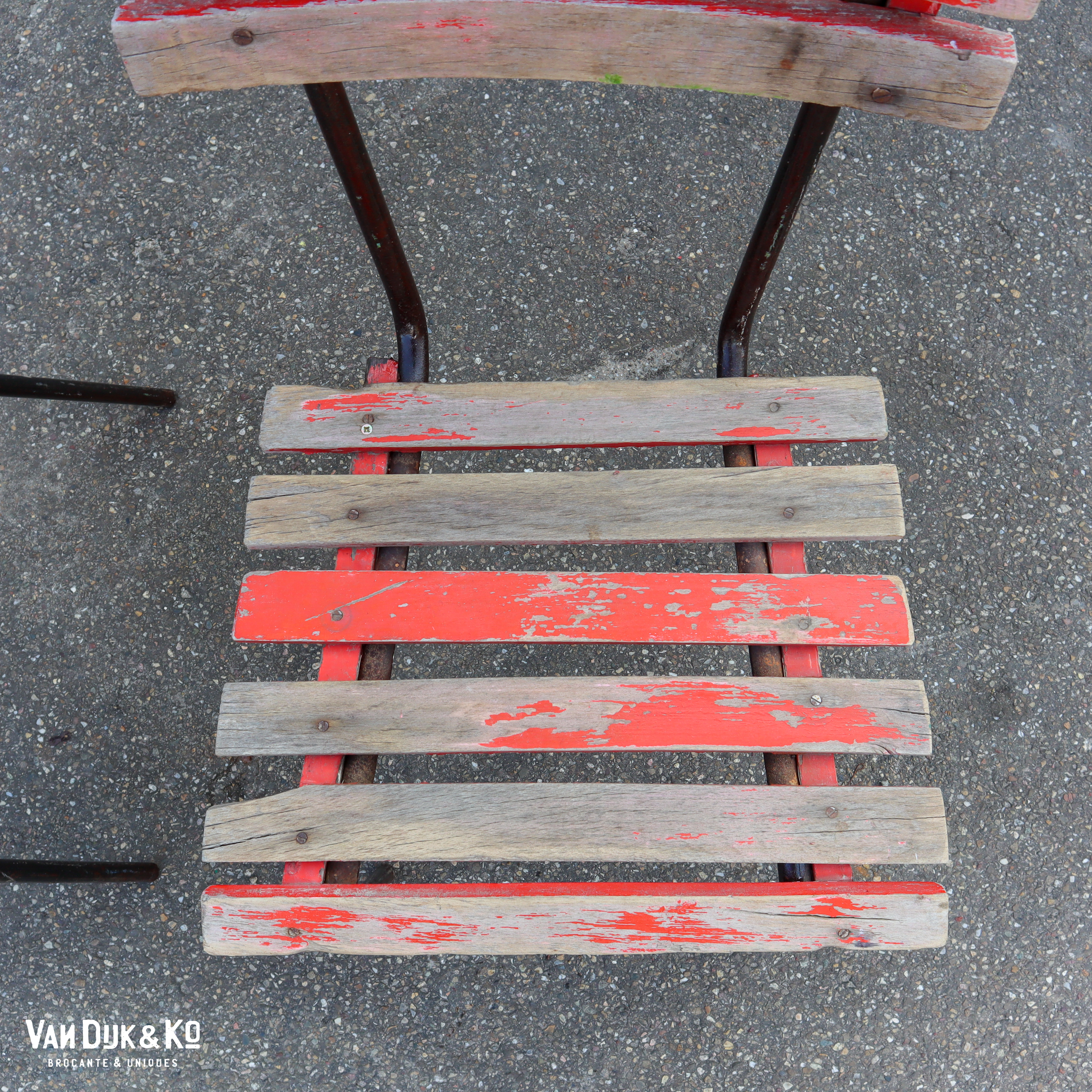 We hebben een aantal van deze rode tuinstoelen staan, die we verkopen in sets van 2. Het kan zijn dat de stoelen iets afwijken van de exemplaren die gefotografeerd zijn. De afmetingen zijn per stoel ca 40 x 50 x 75.