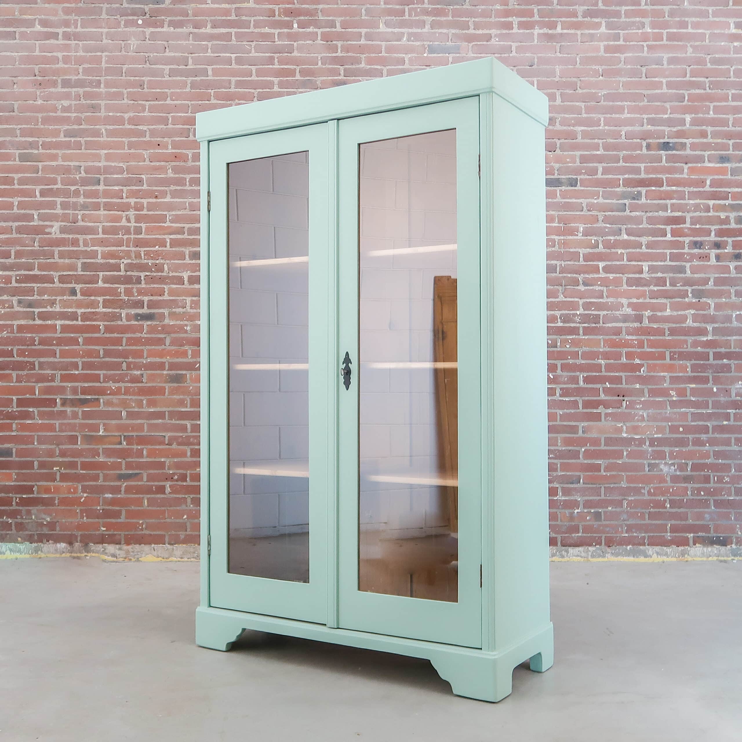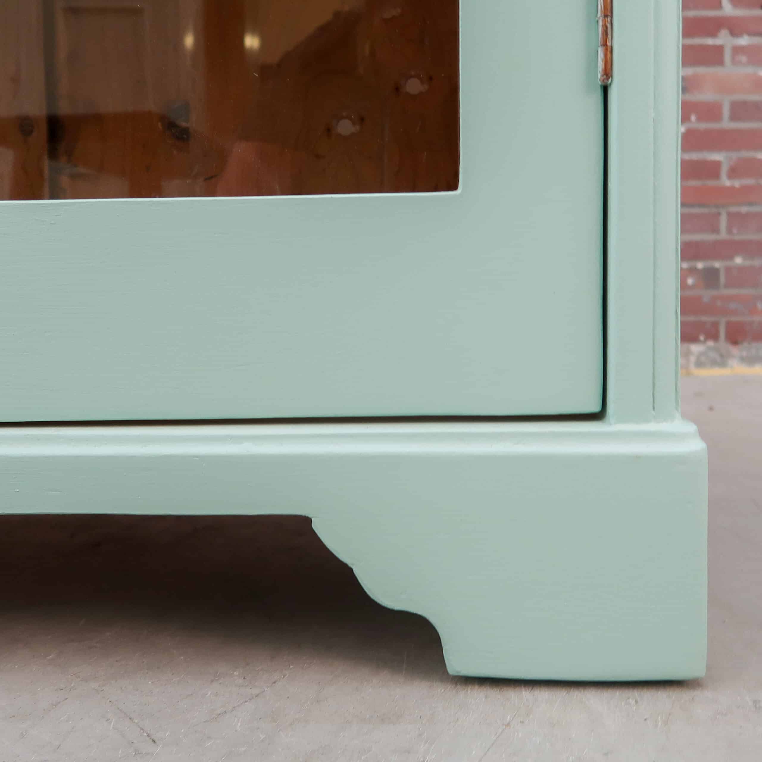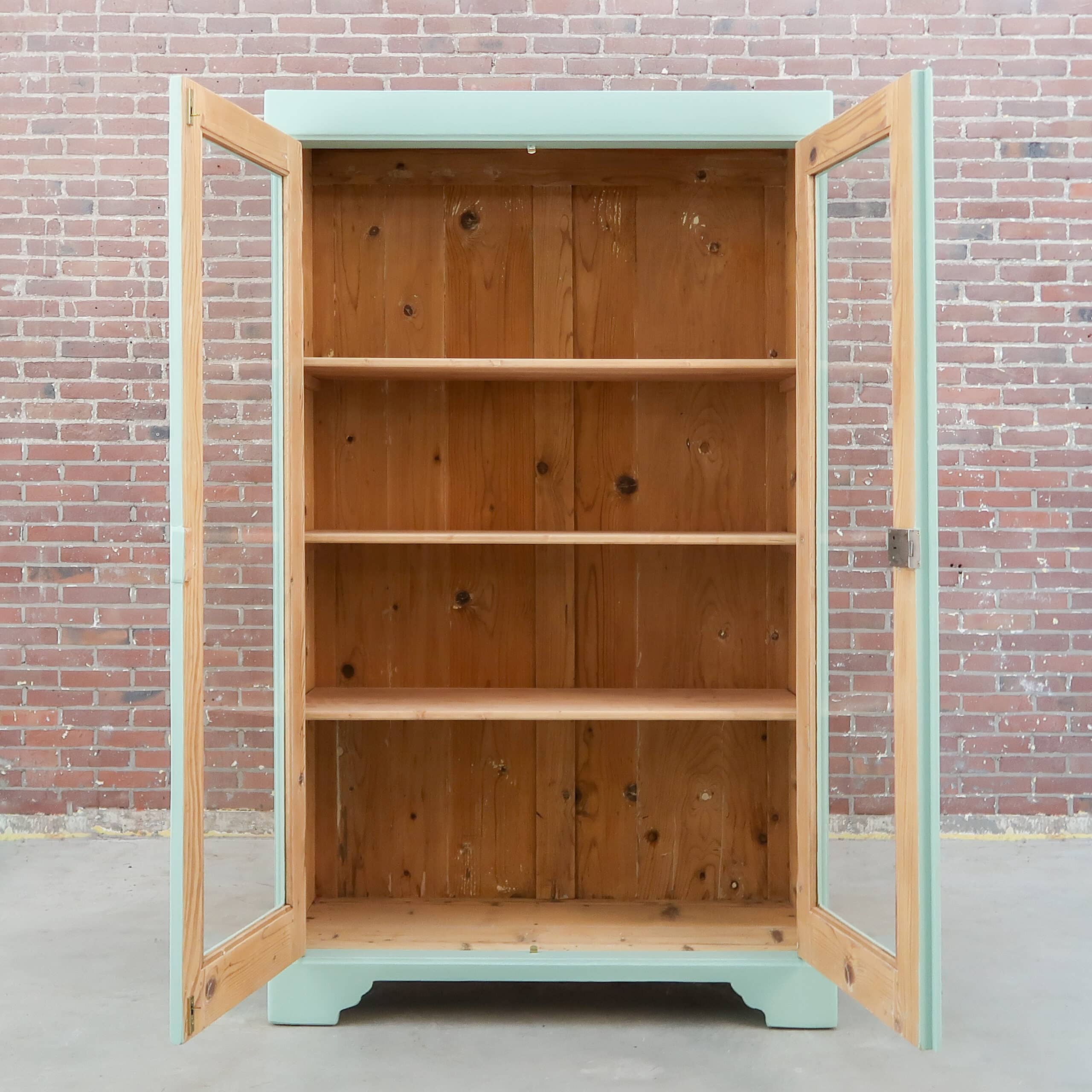 Deze brocante vitrinekast uit Hongarije is volledig opgeknapt en voorzien van een frisse mintkleur. De kast heeft nieuwe poten, planken en is verder met zorg gerestaureerd. Dankzij de glazen panelen is hij perfect om mooie items in tentoon te stellen. Een stijlvol en praktisch meubel met karakter.