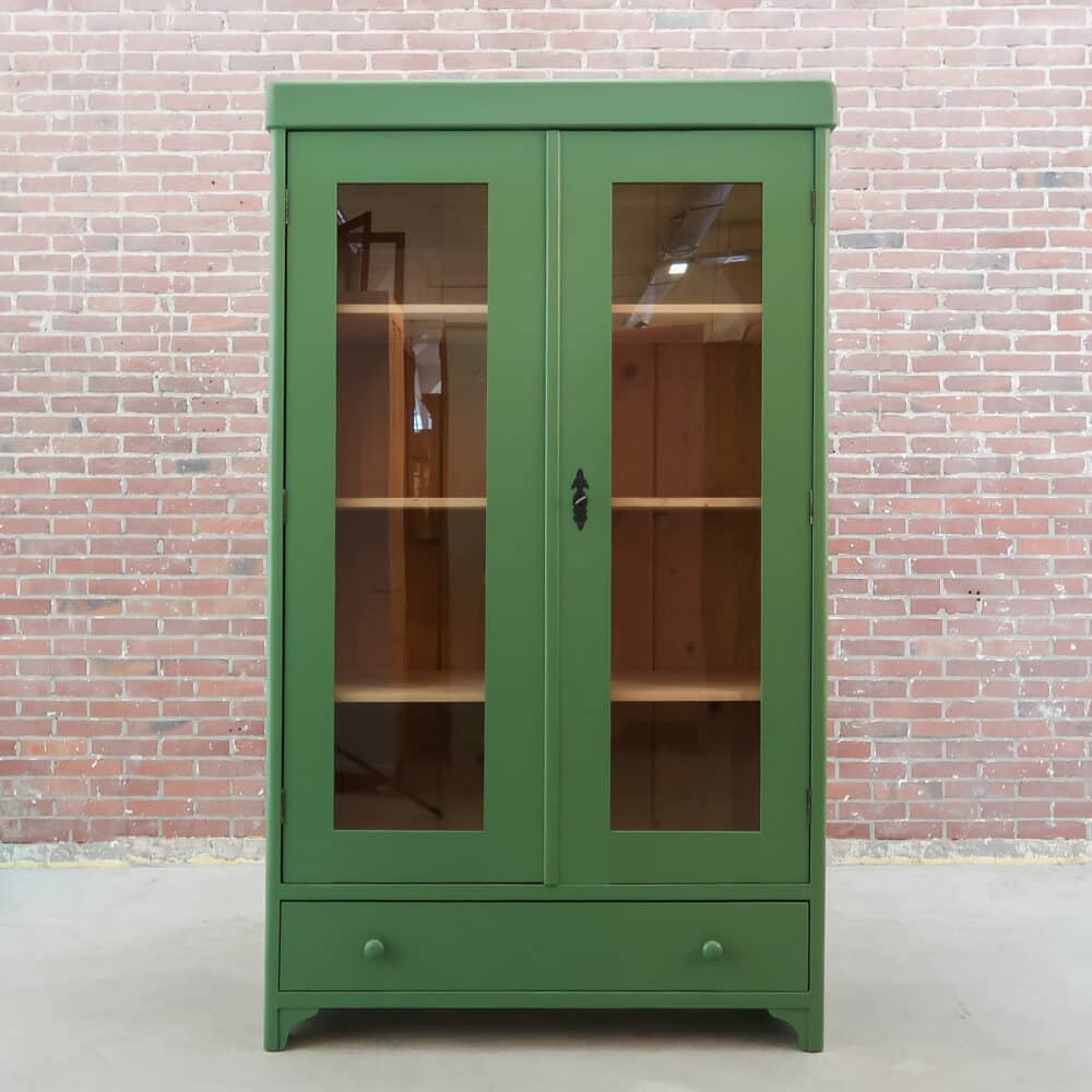 Deze mooie brocante vitrinekast komt uit Hongarije, waar we haar hebben opgespeurd én opgeknapt. Een prachtige en klassieke kast in een bijzondere kleur groen.