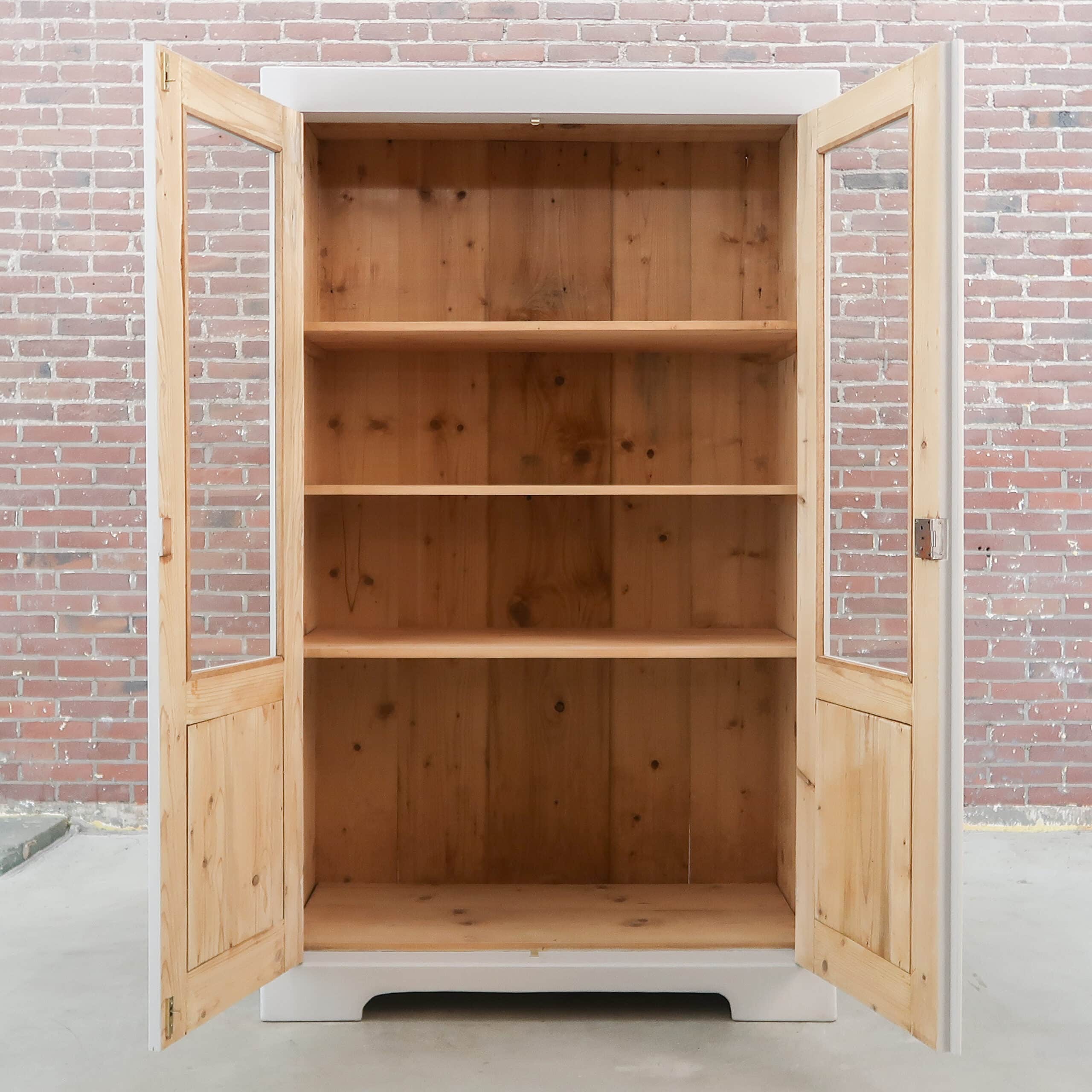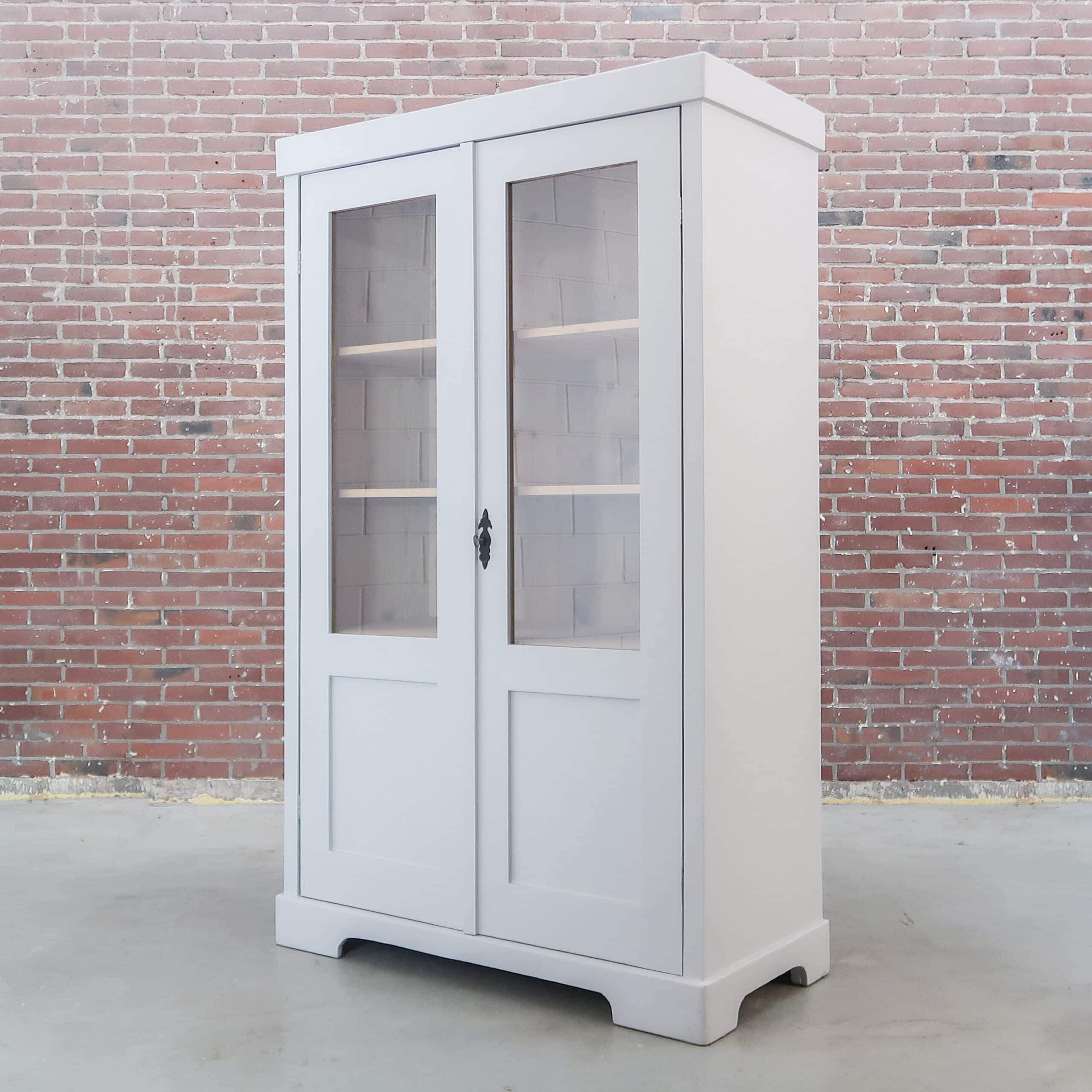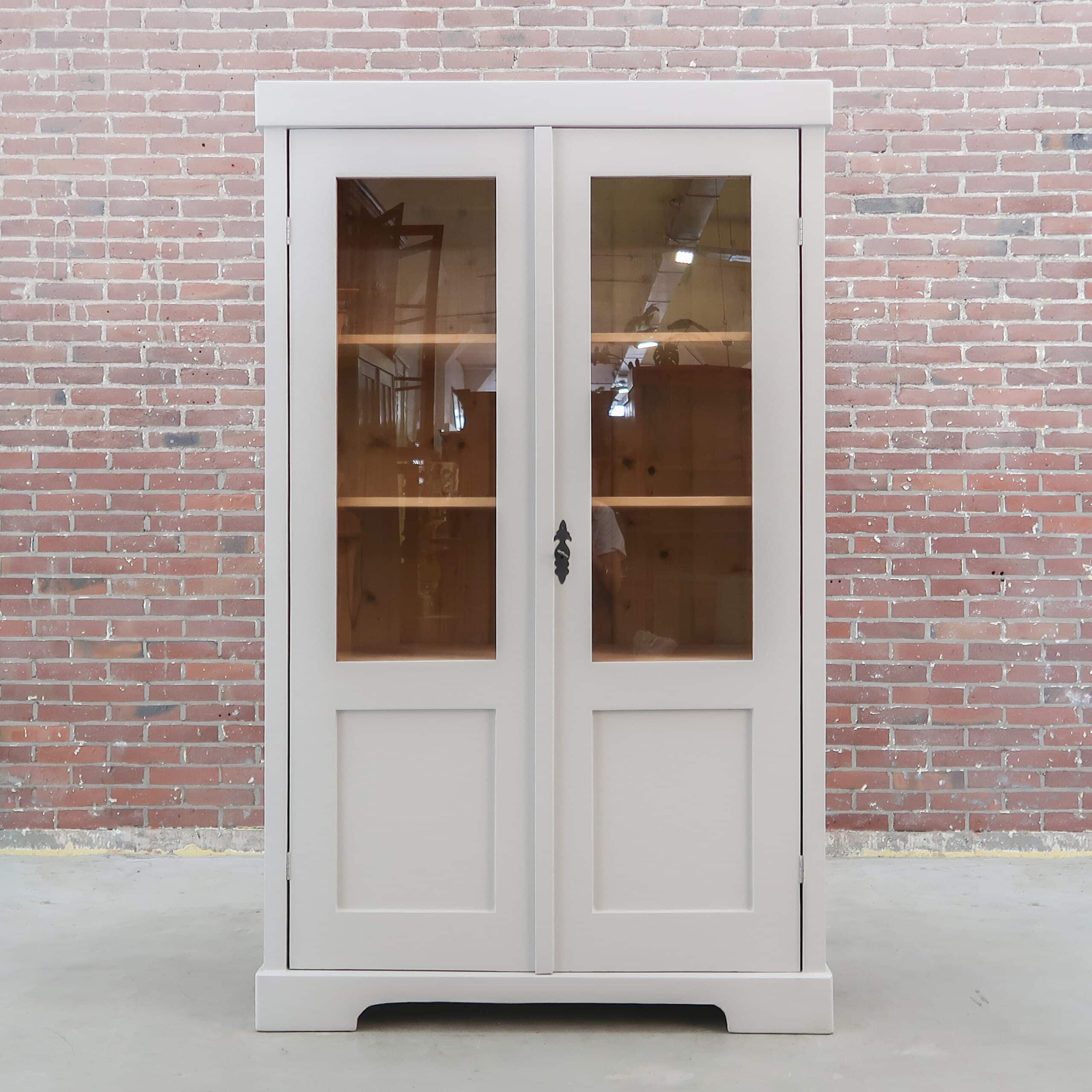 Mooi, deze brocante vitrinekast uit Hongarije! We hebben deze oude dame opgeknapt waar nodig, zo heeft ze oa drie nieuwe planken, glas en een zacht grijs kleurtje gekregen.