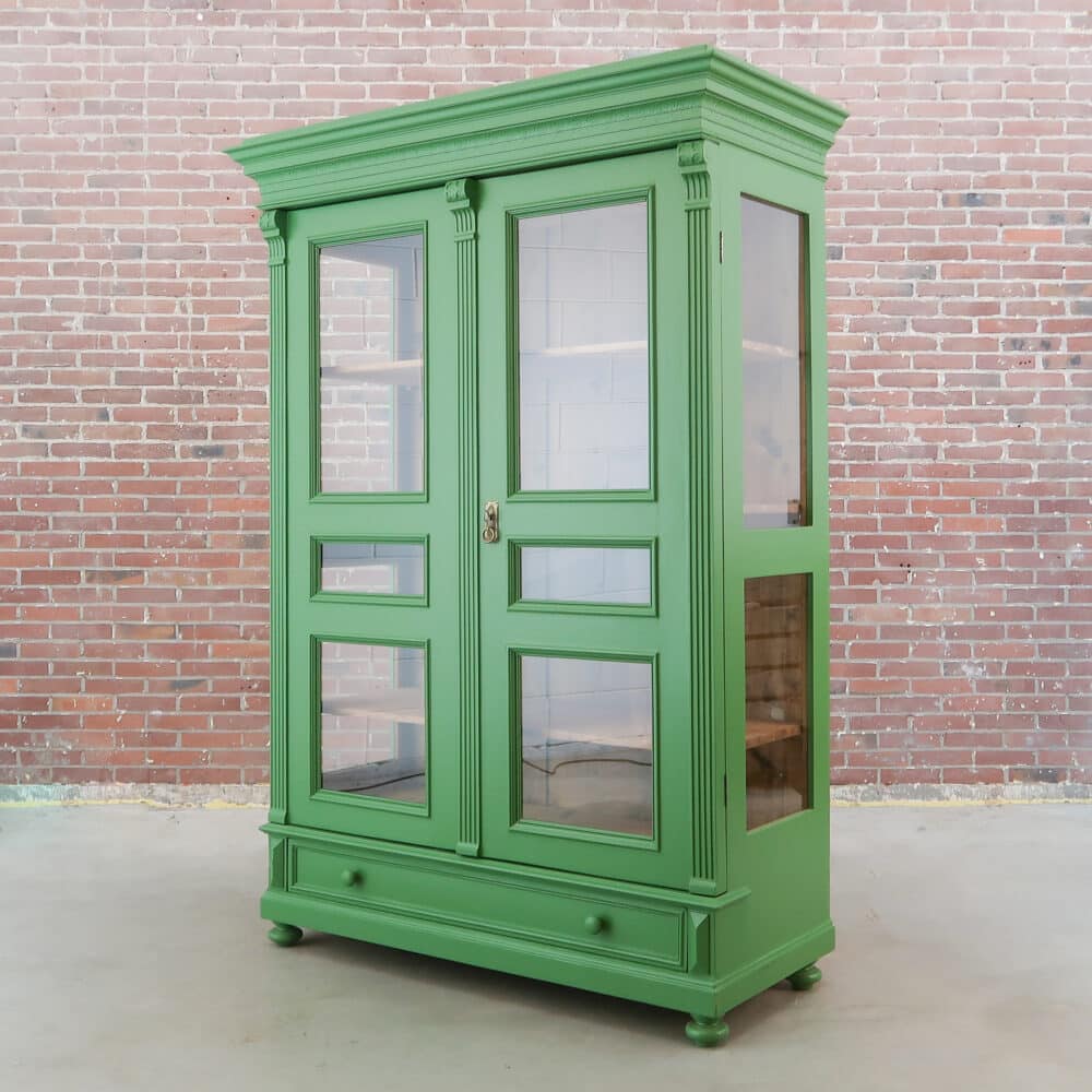 Deze mooie brocante vitrinekast komt uit Hongarije, waar we haar hebben opgespeurd én opgeknapt. Een prachtige en klassieke kast in een bijzondere kleur groen.