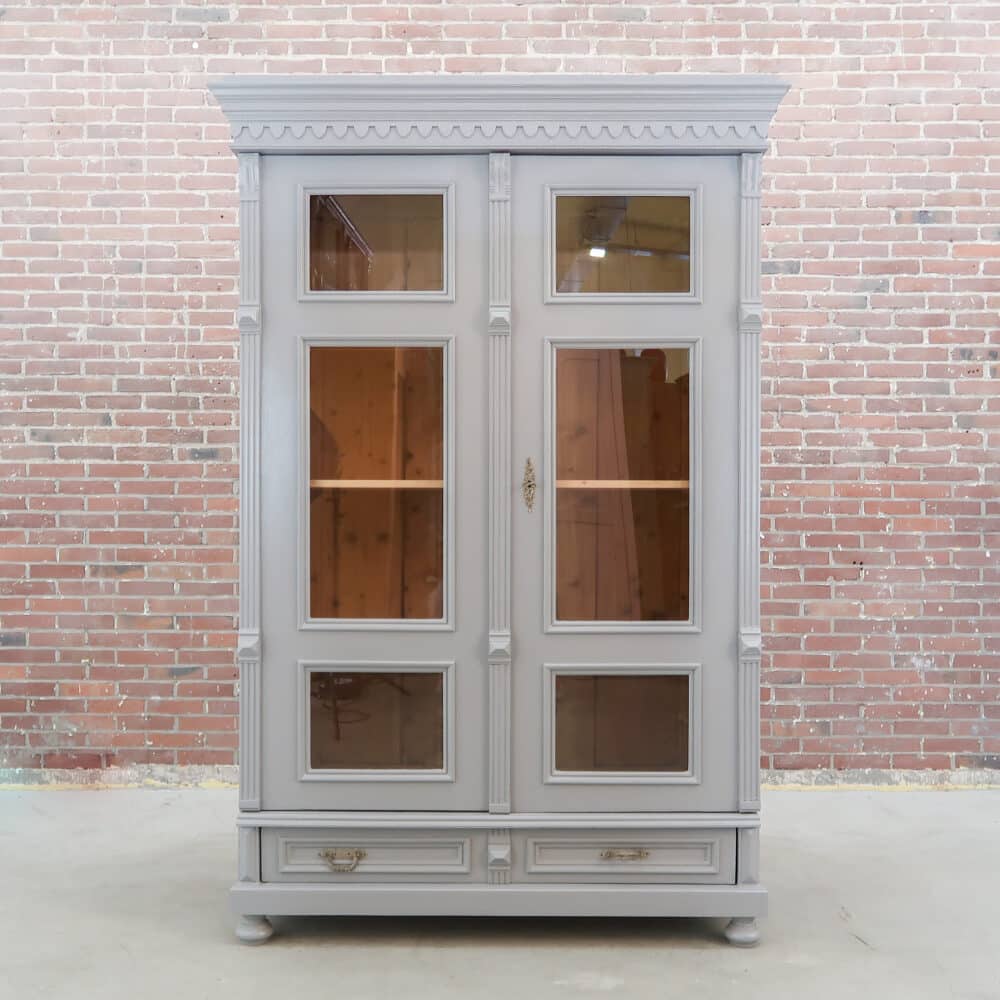 Mooi, deze brocante vitrinekast uit Hongarije! We hebben deze oude dame opgeknapt waar nodig, zo heeft ze oa drie nieuwe planken, glas en een zacht grijs kleurtje gekregen.