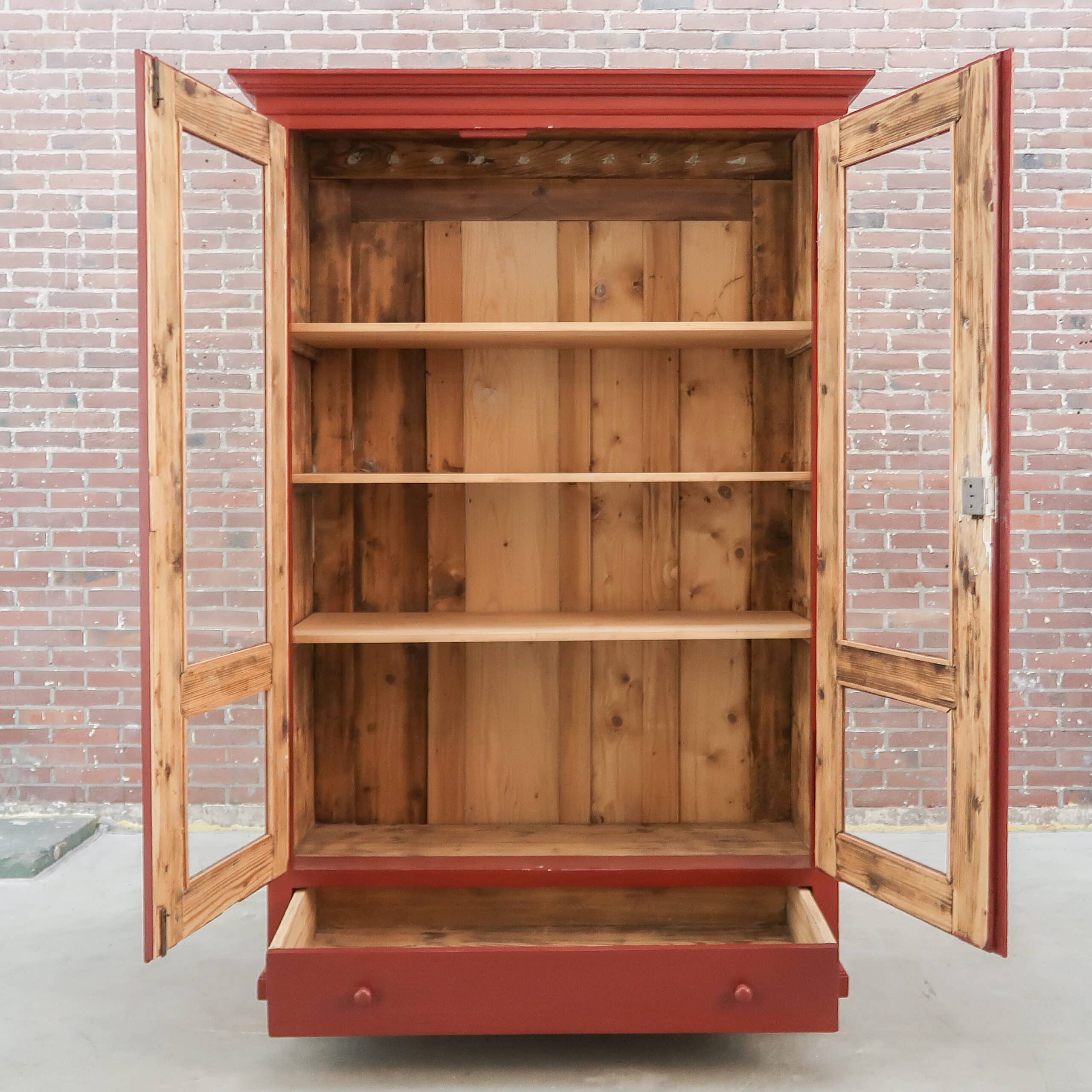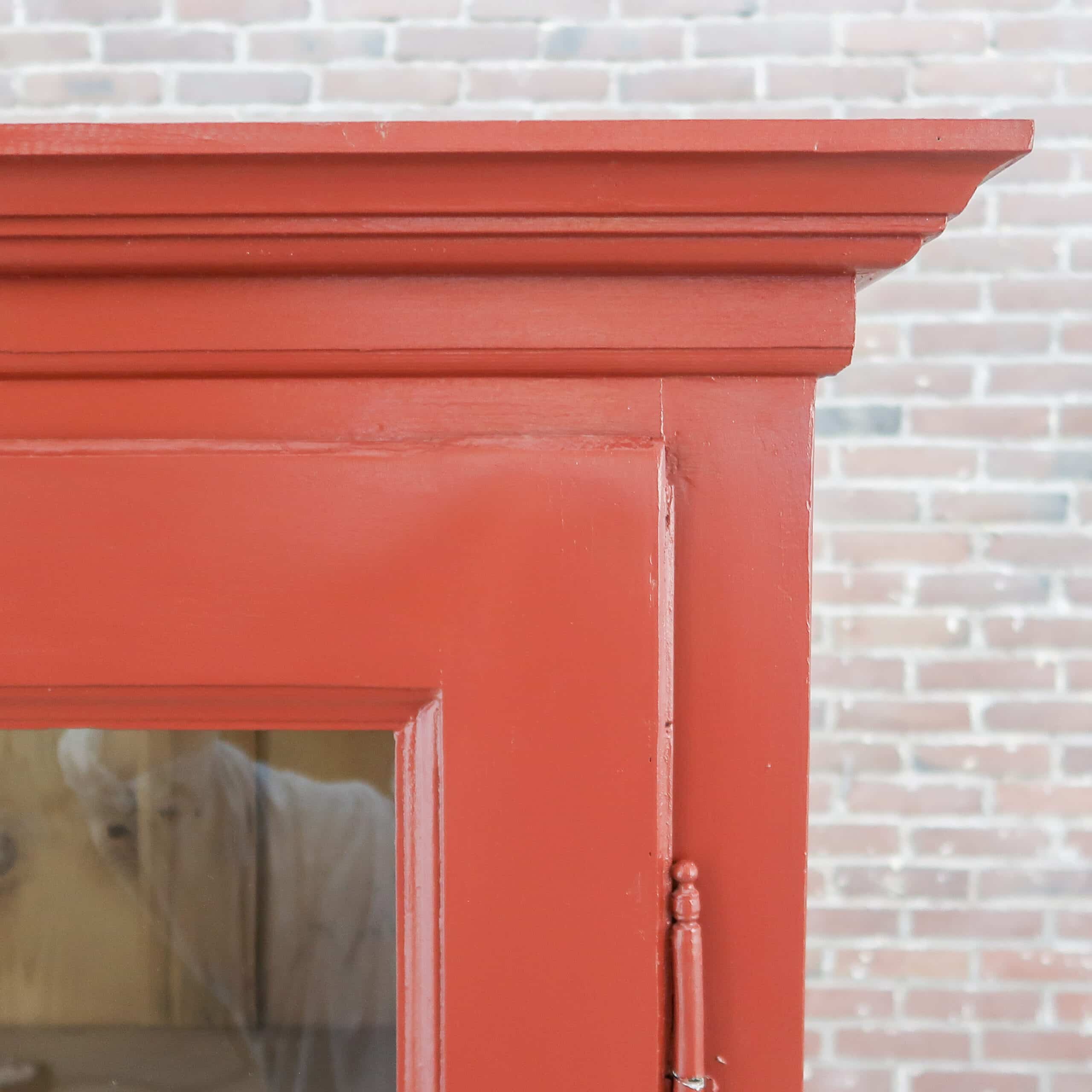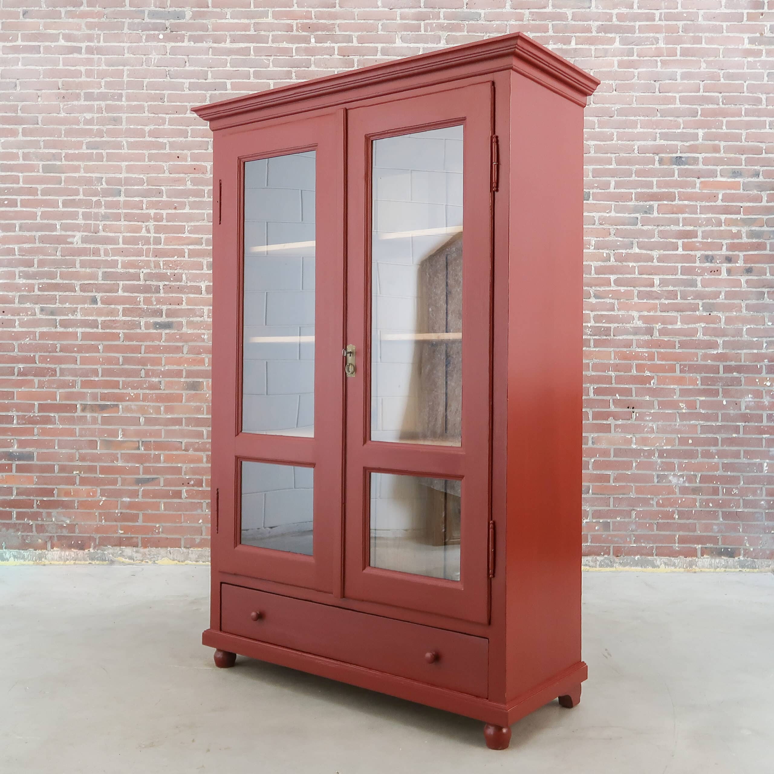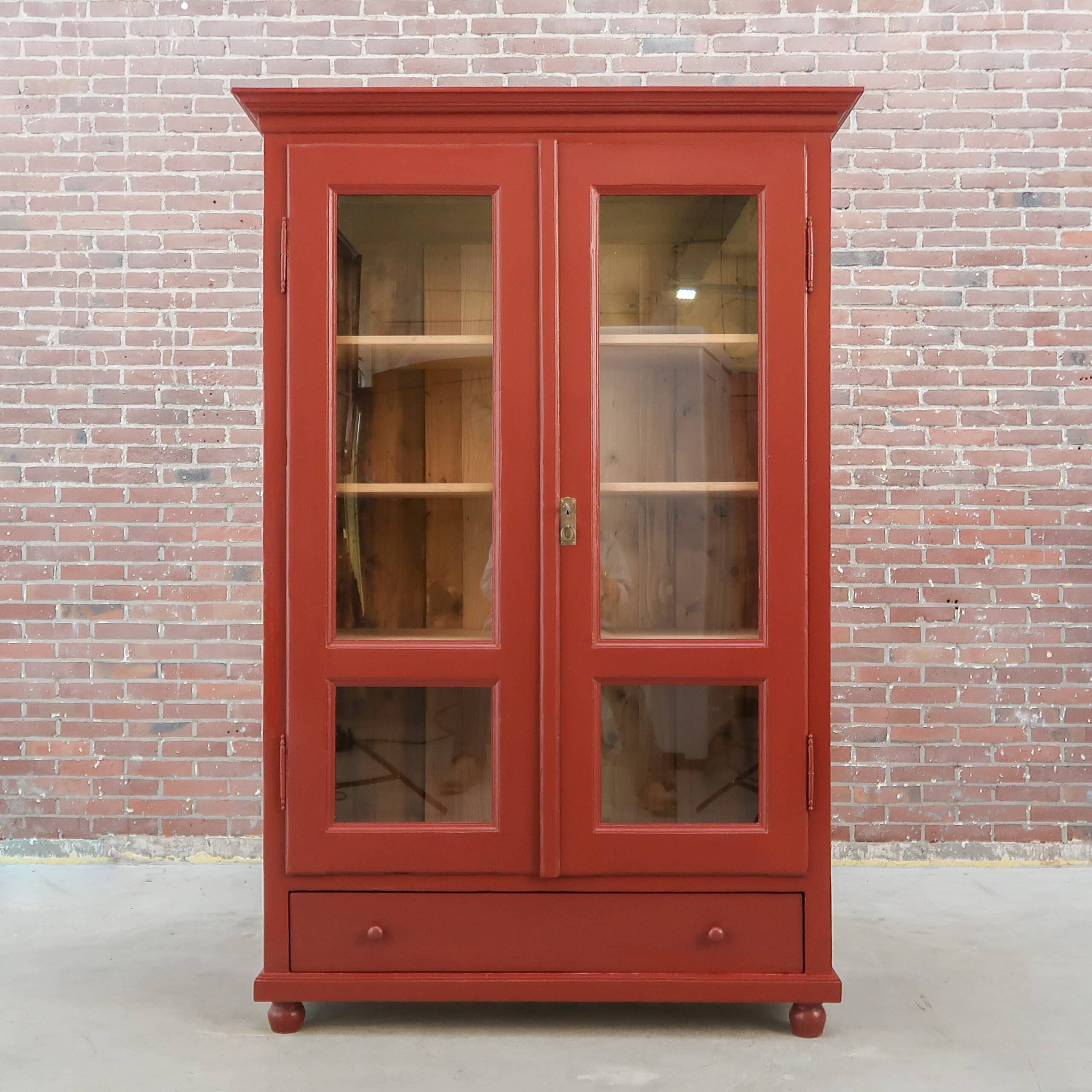 Mooi, deze brocante vitrinekast uit Hongarije! We hebben deze oude dame opgeknapt waar nodig, zo heeft ze oa drie nieuwe planken en een fijn rood kleurtje gekregen. Klaar voor een nieuw leven!