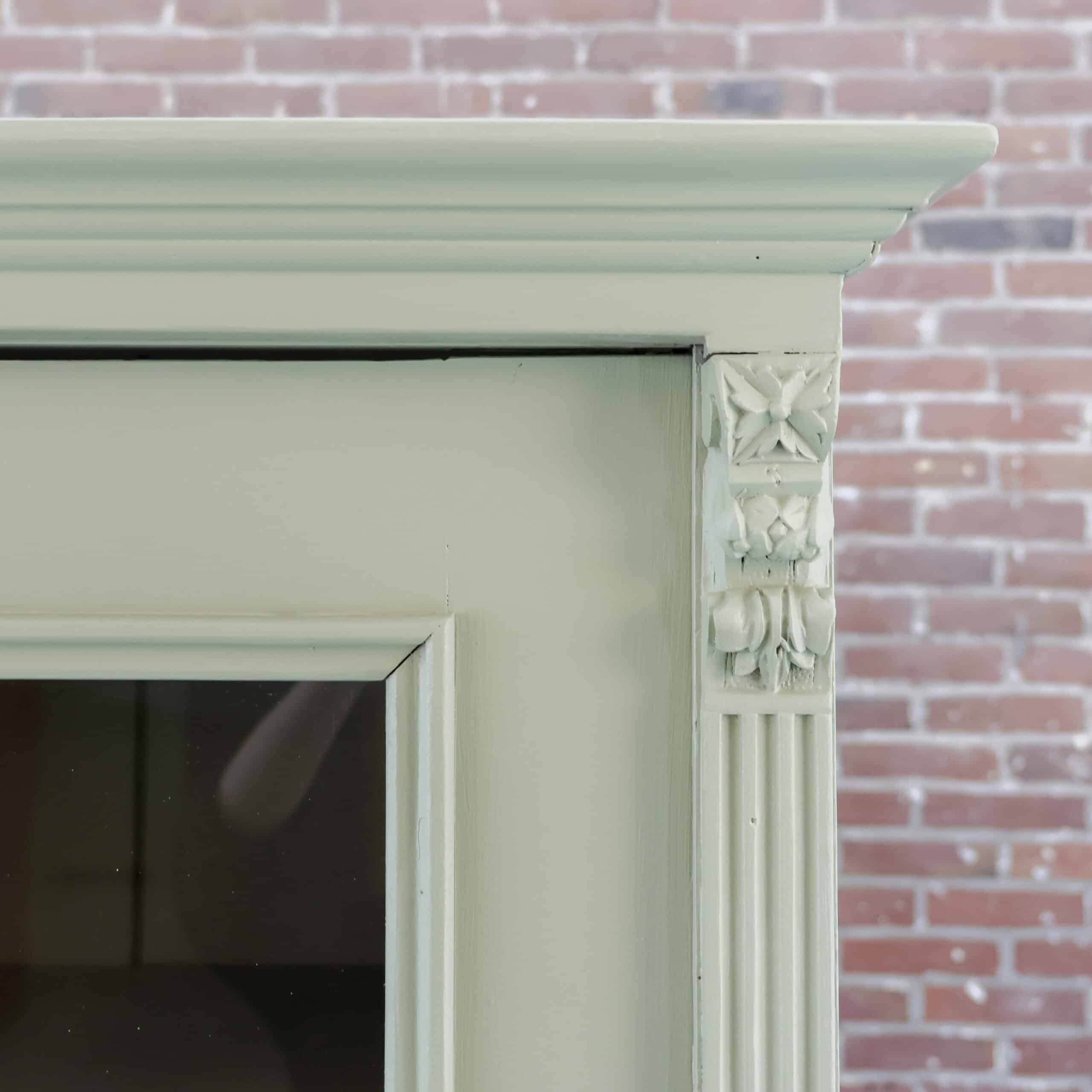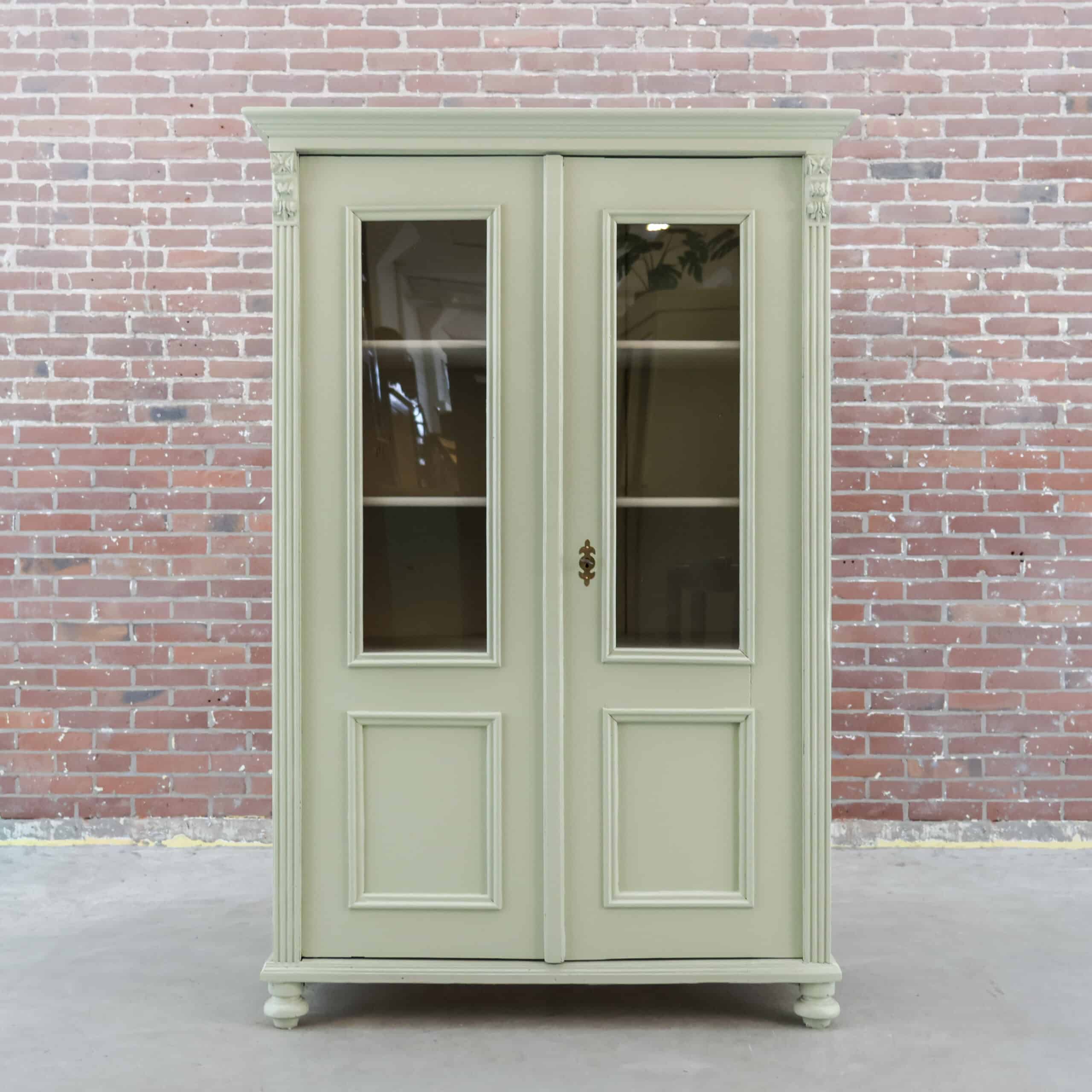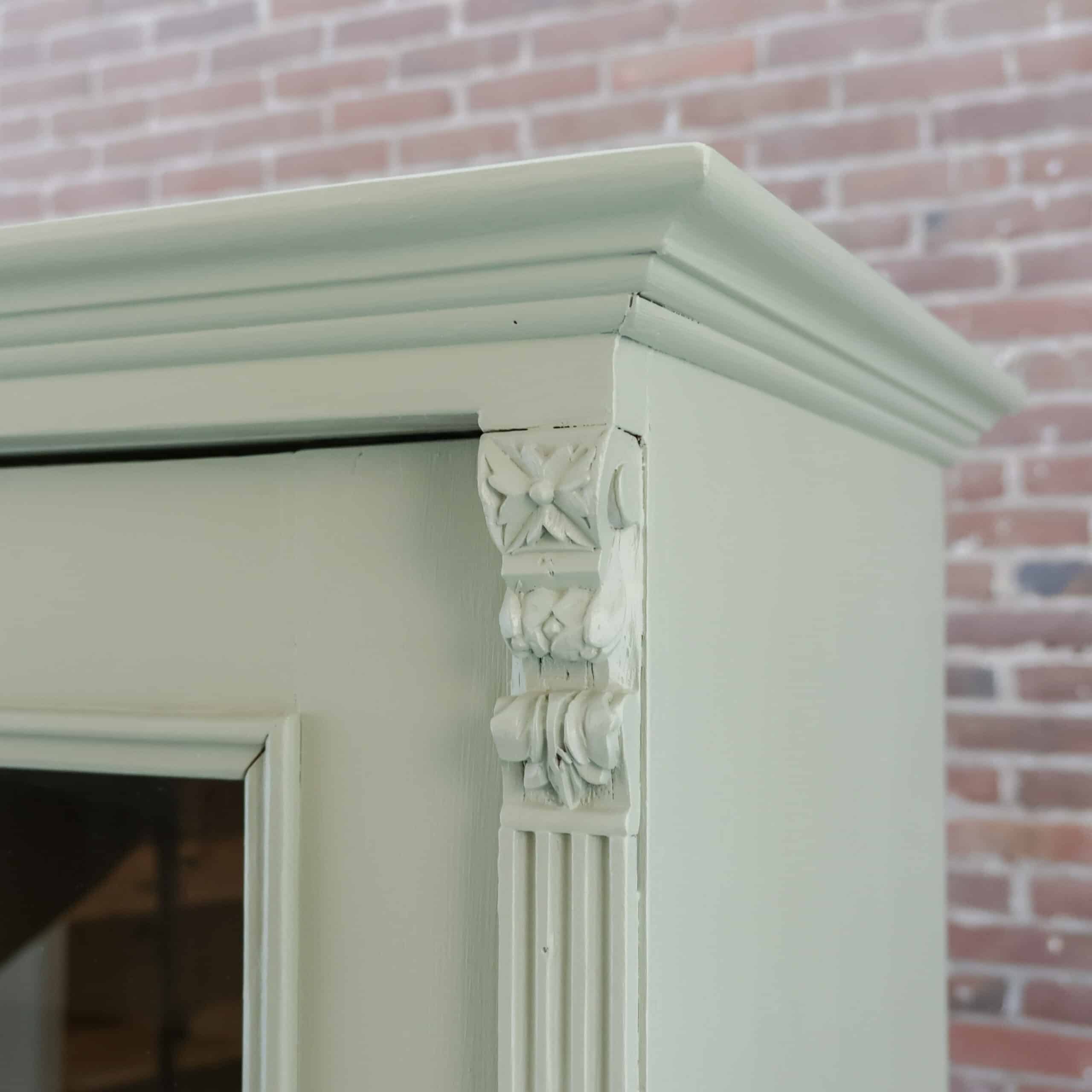 Deze mooie brocante vitrinekast komt uit Hongarije, waar we haar hebben opgespeurd én opgeknapt. Een prachtige en klassieke kast in een bijzondere kleur groen met subtiel houtsnijwerk in de kap.