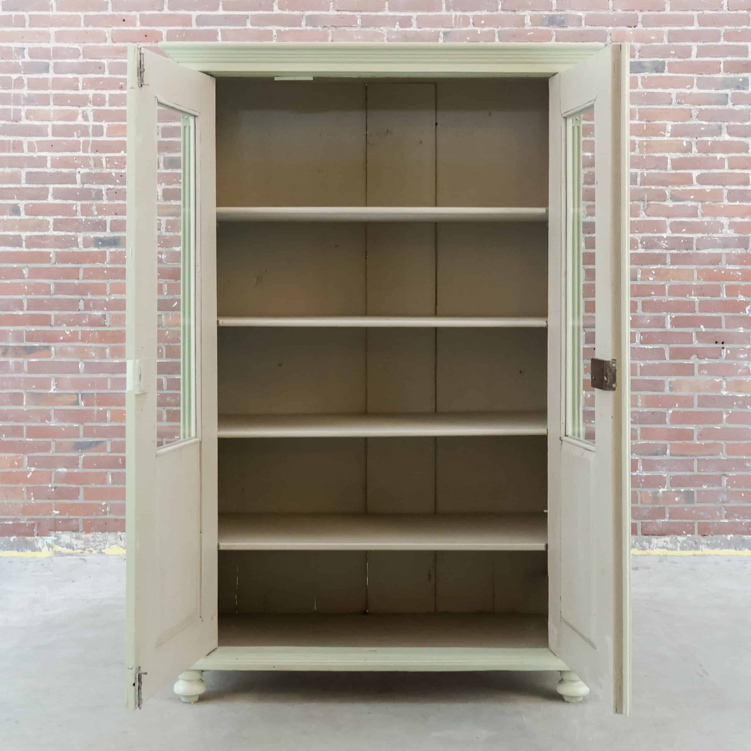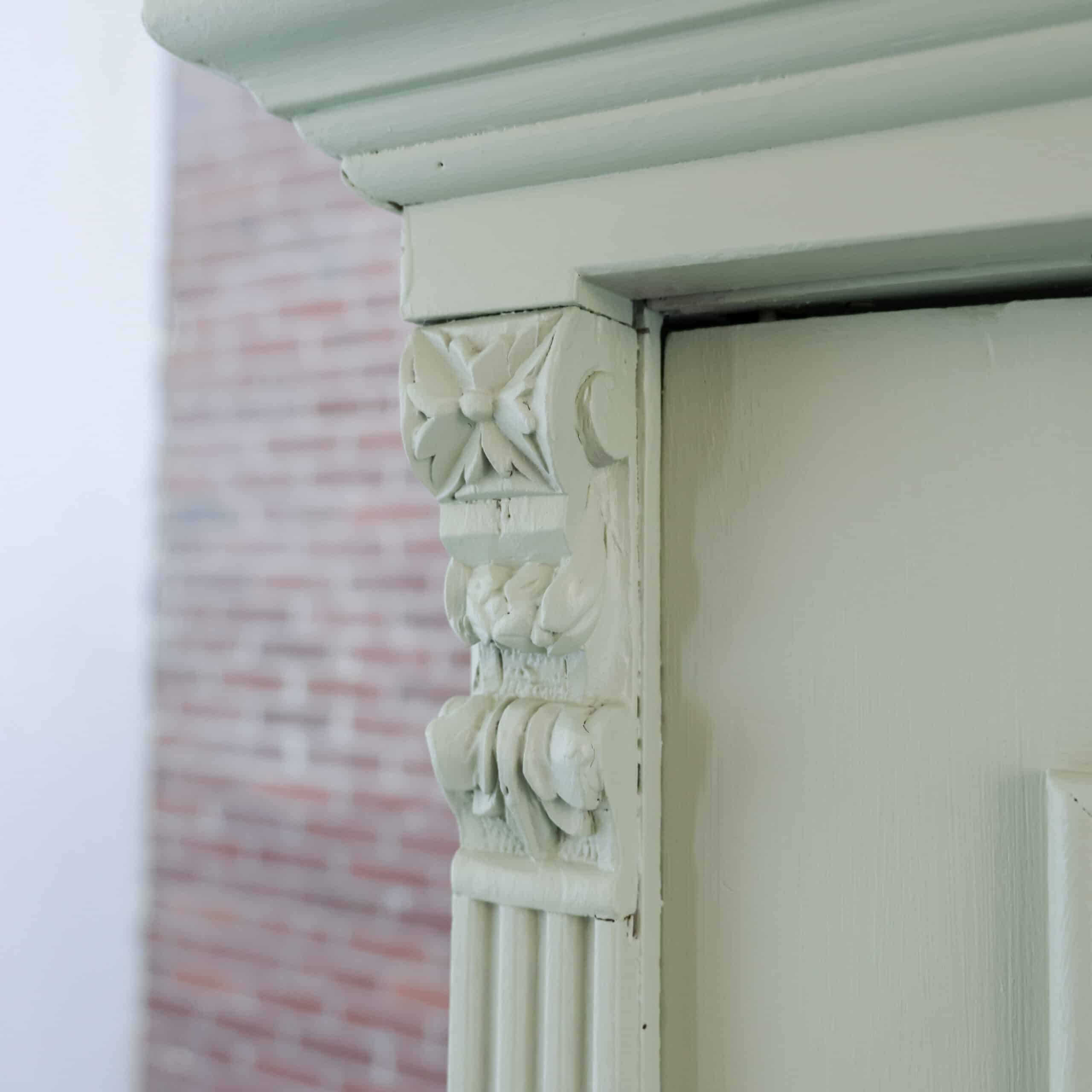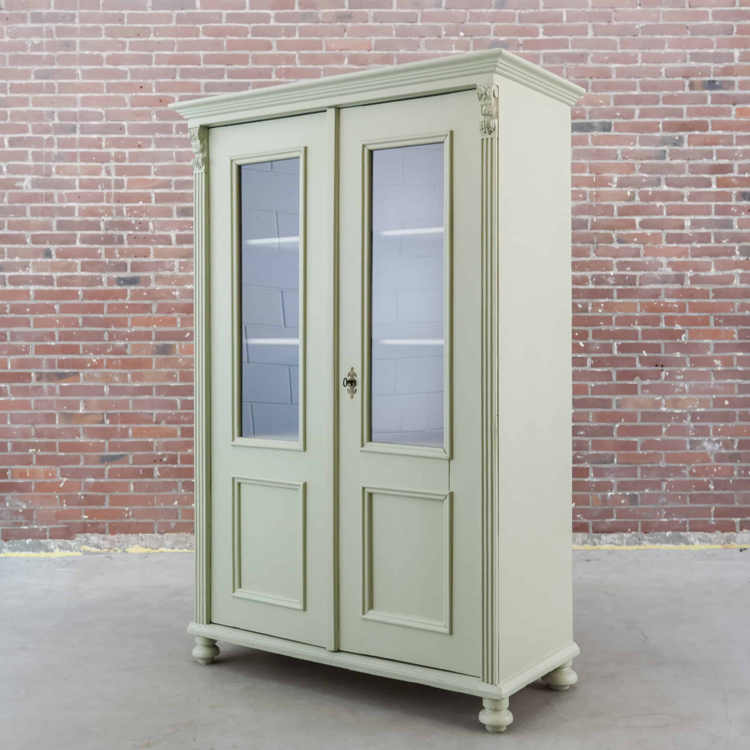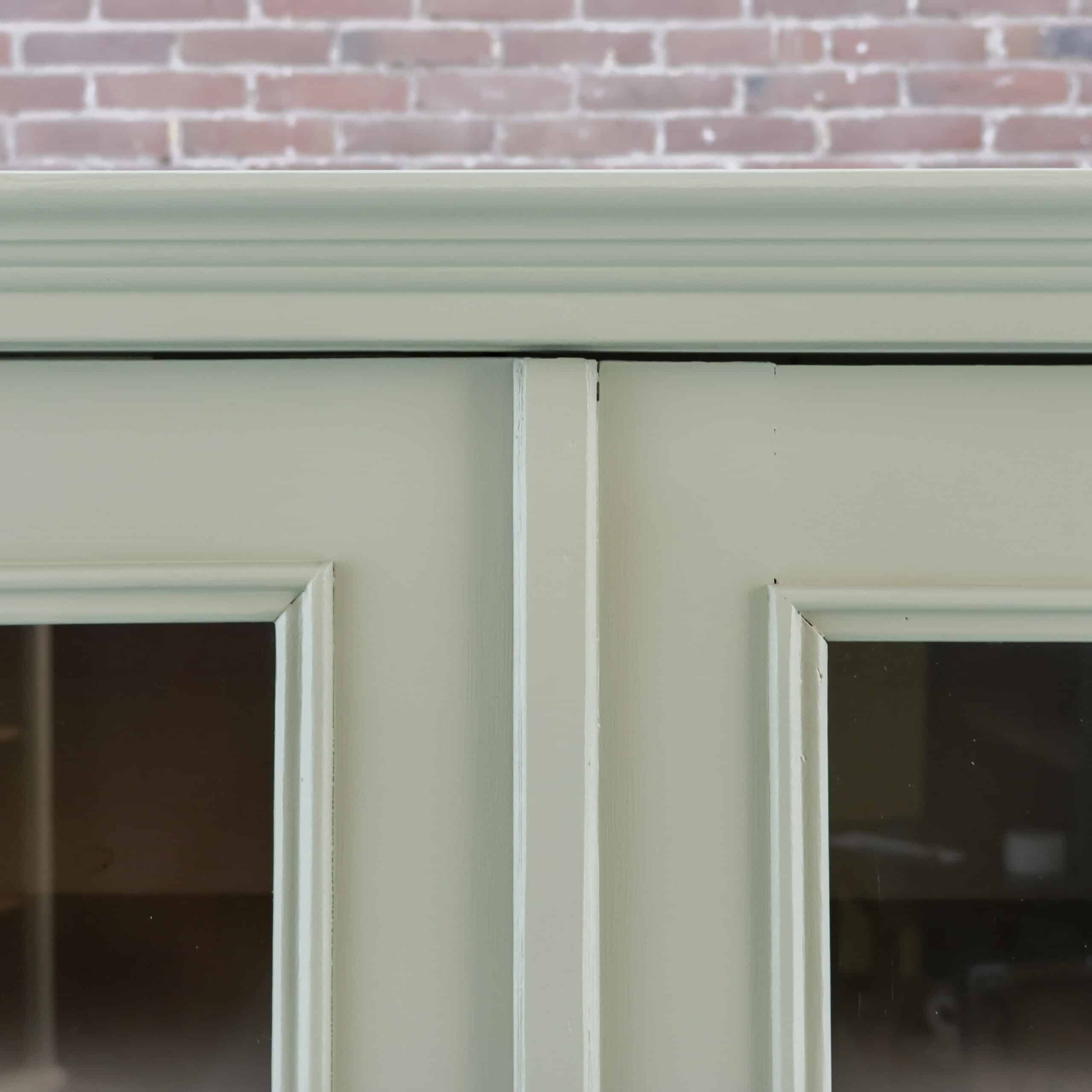 Deze mooie brocante vitrinekast komt uit Hongarije, waar we haar hebben opgespeurd én opgeknapt. Een prachtige en klassieke kast in een bijzondere kleur groen met subtiel houtsnijwerk in de kap.