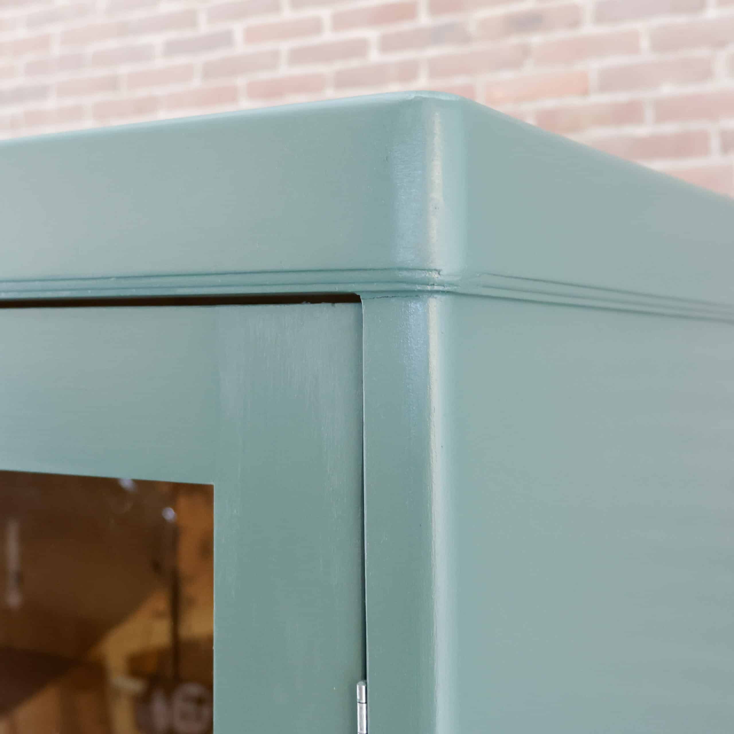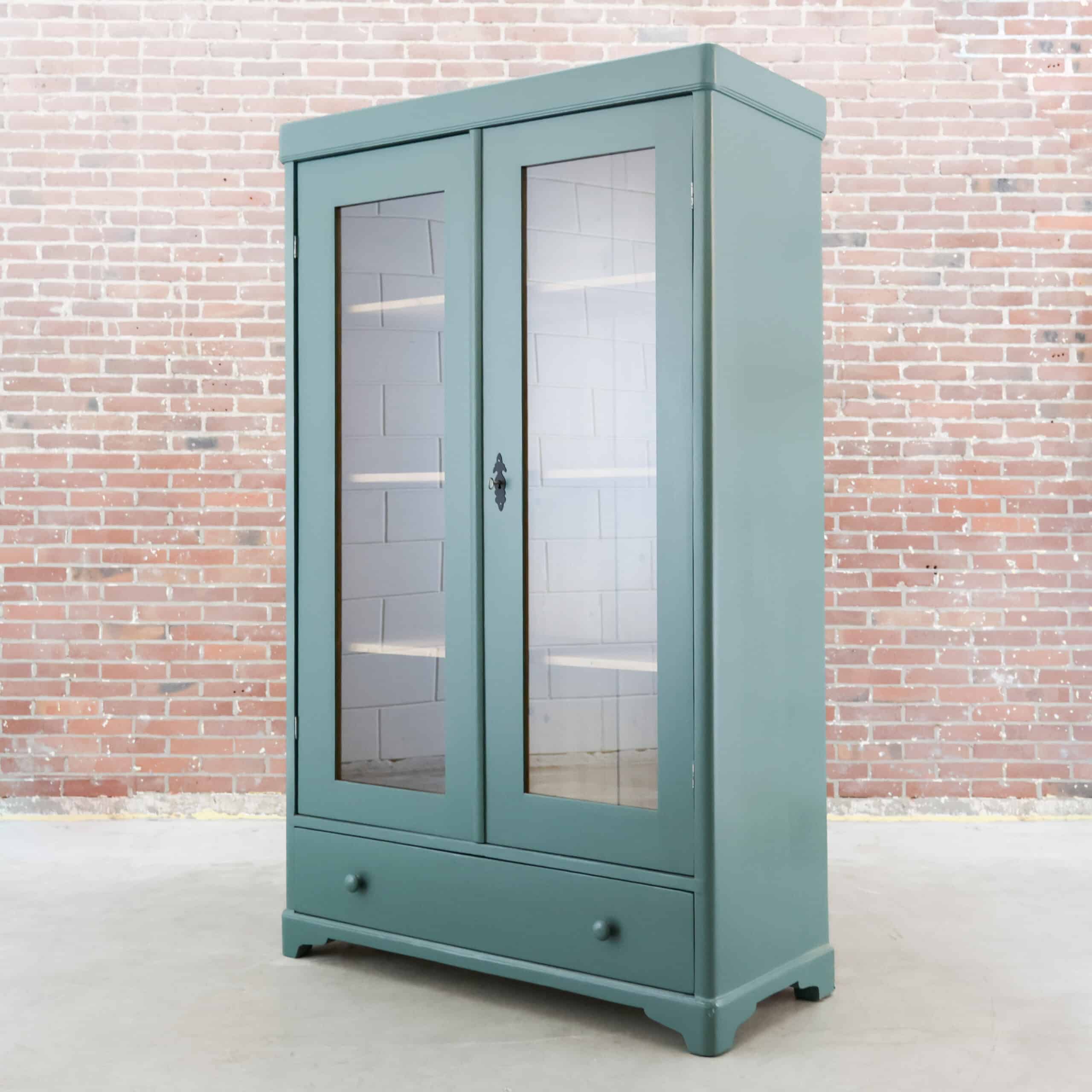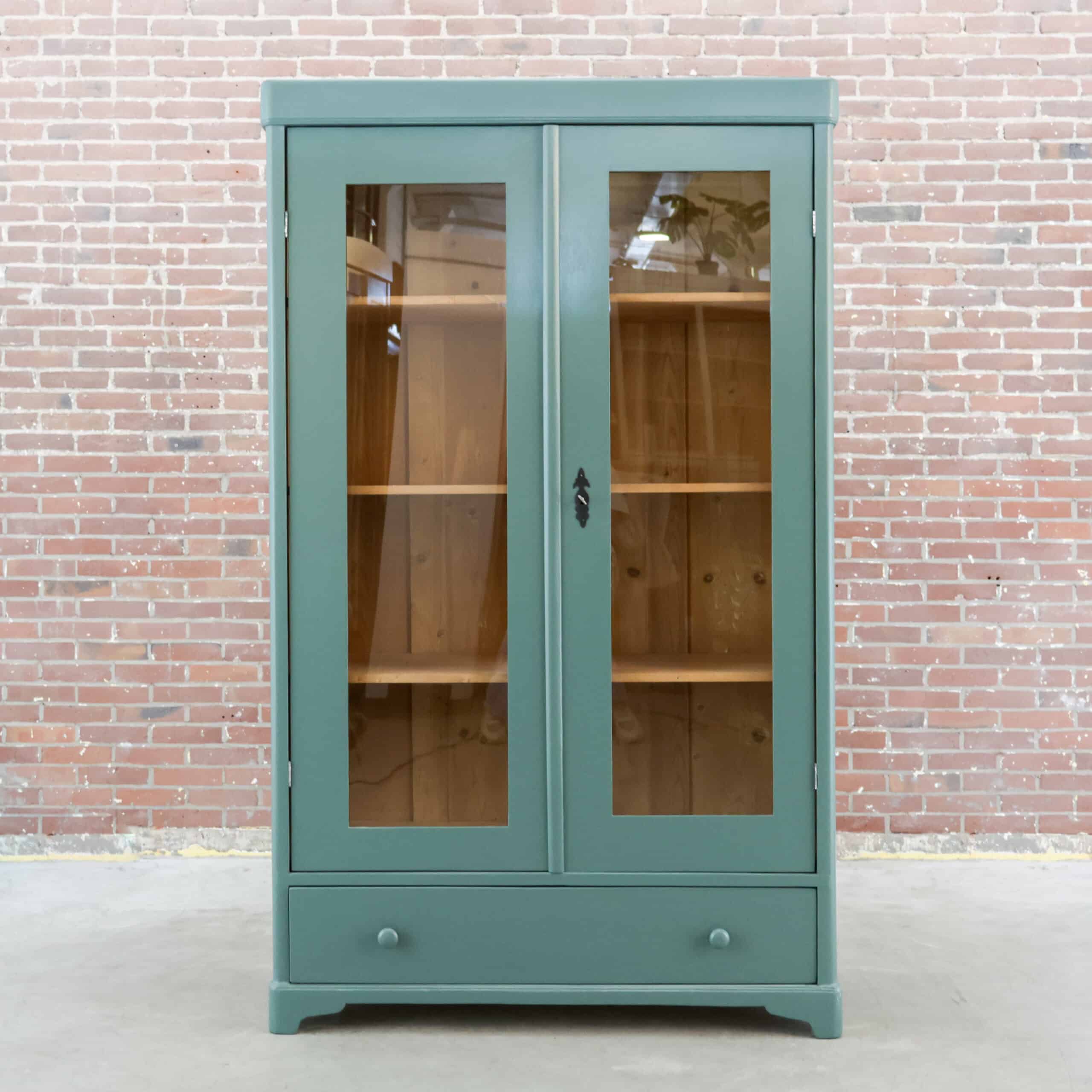 Mooi, deze brocante vitrinekast uit Hongarije! We hebben deze oude dame opgeknapt waar nodig, zo heeft ze oa drie nieuwe planken, glas en een turquoise/zeegroen kleurtje gekregen.