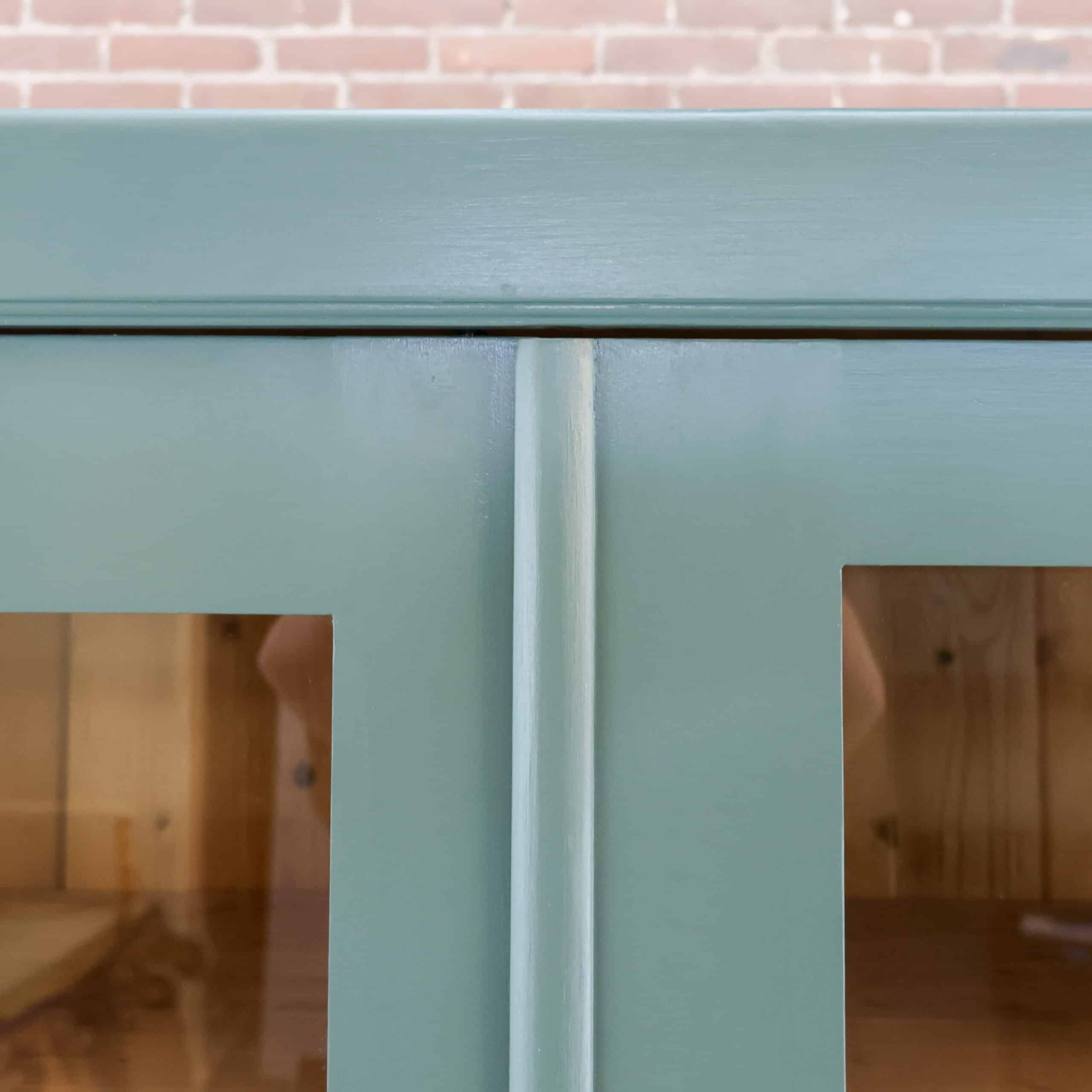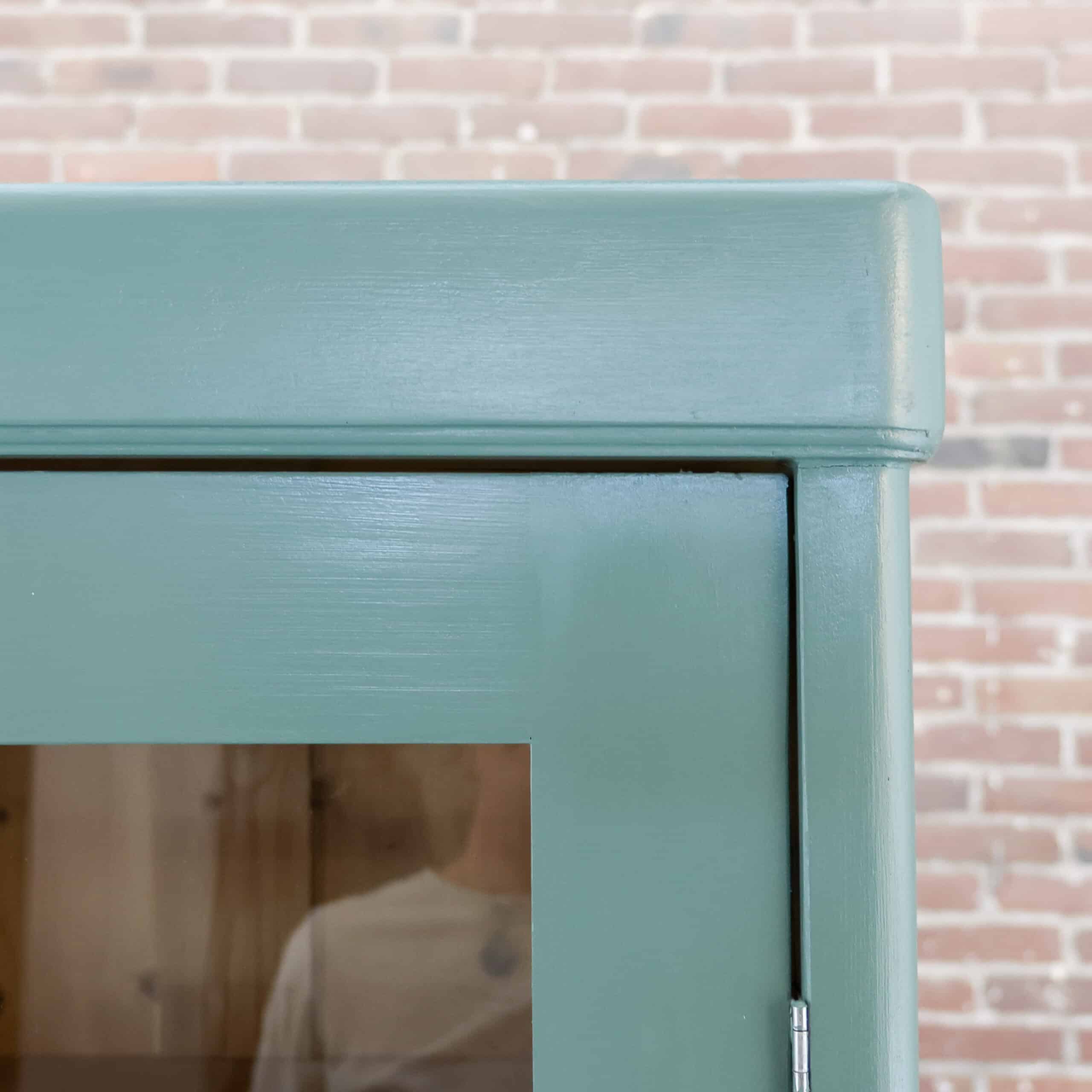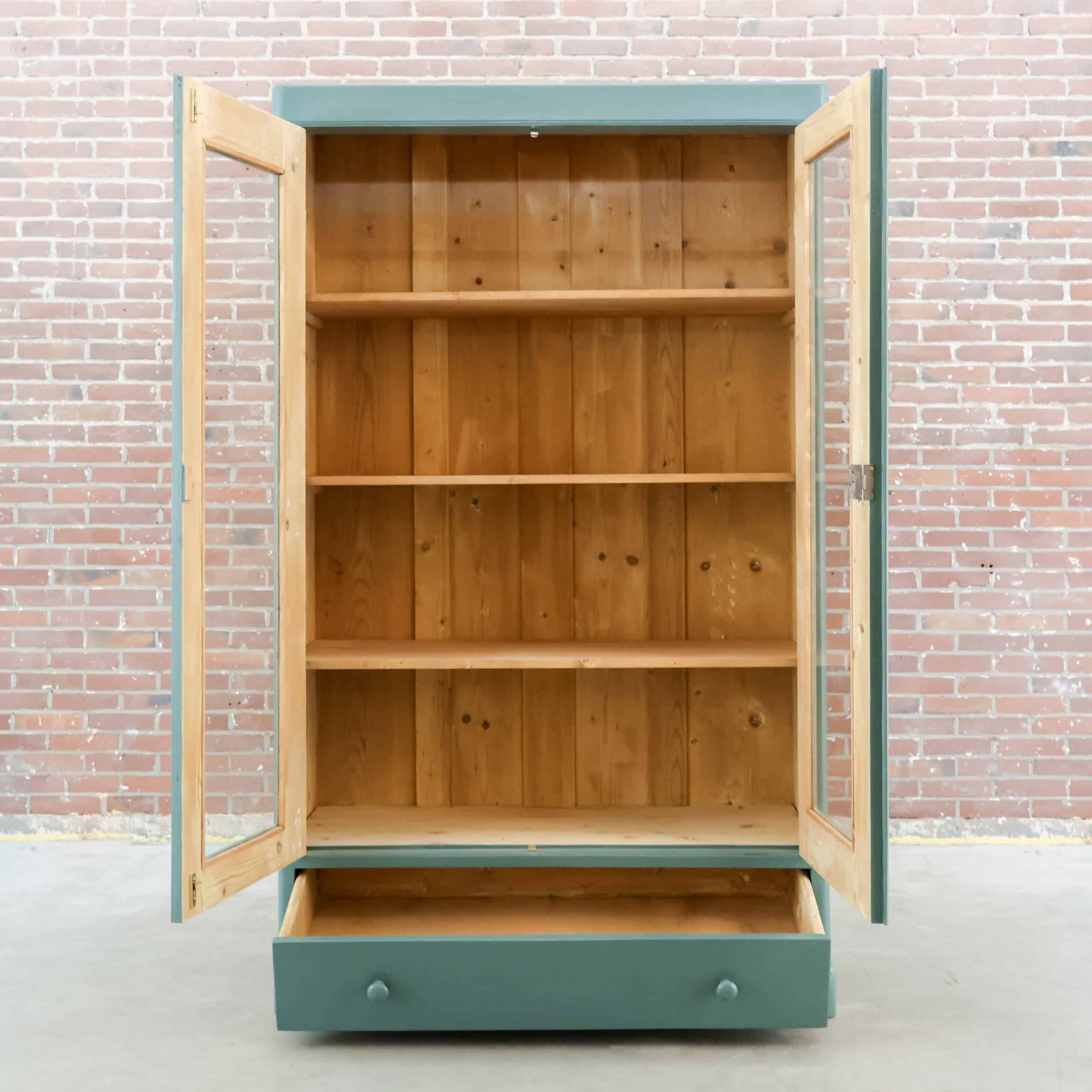 Mooi, deze brocante vitrinekast uit Hongarije! We hebben deze oude dame opgeknapt waar nodig, zo heeft ze oa drie nieuwe planken, glas en een turquoise/zeegroen kleurtje gekregen.