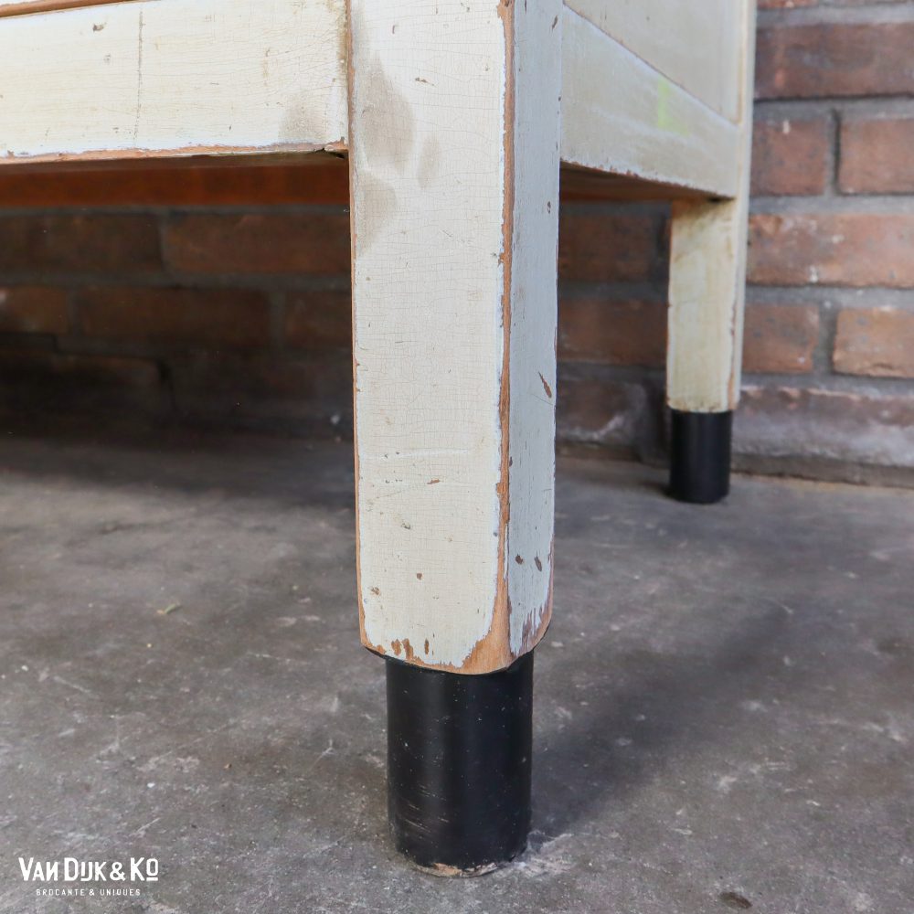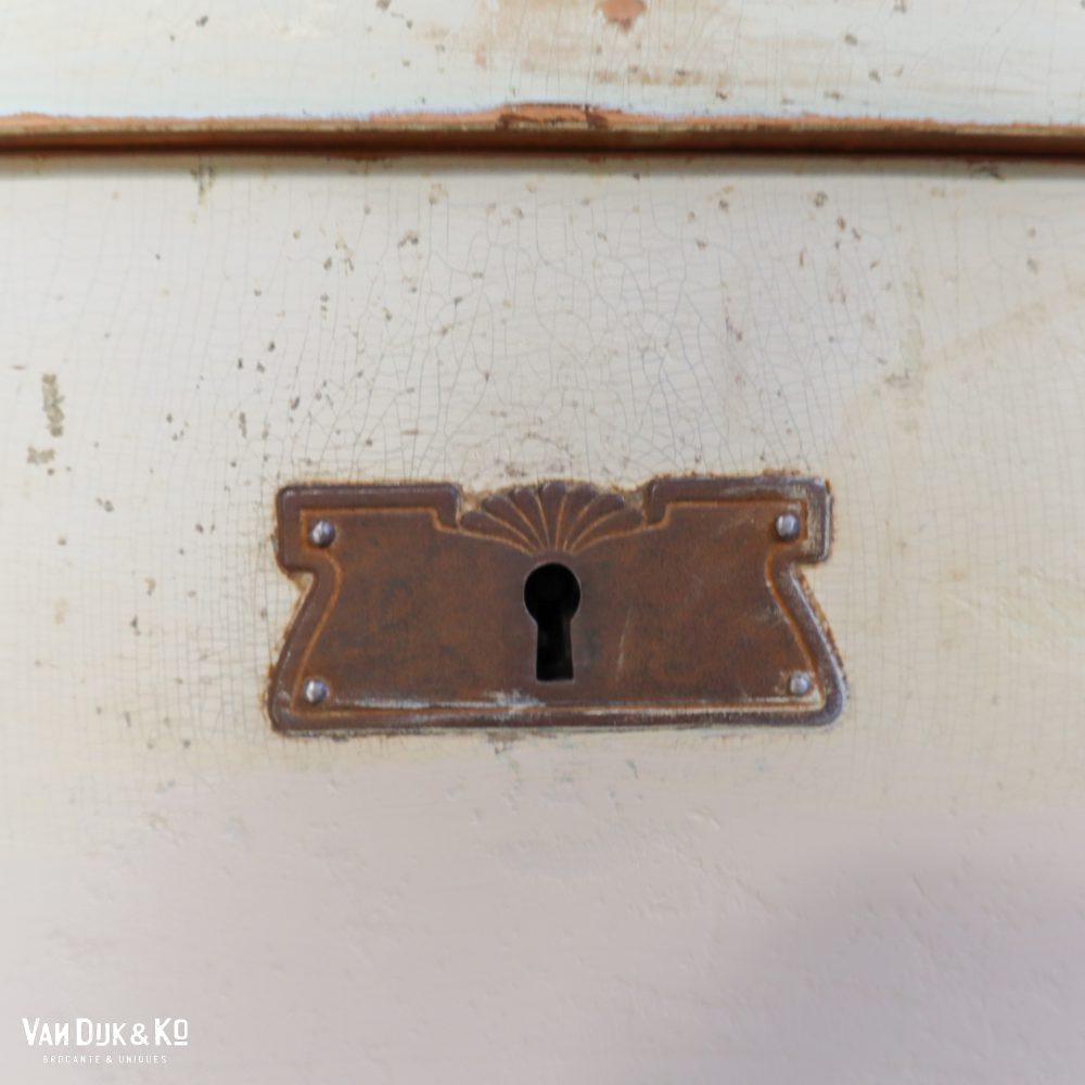 Leuk, deze brocante vitrinekast. Een charmant verweerd model met een klassieke look. De kast is opgeknapt waar nodig maar verder zoveel mogelijk in haar originele staat gelaten. Wat ook fijn is, is dat er al een hanggedeelte in de kast zit.