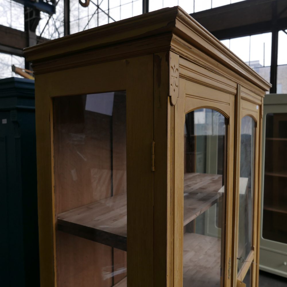 Deze zeer mooie brocante houten vitrinekast is heeft een gele kleur. Hij is met een veegstructuur geschilderd. De vitrinekast heeft twee deuren met glazen ramen en ook de zijkanten van de kast zijn van glas. De kast is af te sluiten met een slot en heeft een sleutel. Binnenin de kast zijn drie nieuwe planken gemaakt. Onderin heeft de kast een lade met messing grepen. De kast staat op sierlijke pootjes.
