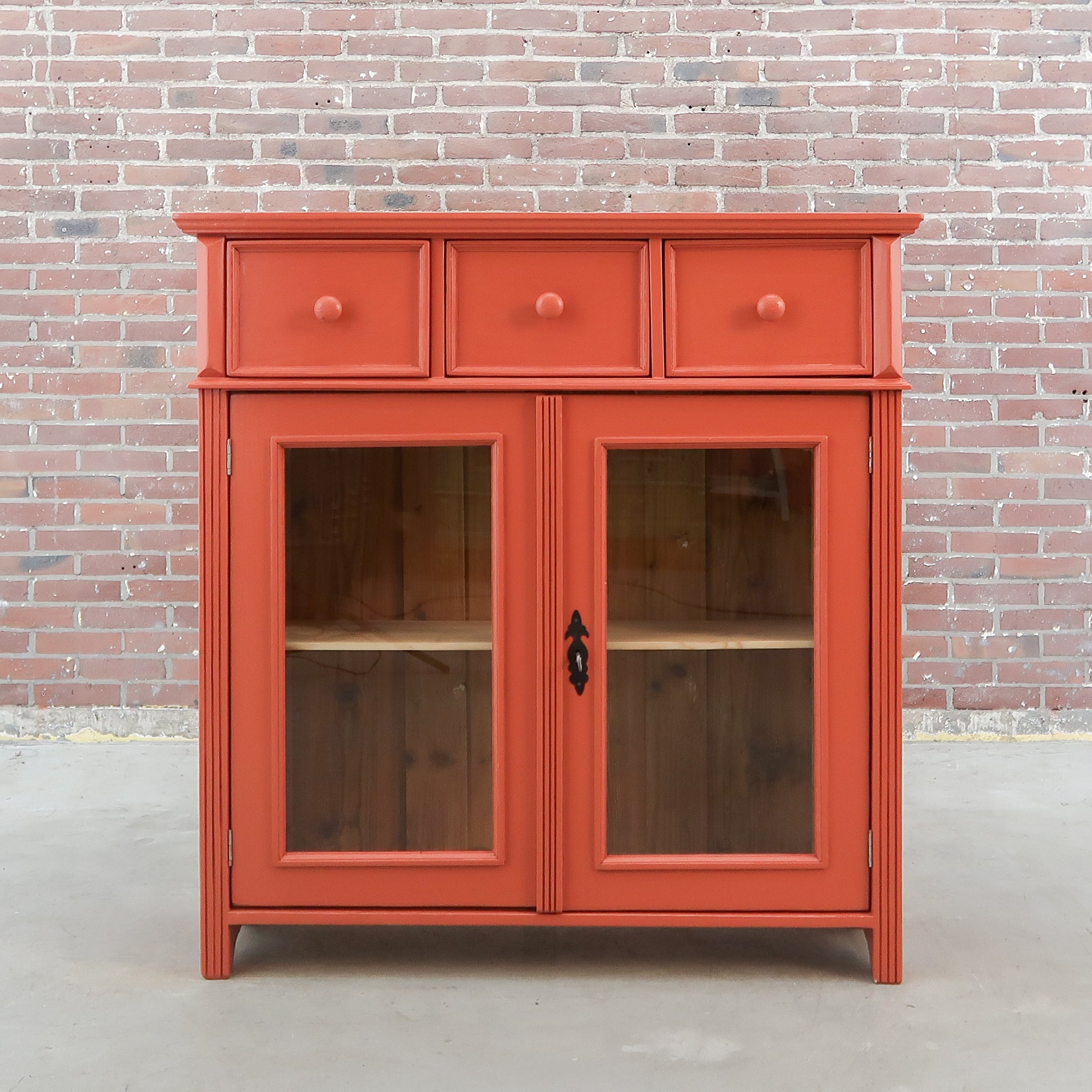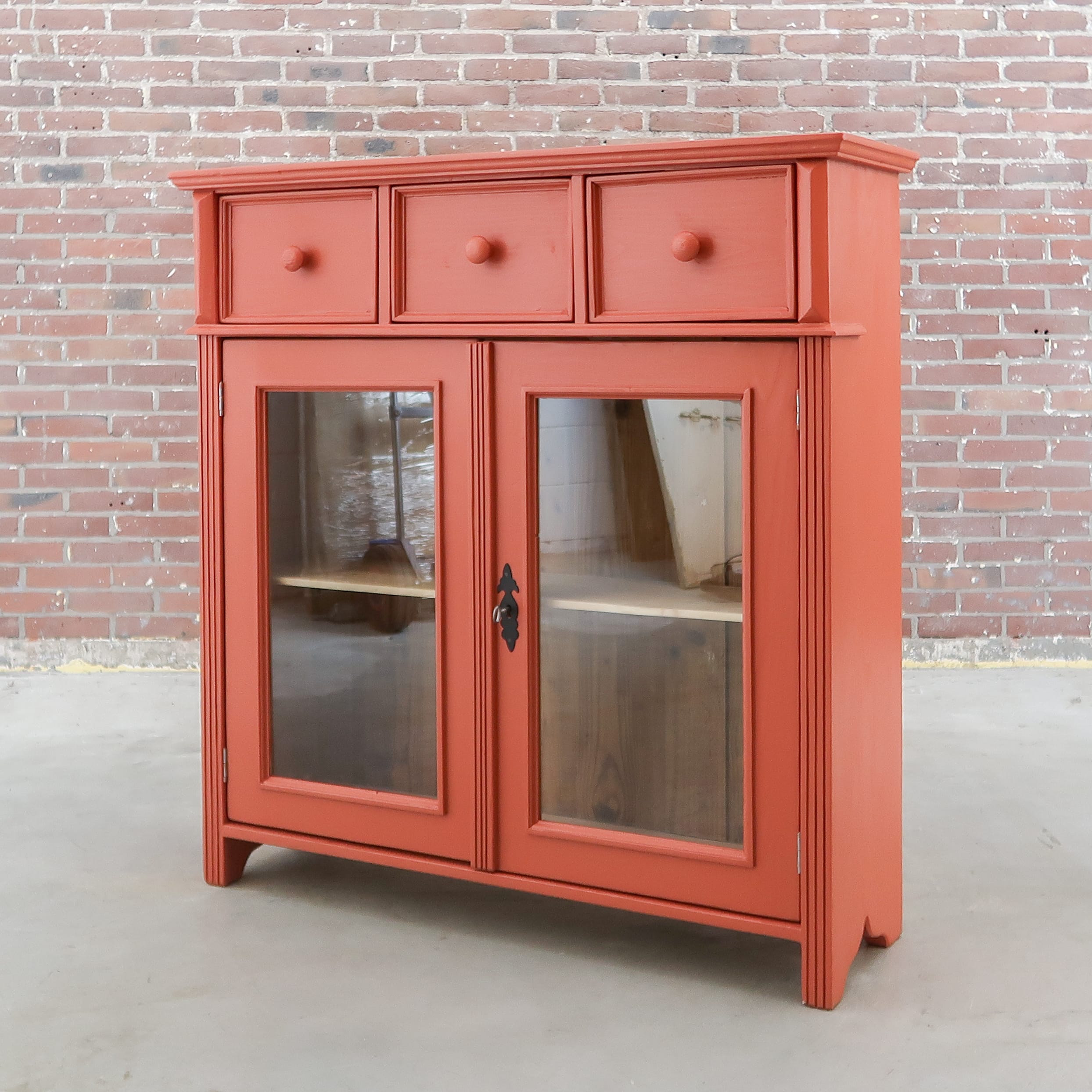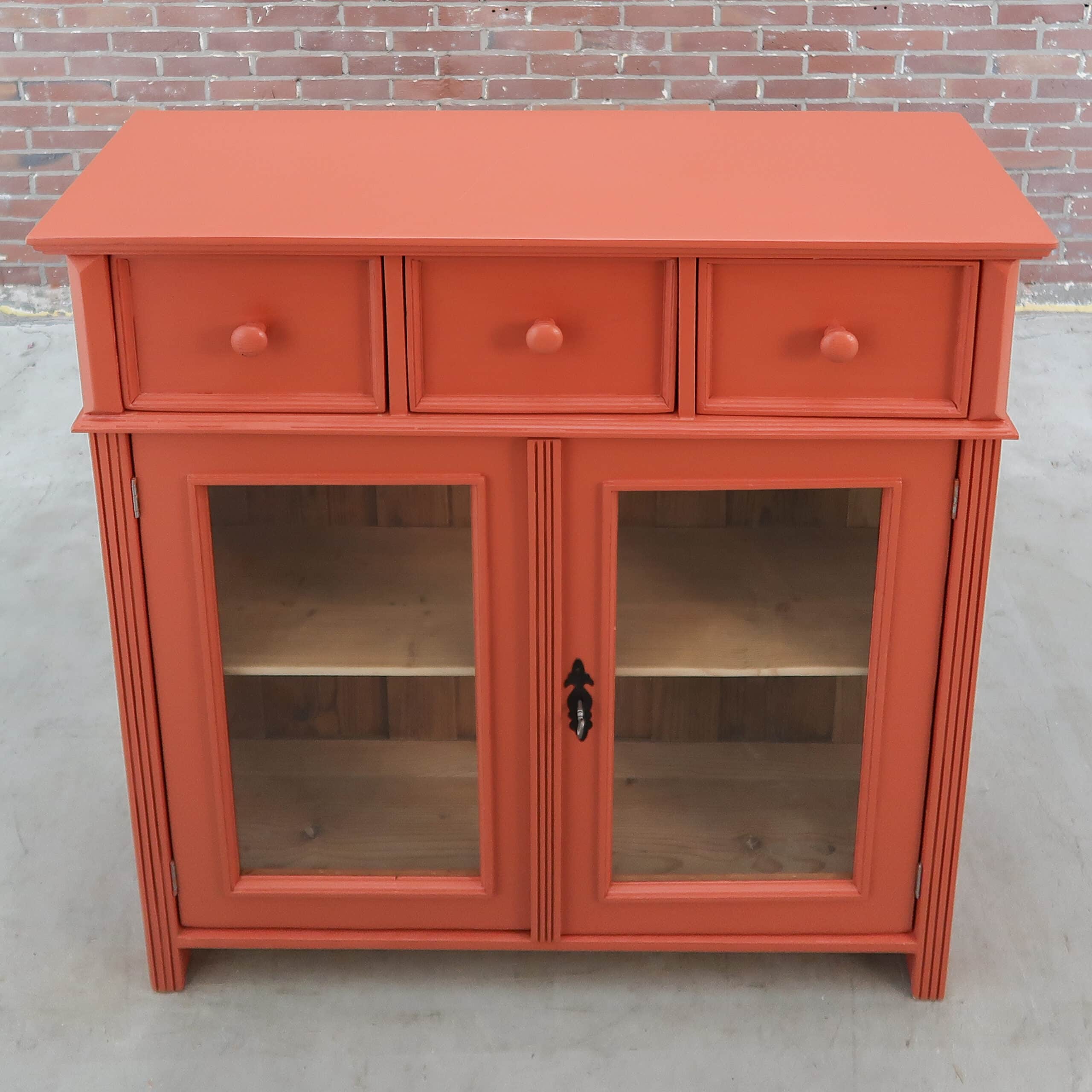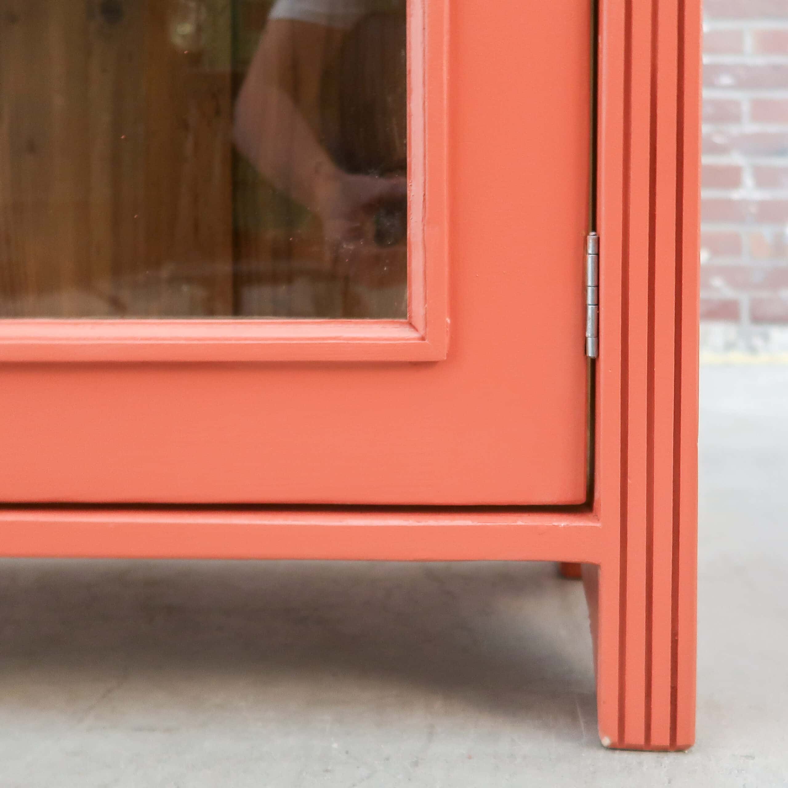 Een leuke brocante vitrinekastje. Handig voor nét even die extra opbergruimte in de keuken of badkamer. De kast heeft nieuw glas en fijne terra rood kleur gekregen.