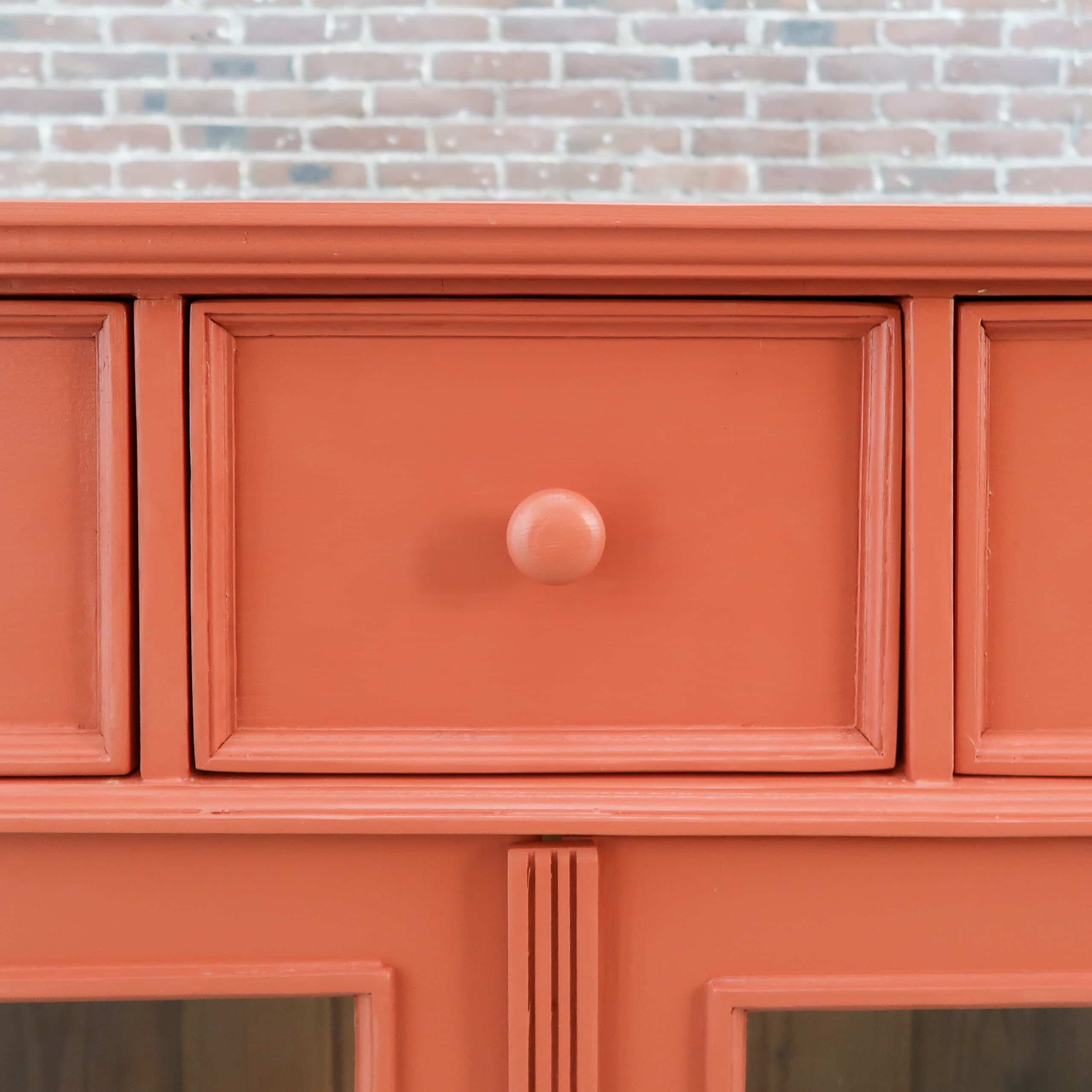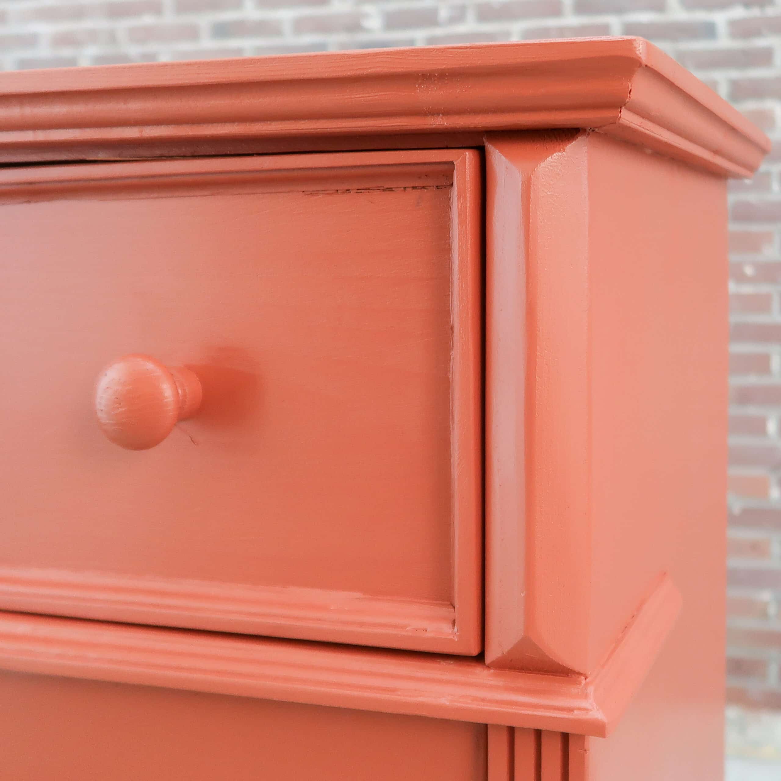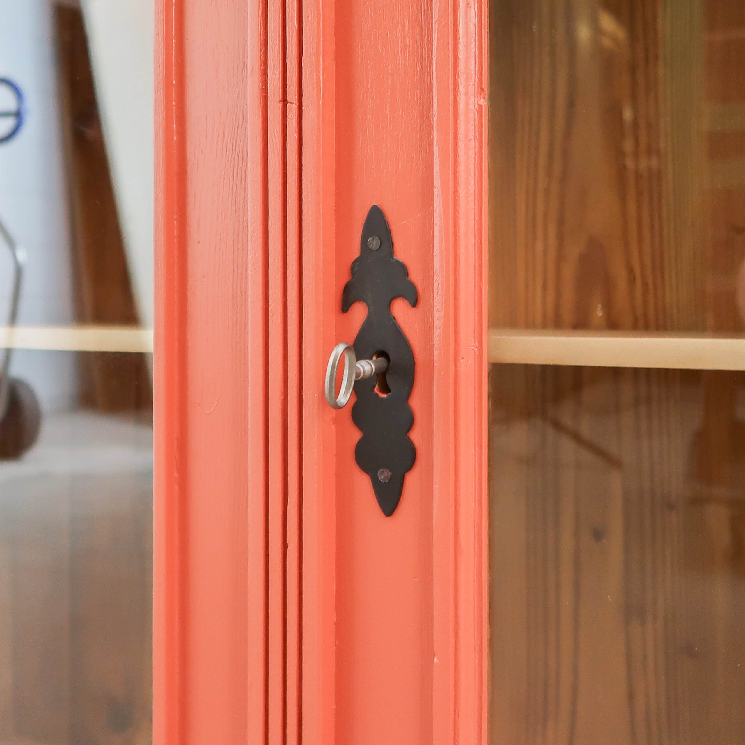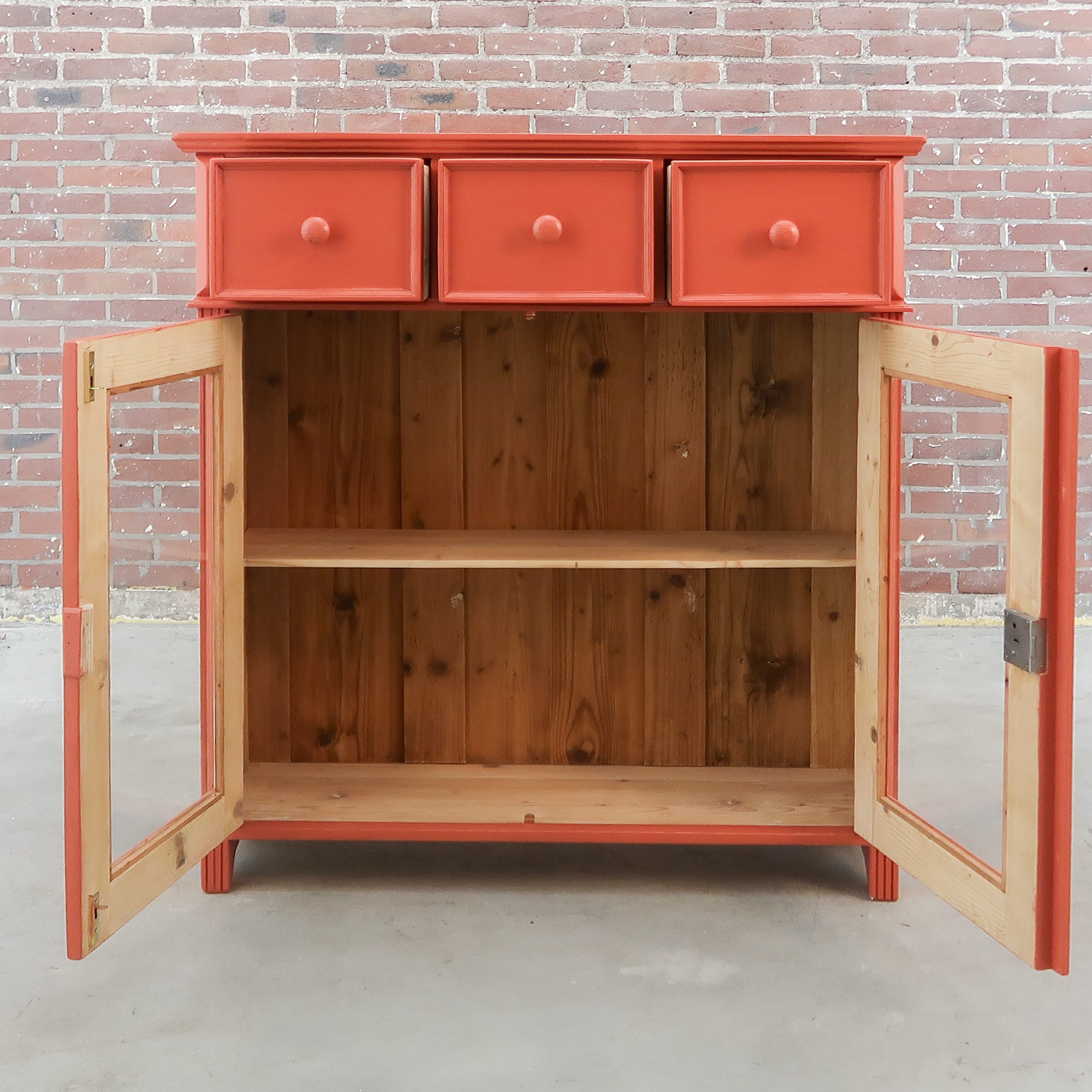 Een leuke brocante vitrinekastje. Handig voor nét even die extra opbergruimte in de keuken of badkamer. De kast heeft nieuw glas en fijne terra rood kleur gekregen.
