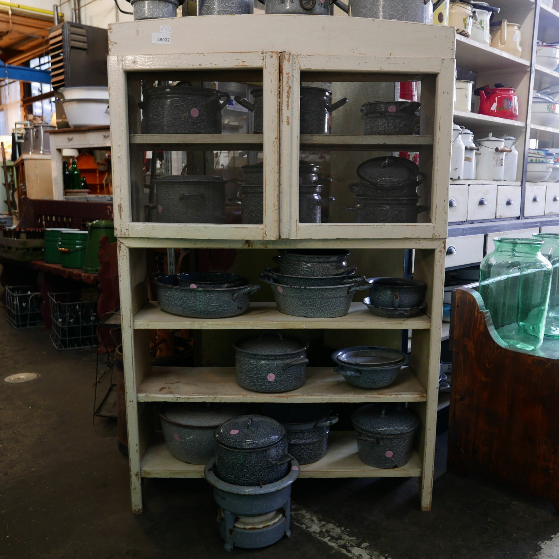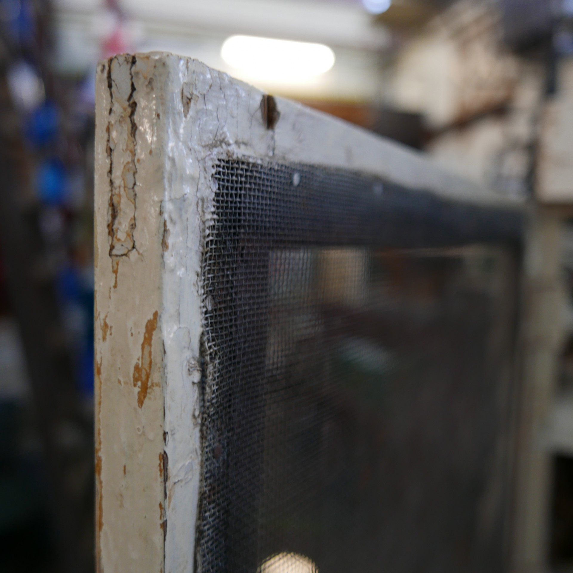 Dit brocante witte vliegenkastje is gemaakt van hout. De kast heeft bovenin twee deurtjes met gaas en binnenin één plank. Het gaas is intact. De deuren zijn af te sluiten met een klip. Onderin heeft de kast drie planken. De kast toont gebruikerssporen.