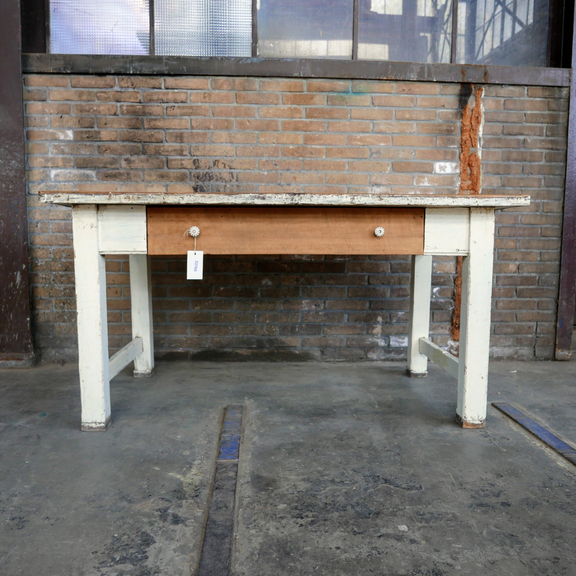 Hongaarse eettafel gemaakt van hout. Een beauty! De tafel is wit en heeft een onbewerkt houten tafelblad. Onder dit blad een brede lade, met porseleinen knoppen, voor het tafelkleed of het bestek. De tafel toont gebruikerssporen.