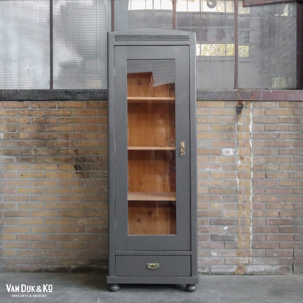 Deze donkergrijze eendeurs vitrinekast is een leuk exemplaar. Opgeknapt waar nodig. Een fijn formaat voor een kleinere ruimte of voor wanneer je simpelweg geen joekel van een kast nodig hebt.