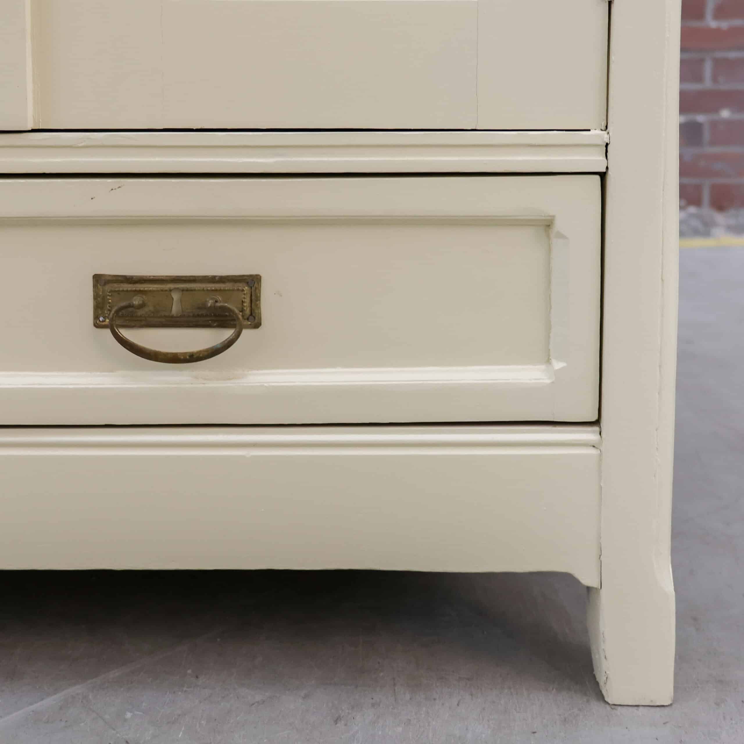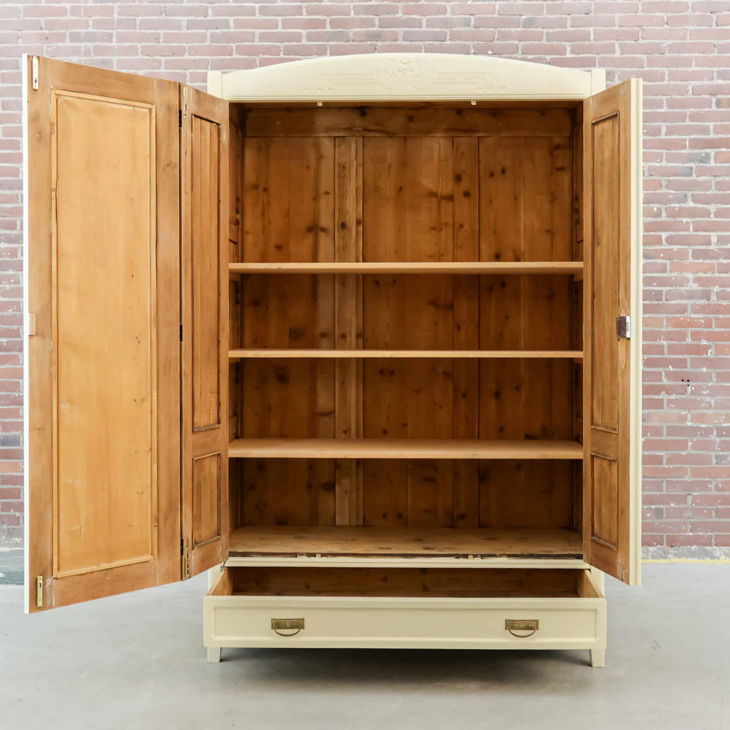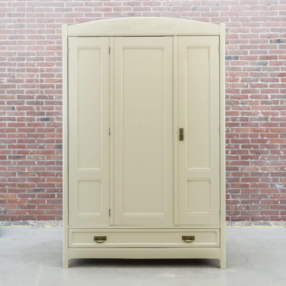 Prachtige landelijke driedeurs linnenkast met een zachte crème buitenkant en een warme grenen binnenzijde. De kast heeft mooie rustige paneeldeuren, een subtiel gebogen kap en onderin een praktische lade met messing grepen. Binnenin vind je stevige legplanken en volop opbergruimte, ideaal voor kleding, servies of linnengoed. Een karaktervolle kast met lichte gebruikssporen die haar leeftijd verraden en juist bijdragen aan haar charme.