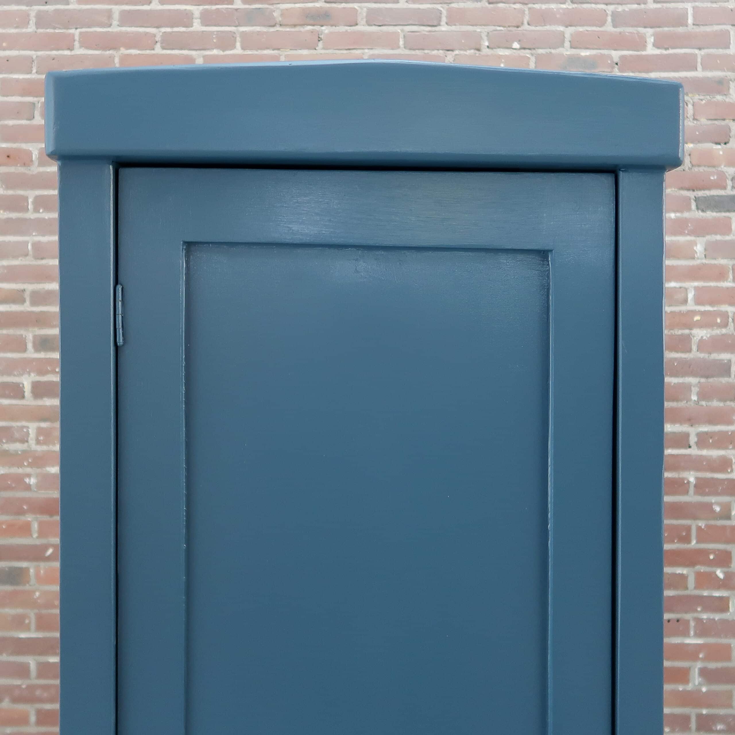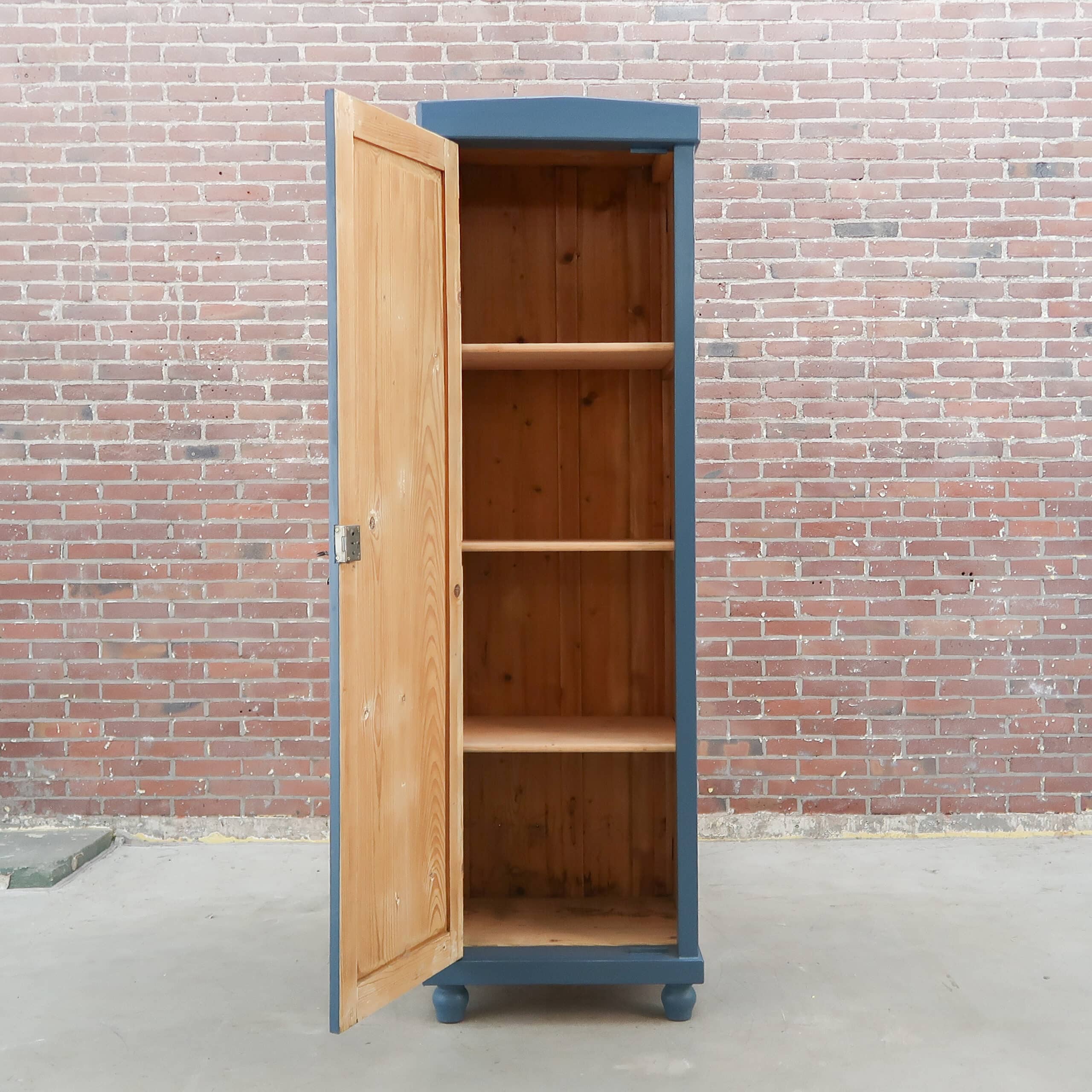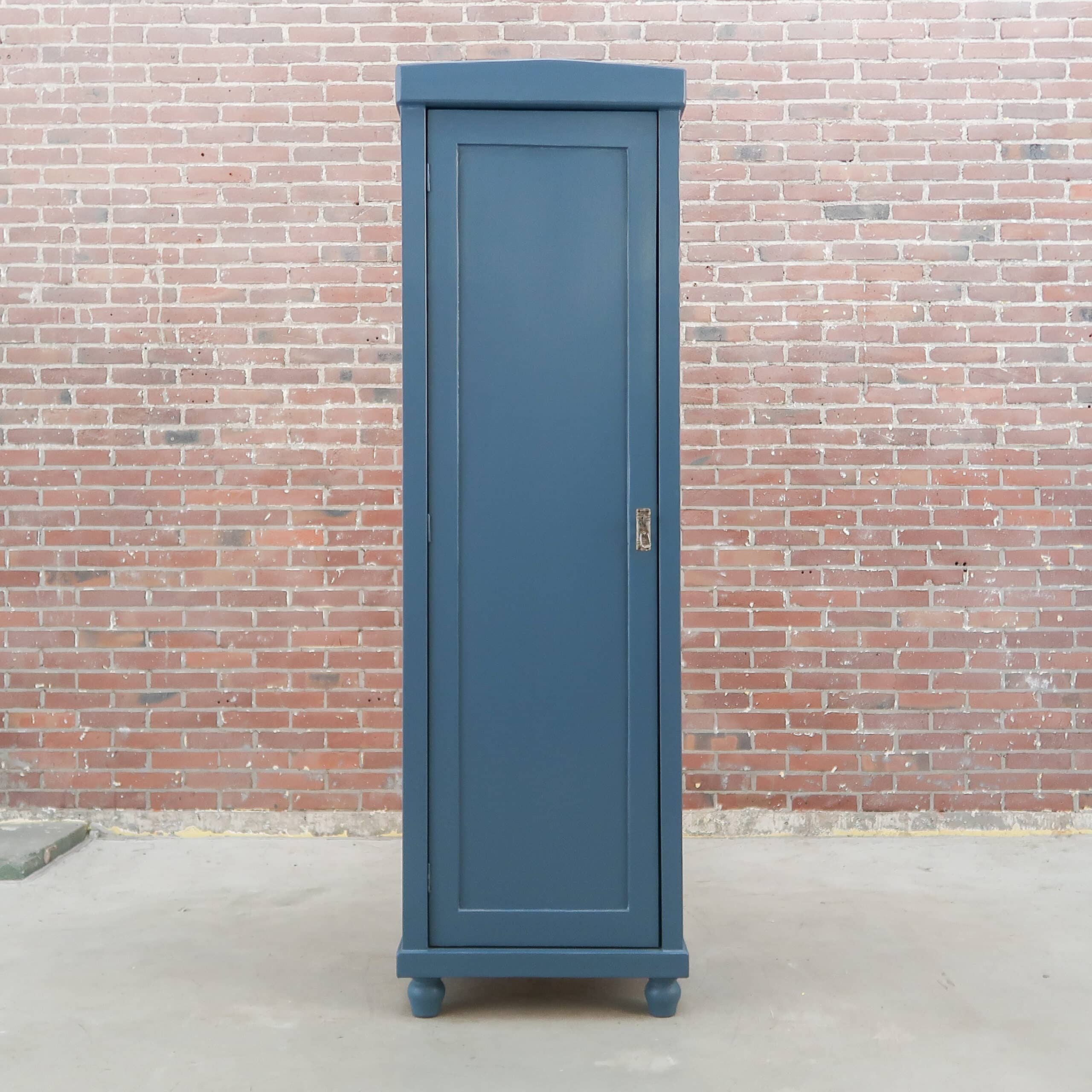 Net binnen, deze mooie eendeurs linnenkast! We hebben haar in onze eigen werkplaats gemaakt van oude kastdelen. Ze heeft een bijzondere kleur blauw gekregen en is klaar voor een nieuw leven.