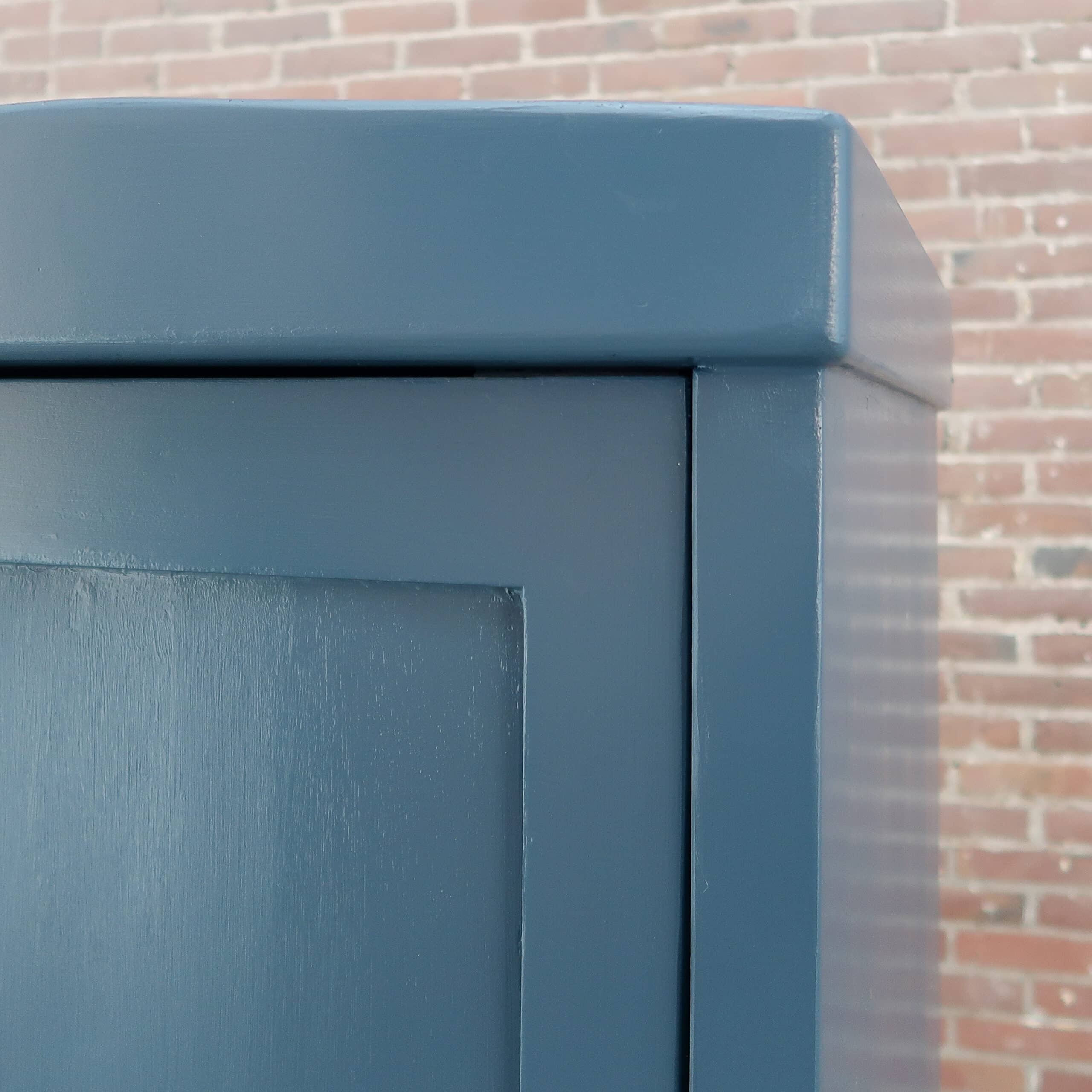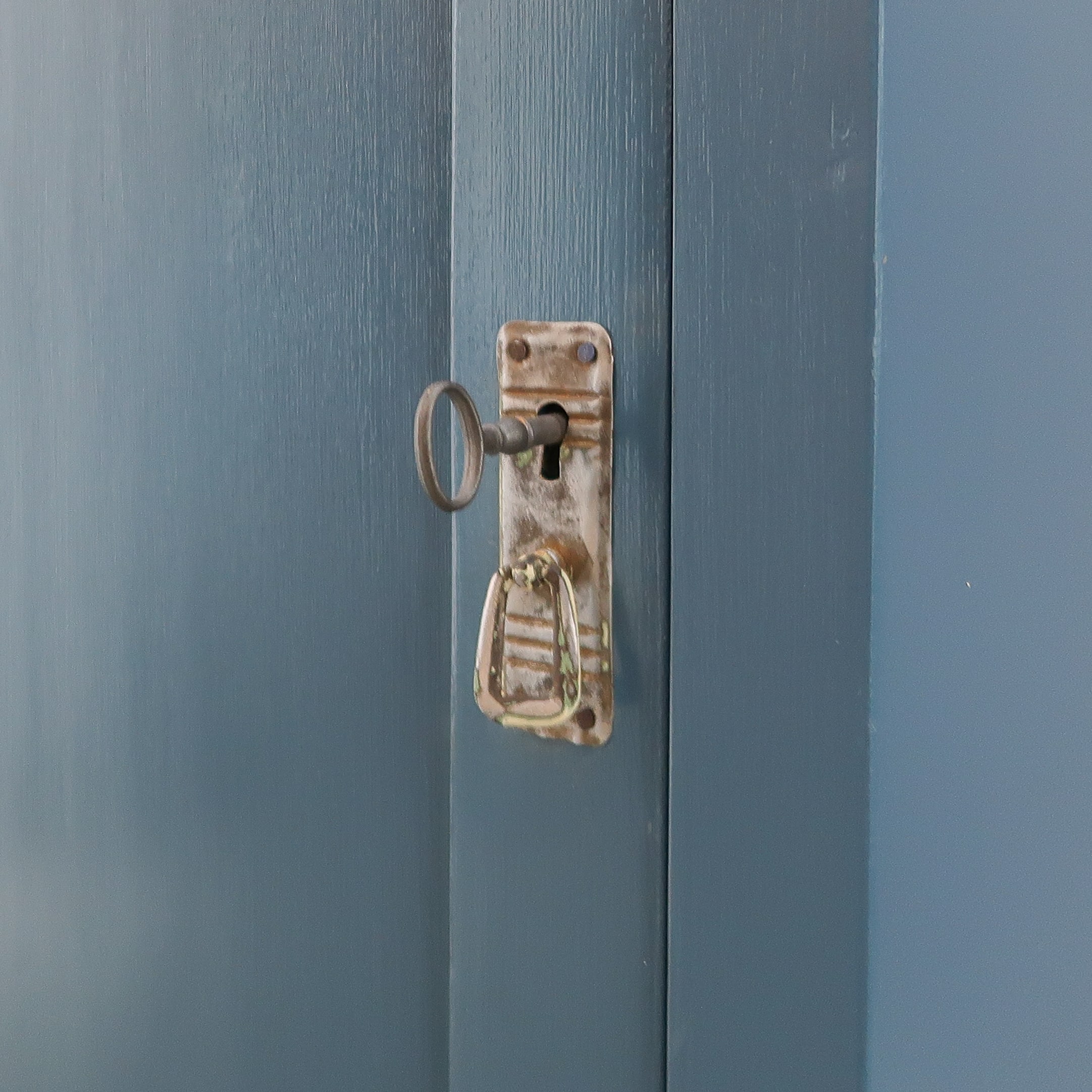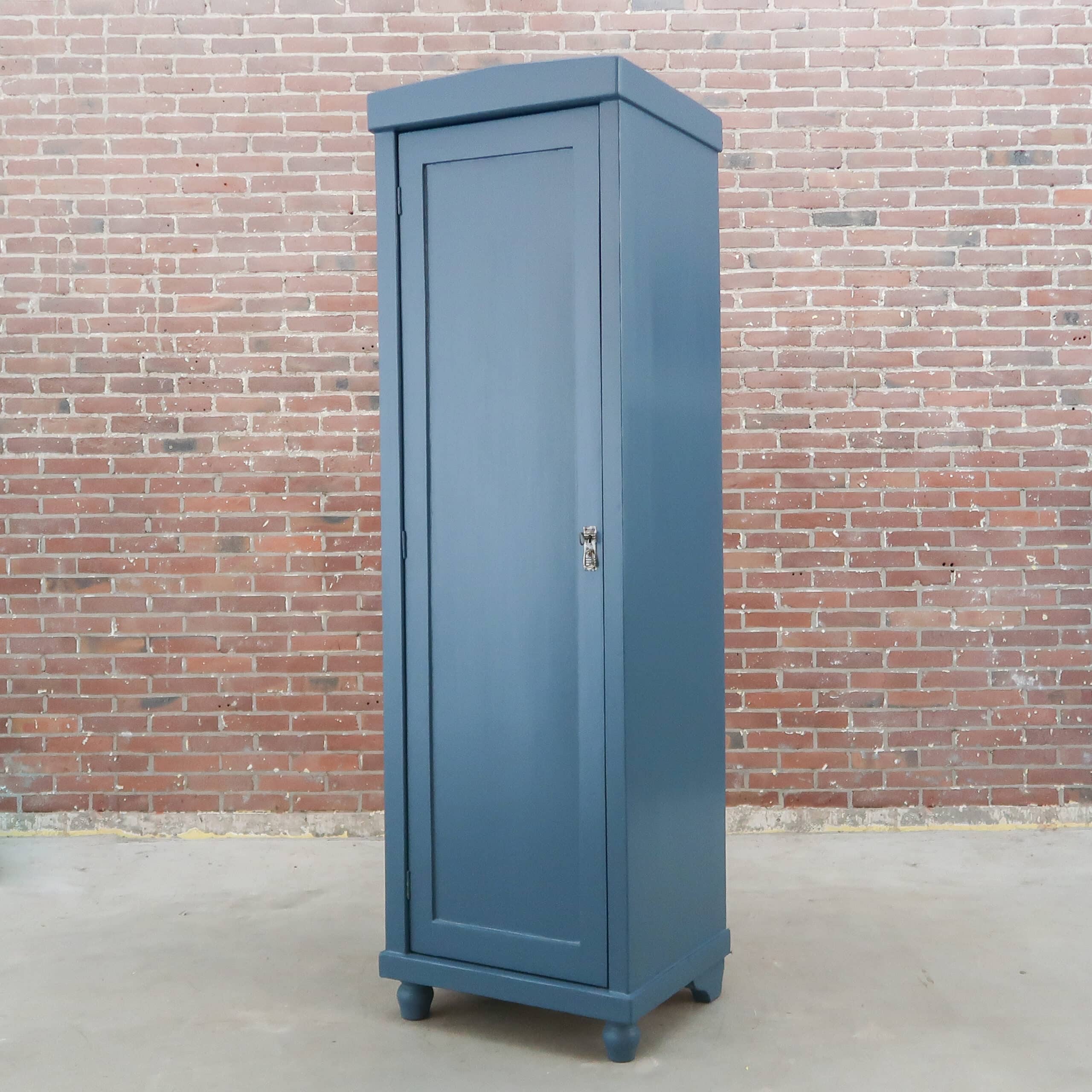 Net binnen, deze mooie eendeurs linnenkast! We hebben haar in onze eigen werkplaats gemaakt van oude kastdelen. Ze heeft een bijzondere kleur blauw gekregen en is klaar voor een nieuw leven.