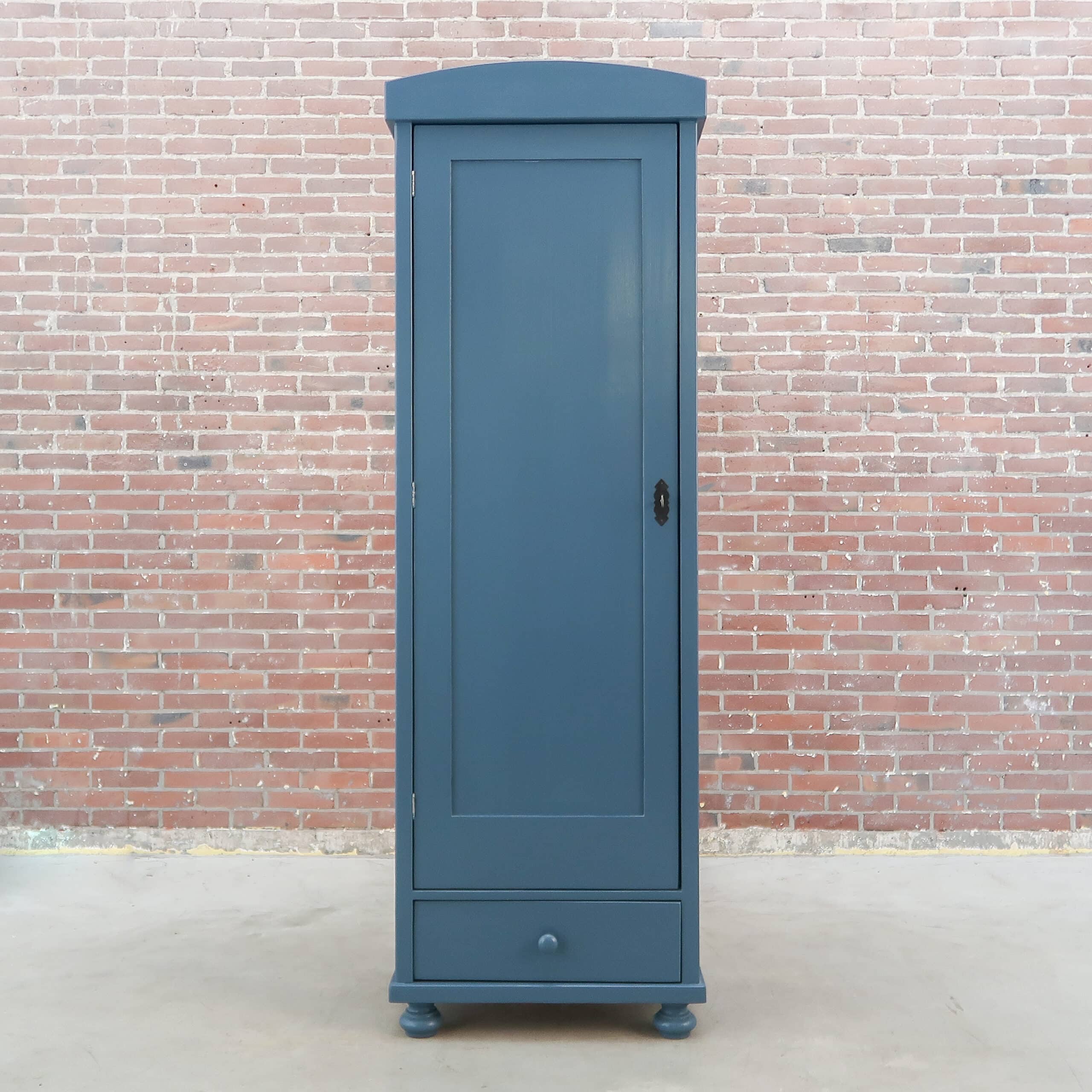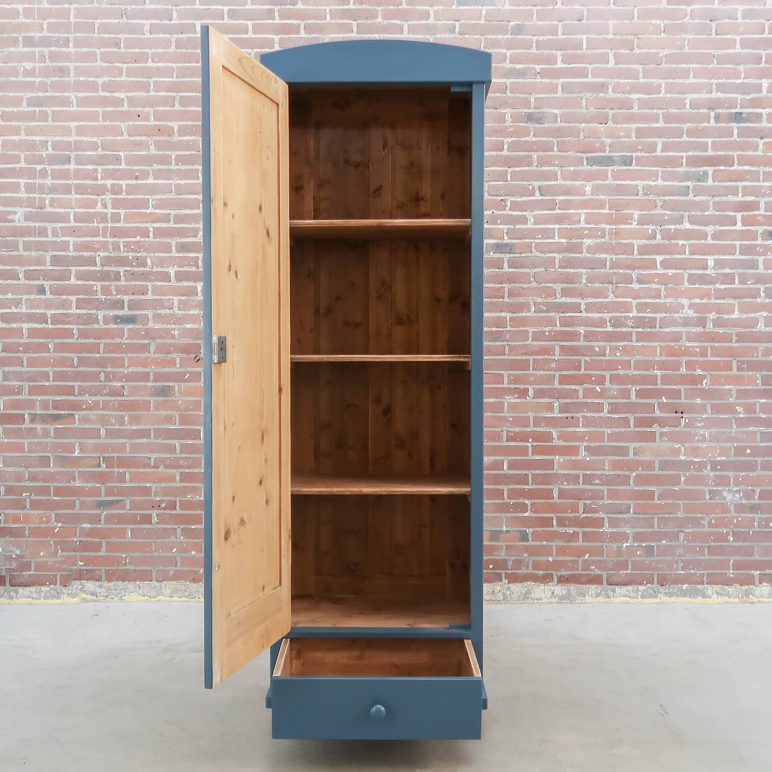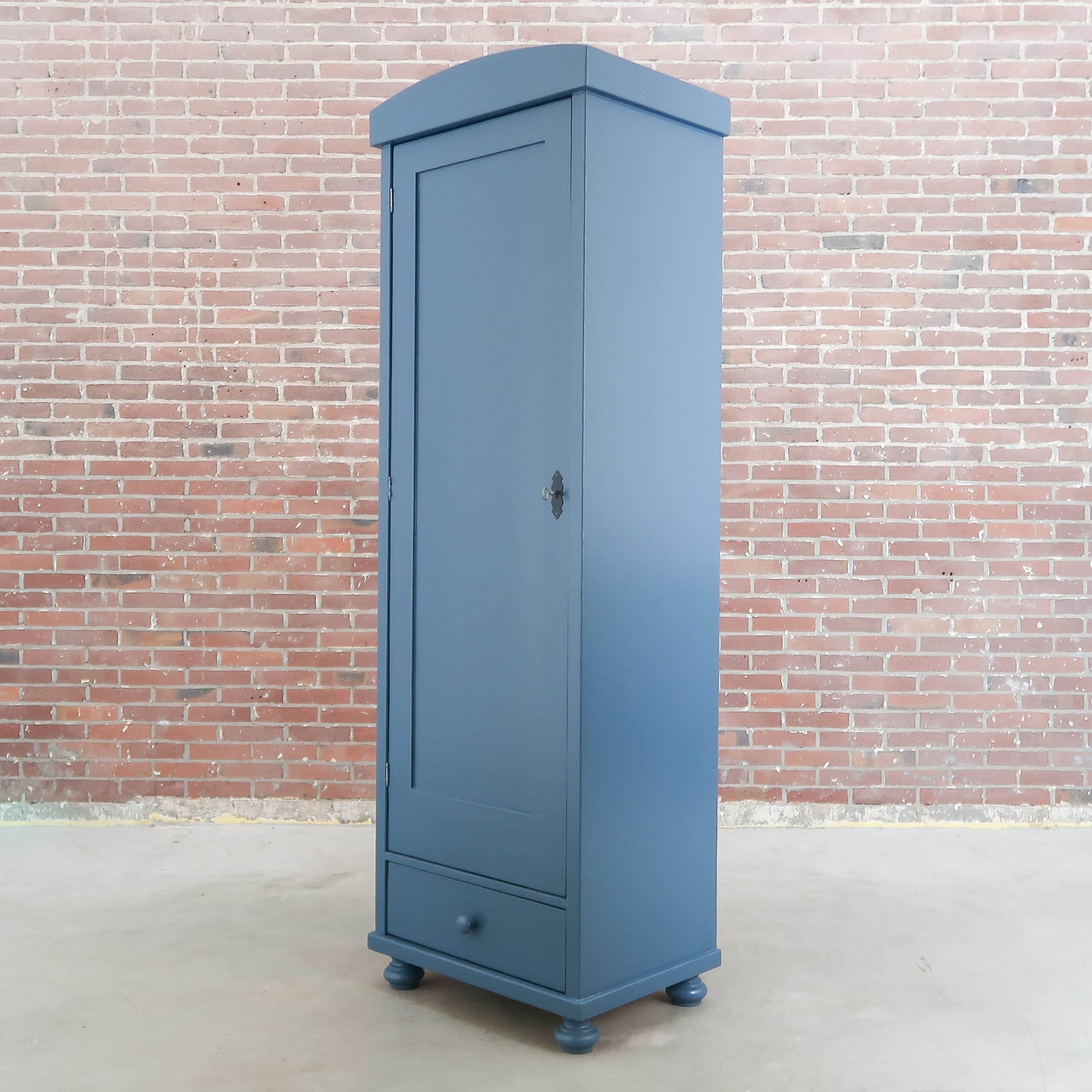 Net binnen, deze mooie eendeurs linnenkast! We hebben haar in onze eigen werkplaats gemaakt van oude kastdelen. Ze heeft een bijzondere kleur blauw gekregen en is klaar voor een nieuw leven.