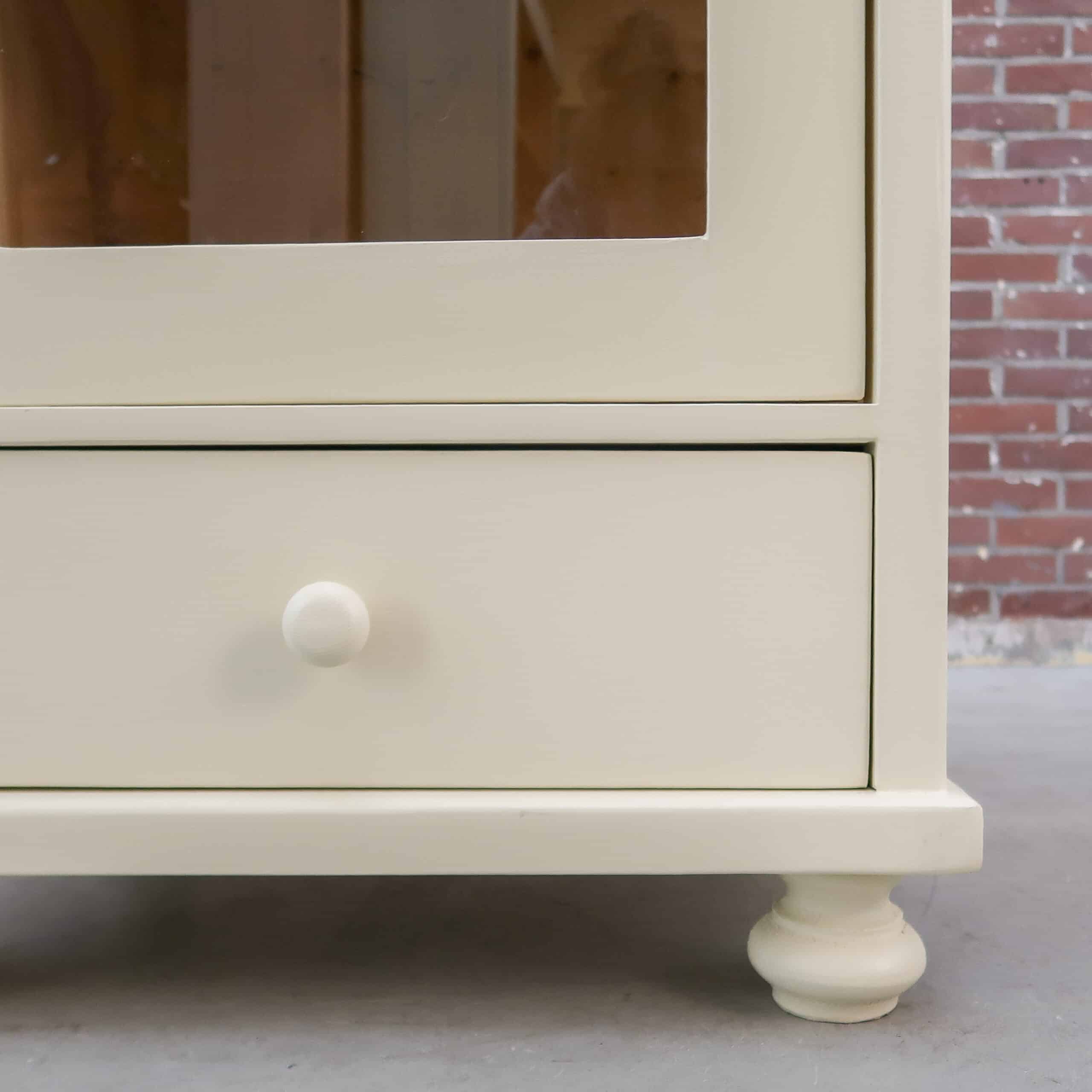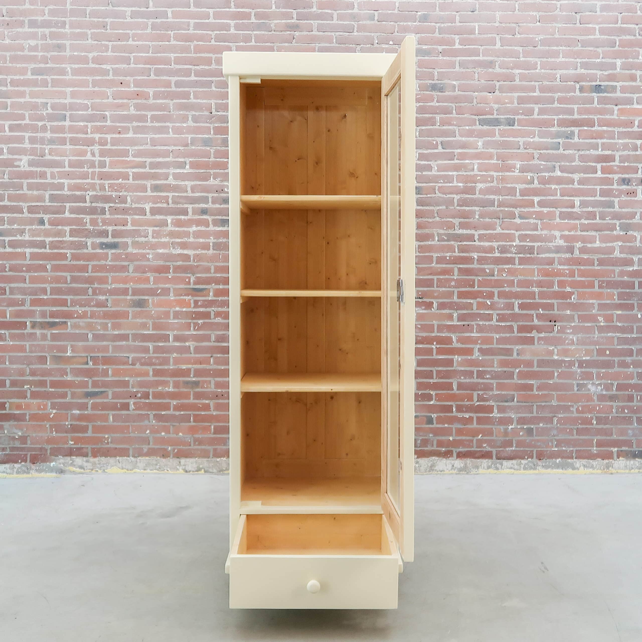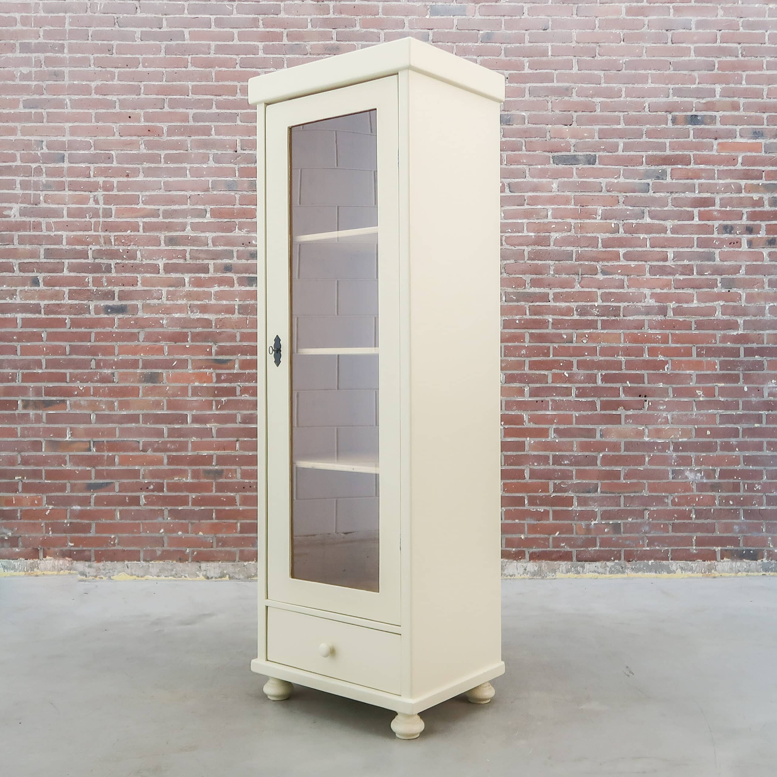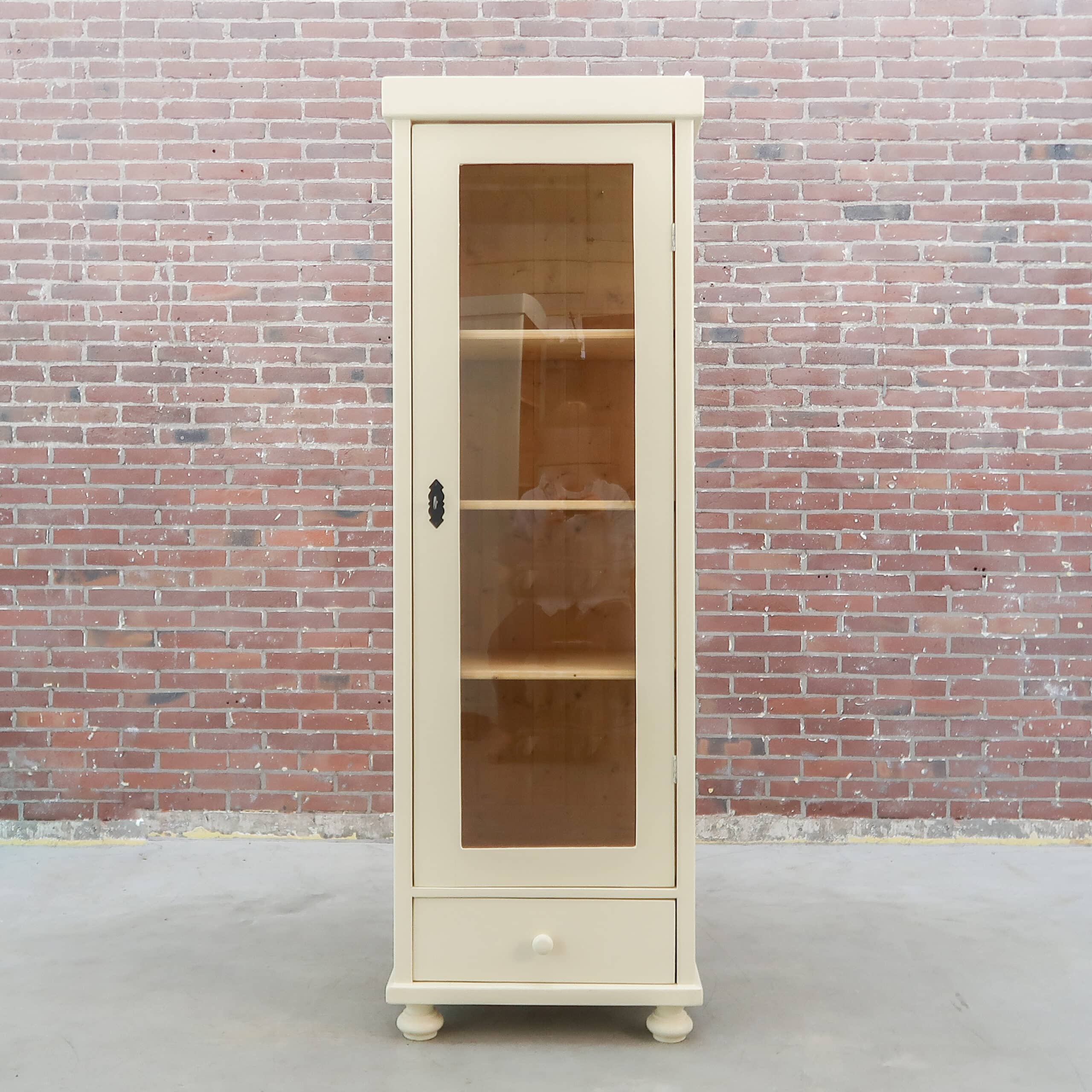 Deze mooie brocante eendeurs vitrinekast hebben we opgespeurd in Hongarije en opgeknapt waar nodig. Ze heeft ze oa nieuwe planken, nieuw glas en een bijzondere crème kleur gekregen. Wie haalt dit zonnetje in huis?