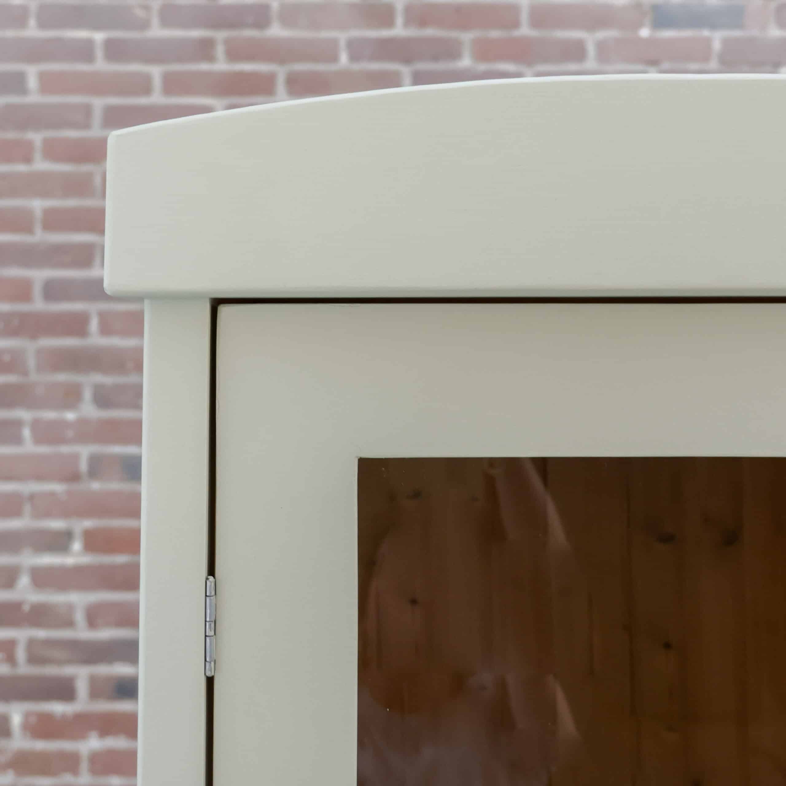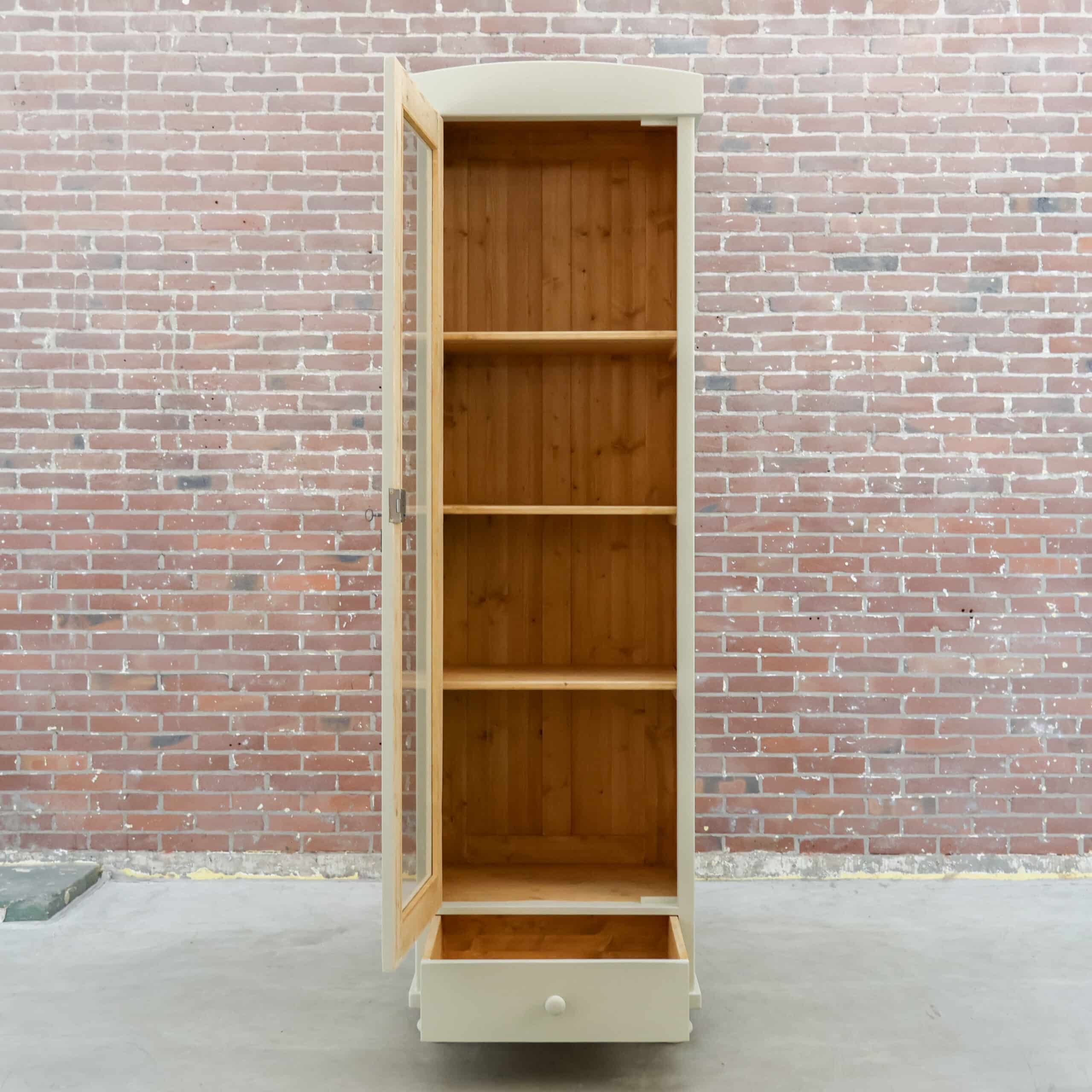 Net binnen, deze eendeurs vitrinekast! We hebben haar in eigen werkplaats gemaakt, met het hout van oude kasten die we niet meer konden redden. Zo haal je dus een heel uniek én duurzaam exemplaar in huis!