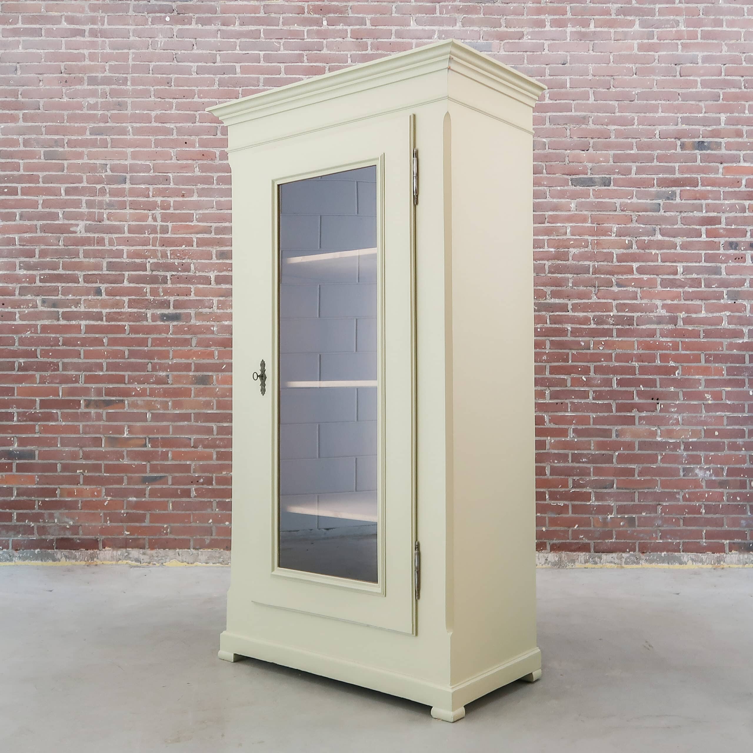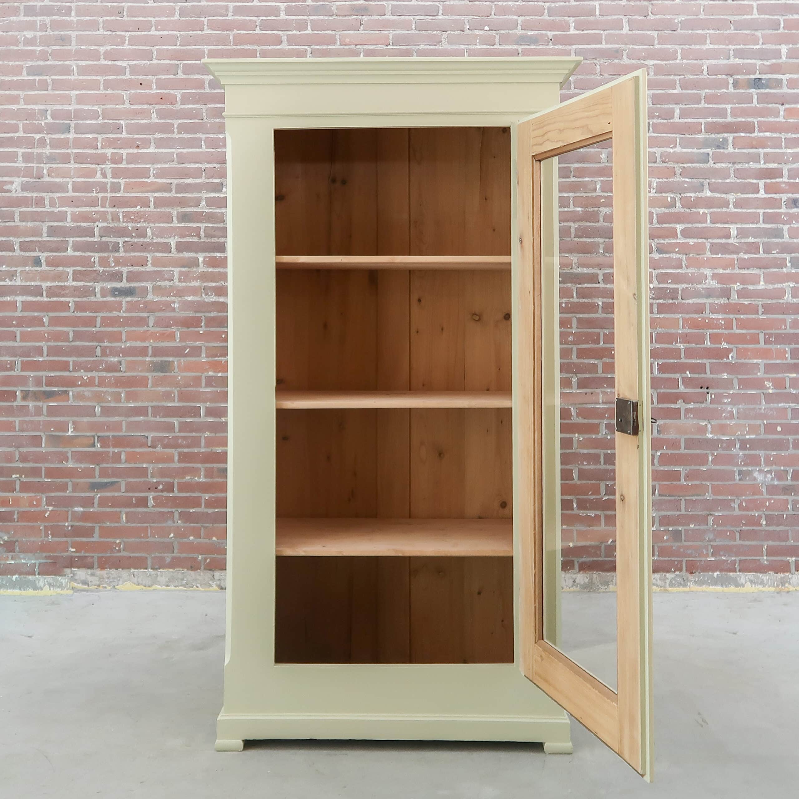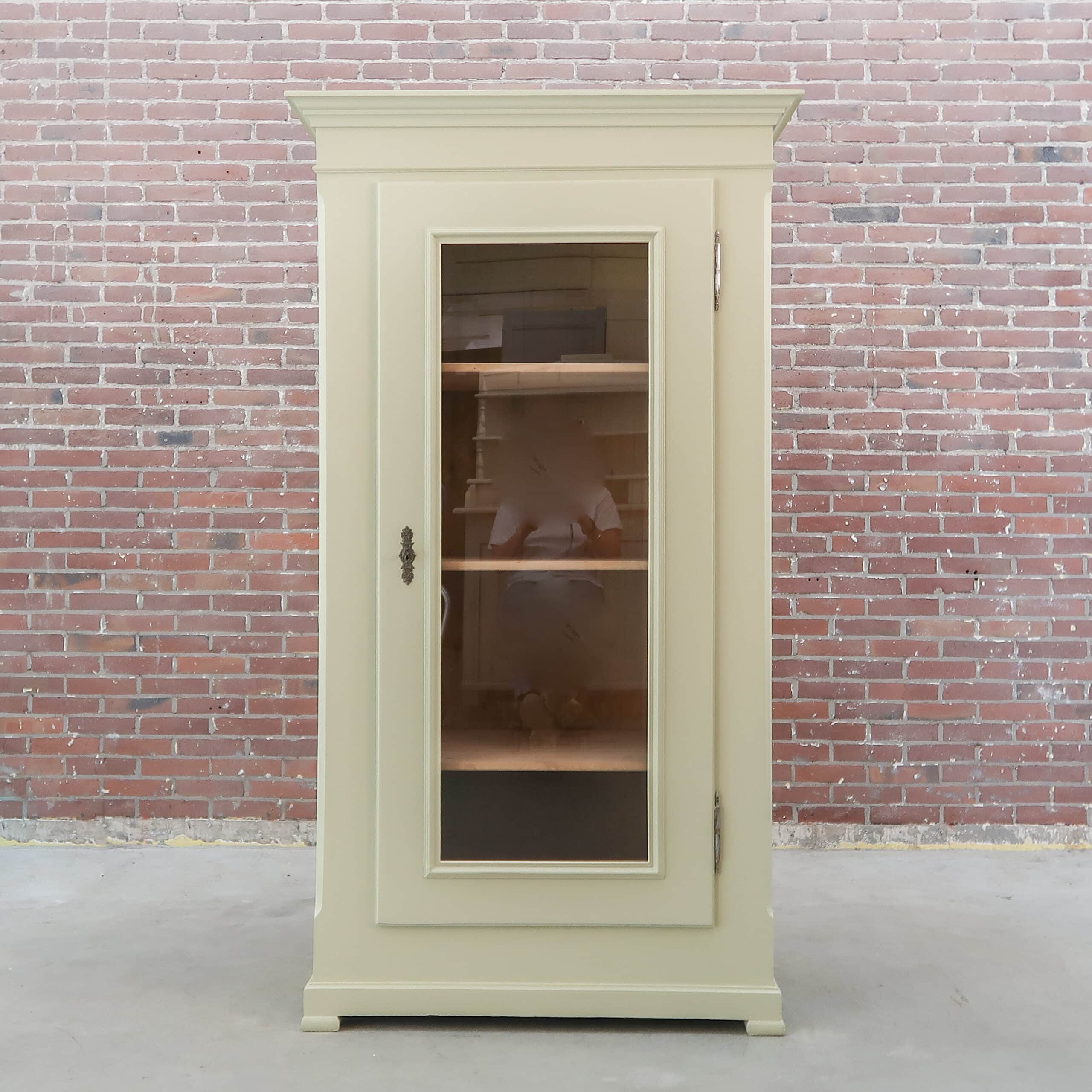 Deze mooie brocante eendeurs vitrinekast hebben we opgespeurd in Hongarije en opgeknapt waar nodig. Ze heeft ze oa nieuwe planken, nieuw glas en een bijzondere kleur beige gekregen. Wie haalt dit zonnetje in huis?