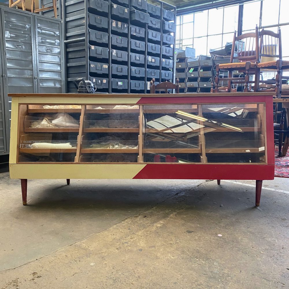 Deze rood met witte toonbank is gemaakt van hout en komt uit Hongarije. De toog is heeft over de gehele lengte aan de voorkant en bovenkant van glas. In de vitrinekast zitten houten uitschuifbare schappen, die aan de achterkant eruit zien als lades. Aan de achterkant dus twaalf lades met dezelfde houten inhammen als greep. Een mooie aanwinst in het interieur van je winkel.