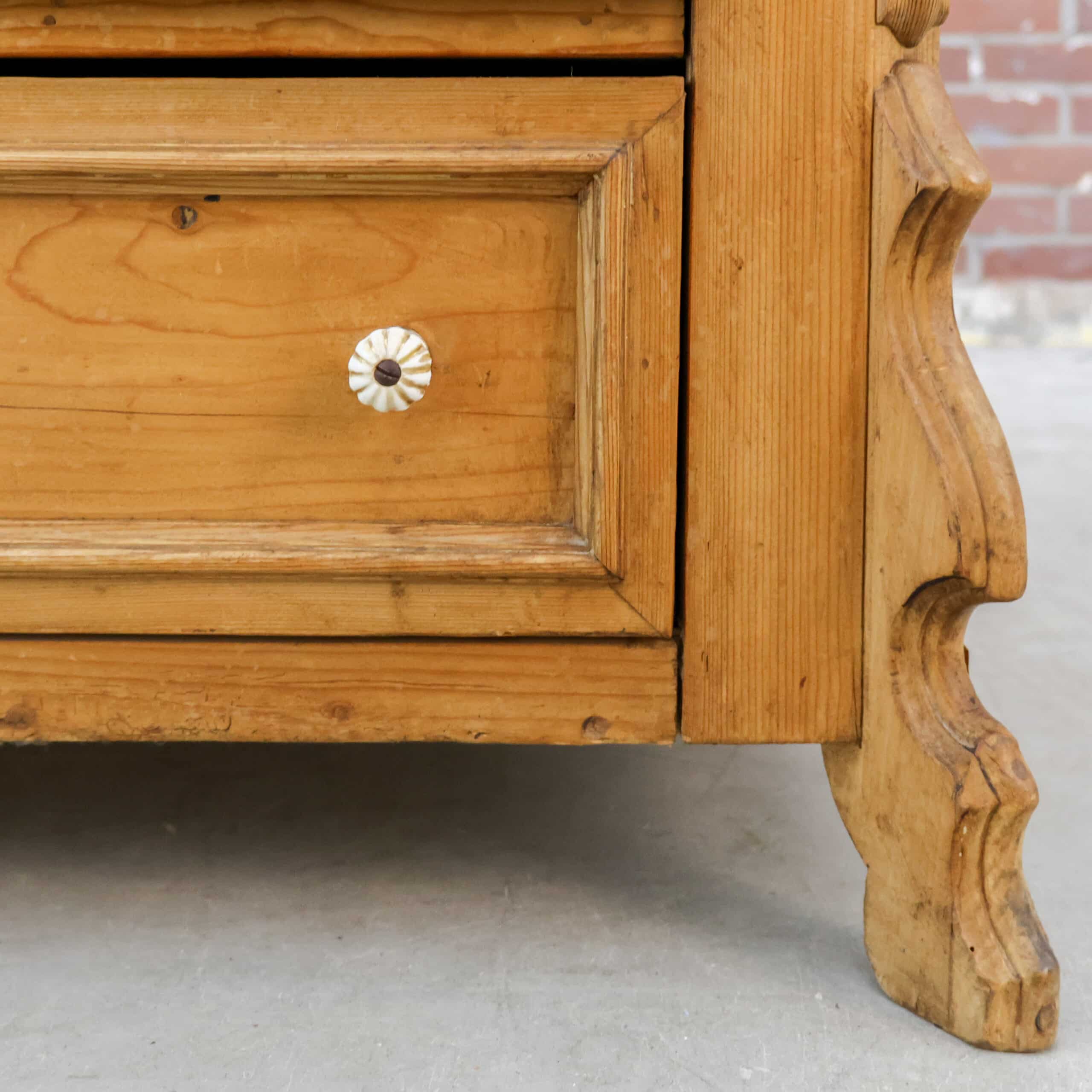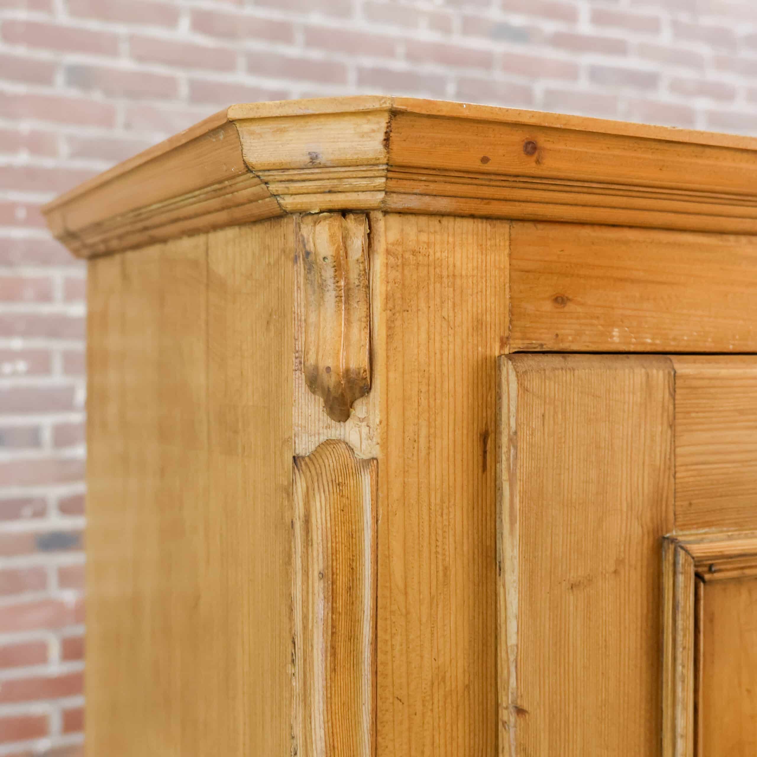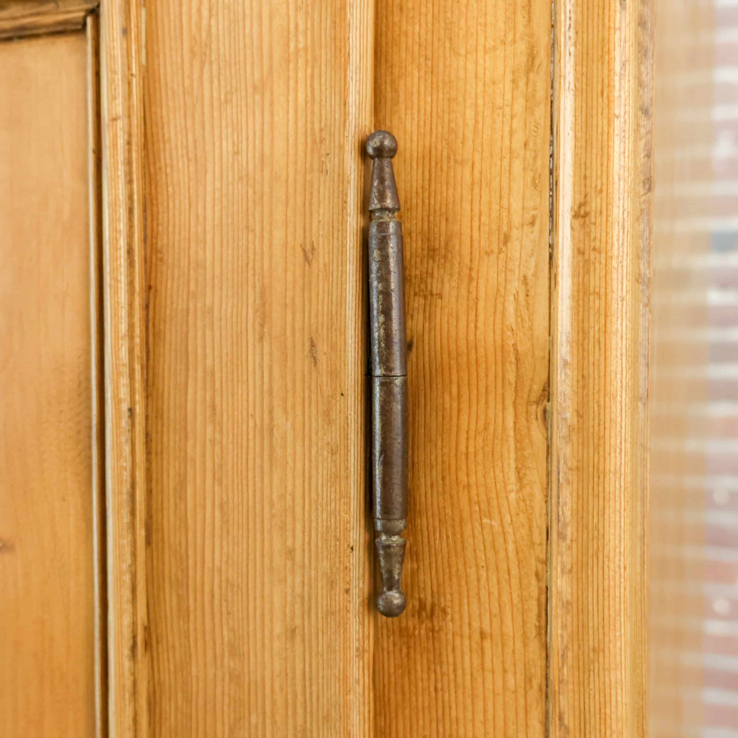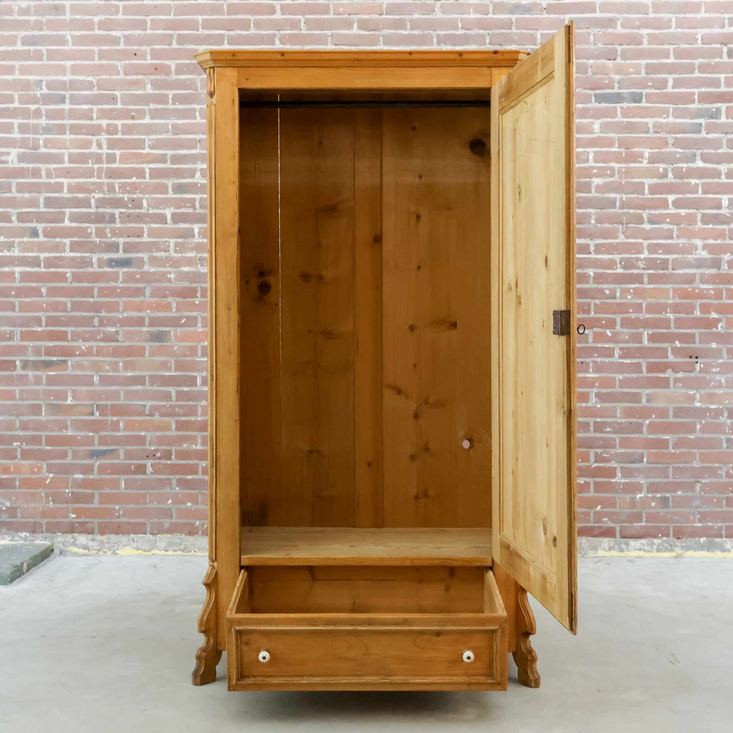Mooie eendeurs linnenkast van massief grenen met een rustige, landelijke uitstraling. Het paneeldeurfront en de robuuste kap geven de kast karakter, terwijl de warme houtkleur en zichtbare noesten zorgen voor een sfeervol, natuurlijk geheel. Binnenin vind je een hangroede, ideaal voor kleding en jassen. Een tijdloos meubel dat zowel in een brocante als modern interieur prachtig tot zijn recht komt.
