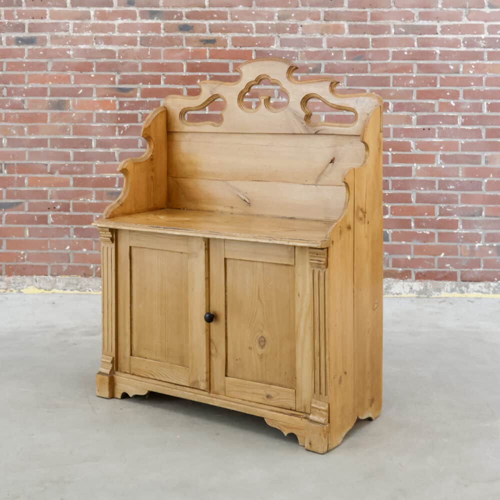 Sfeervol klein grenen gangbankje met opbergruimte. De sierlijke opstaande rand en warme houttint geven dit kastje een zachte landelijke uitstraling. Het hout toont karaktervolle gebruikssporen en prachtige knoesten – een eerlijk en charmant stuk dat meteen sfeer brengt.