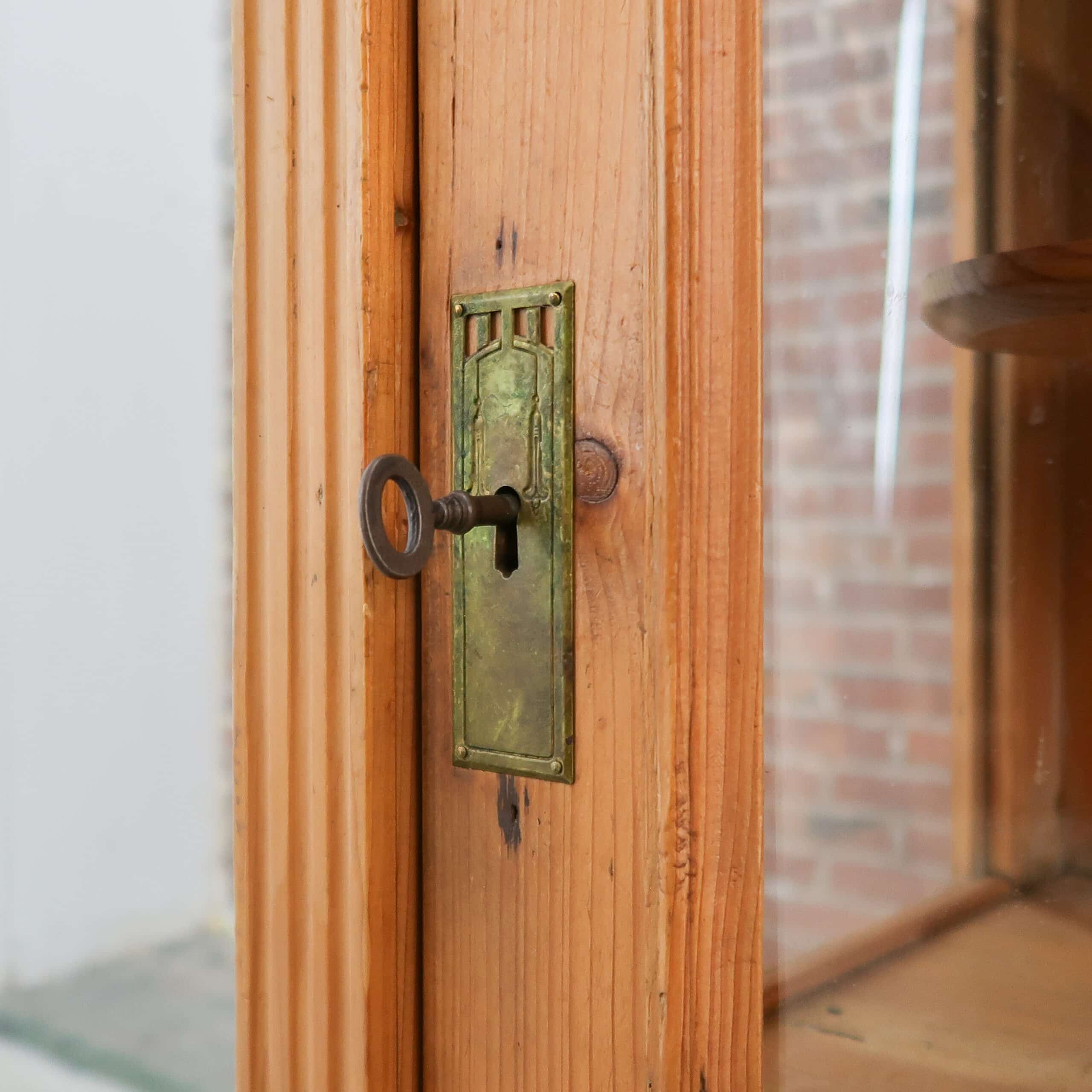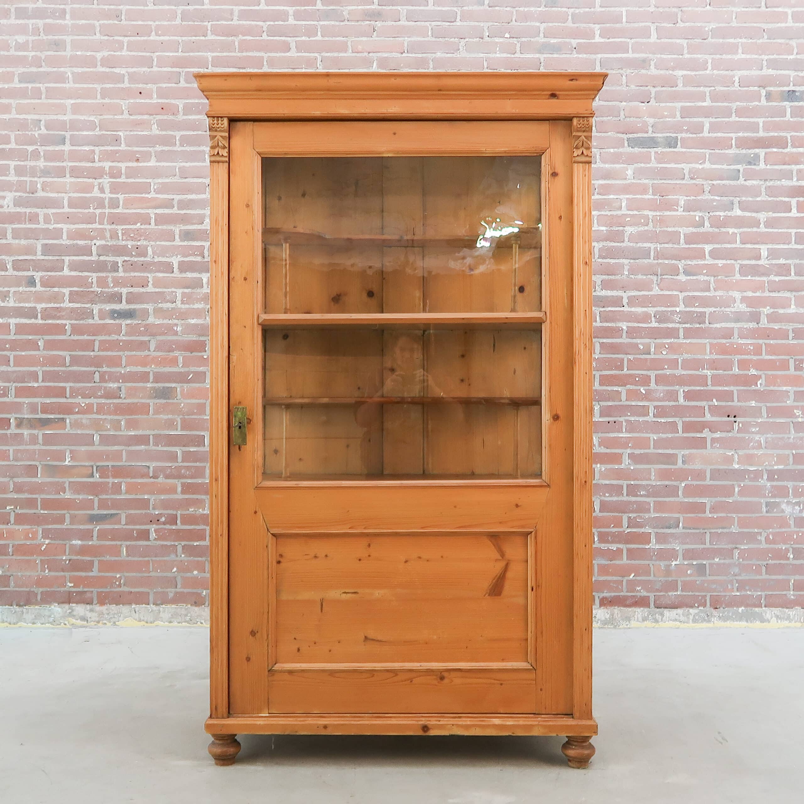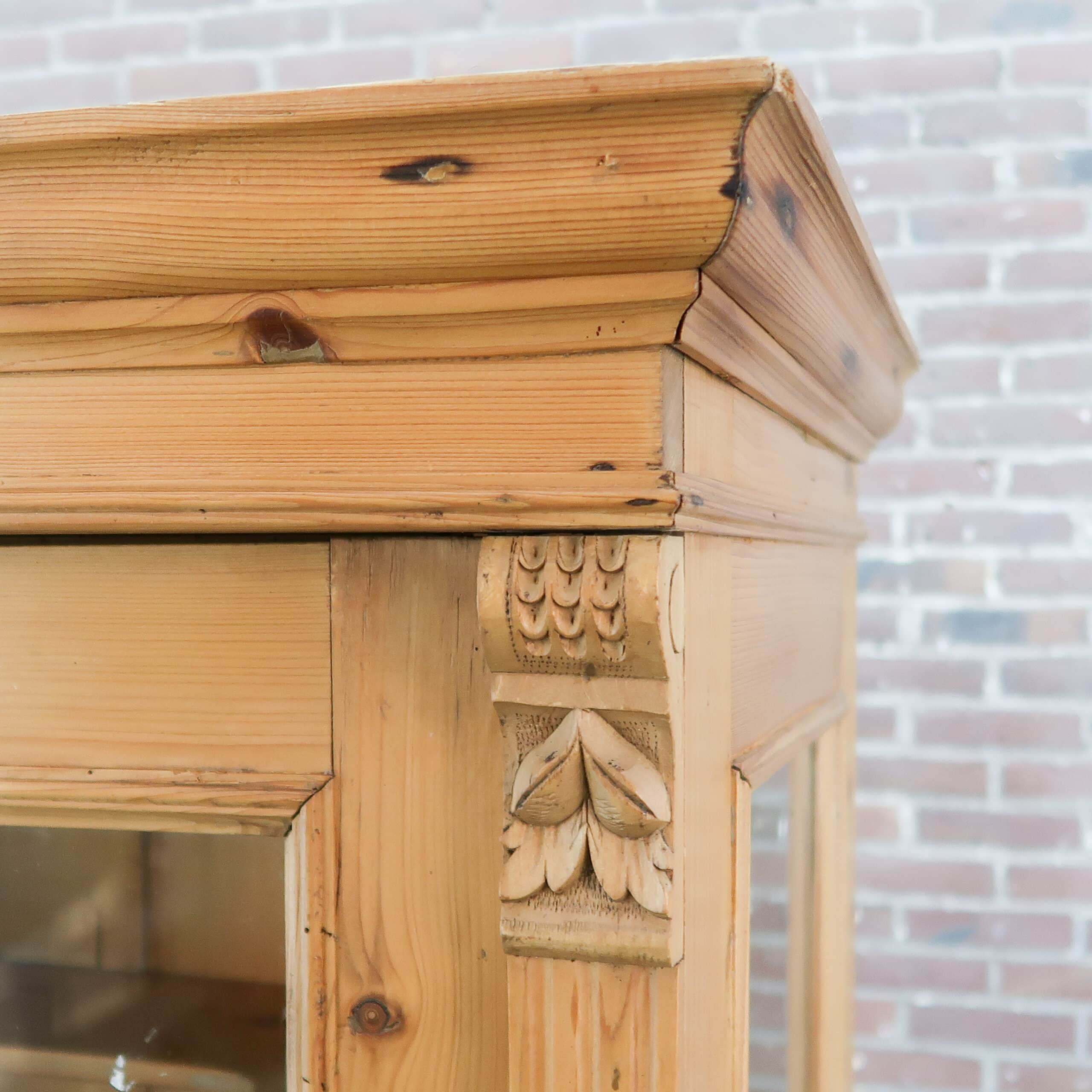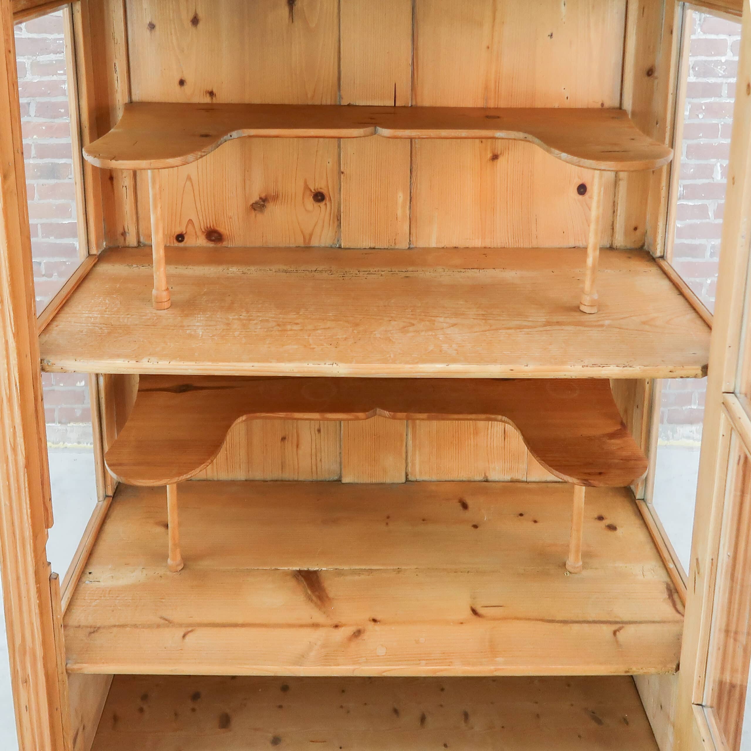 Deze bijzondere antieke grenen vitrinekast heeft rondom glas en een prachtige, hoge kap, waardoor hij een lichte en luchtige uitstraling krijgt. Binnenin vind je de originele sierplanken met gedraaide pootjes — ideaal voor servies, kleding, deco of je mooiste vondsten. Het hout toont doorleefde details en het glas is authentiek getrokken.