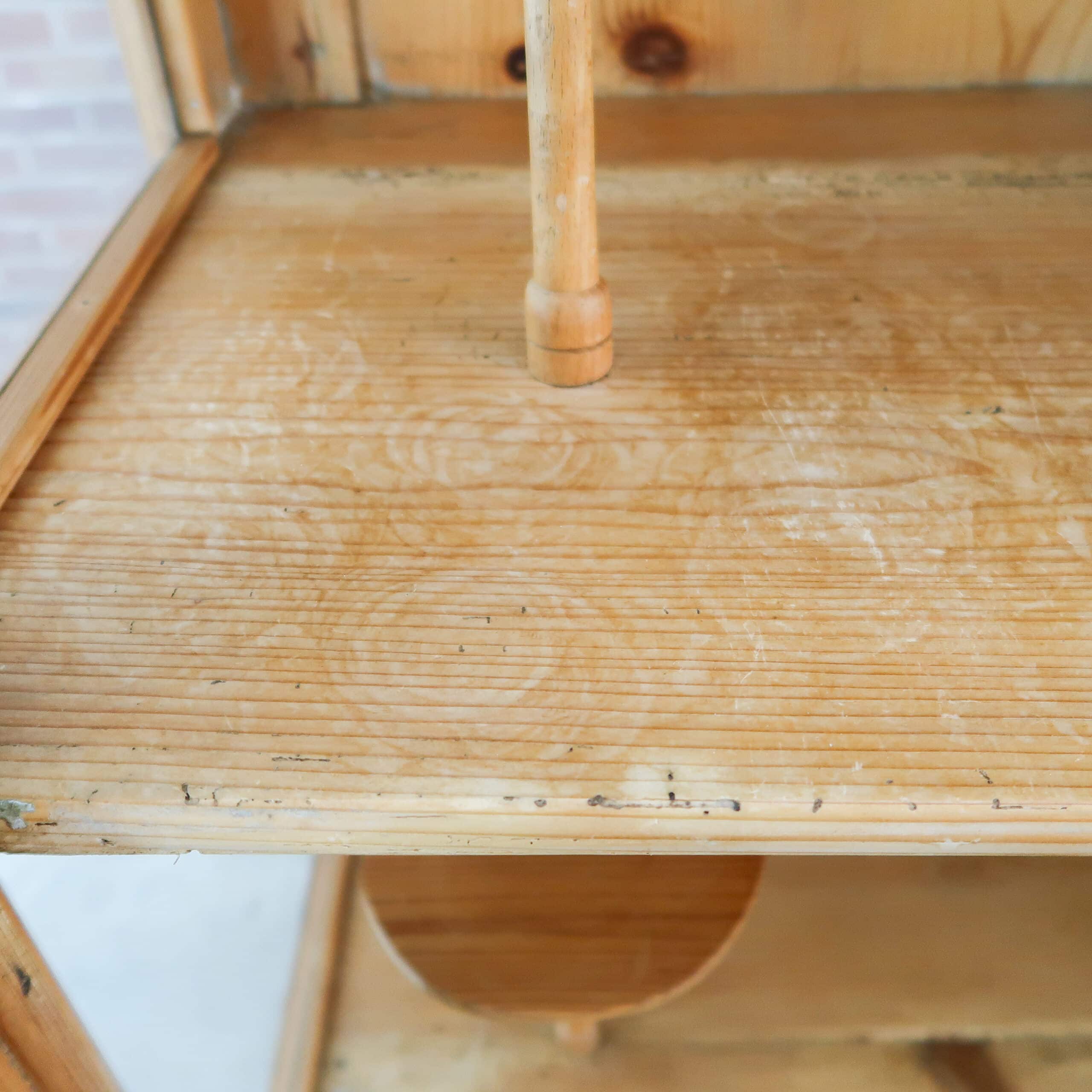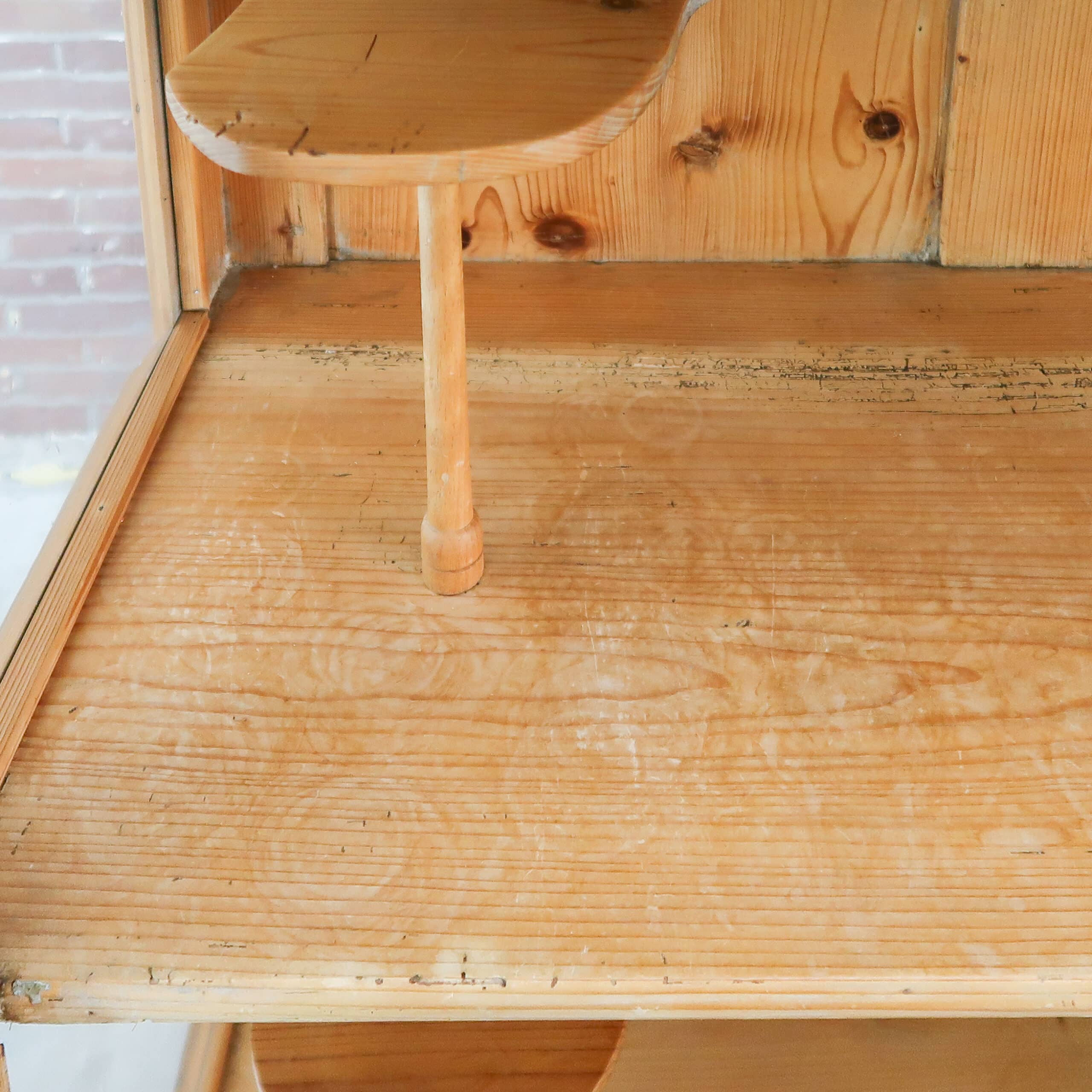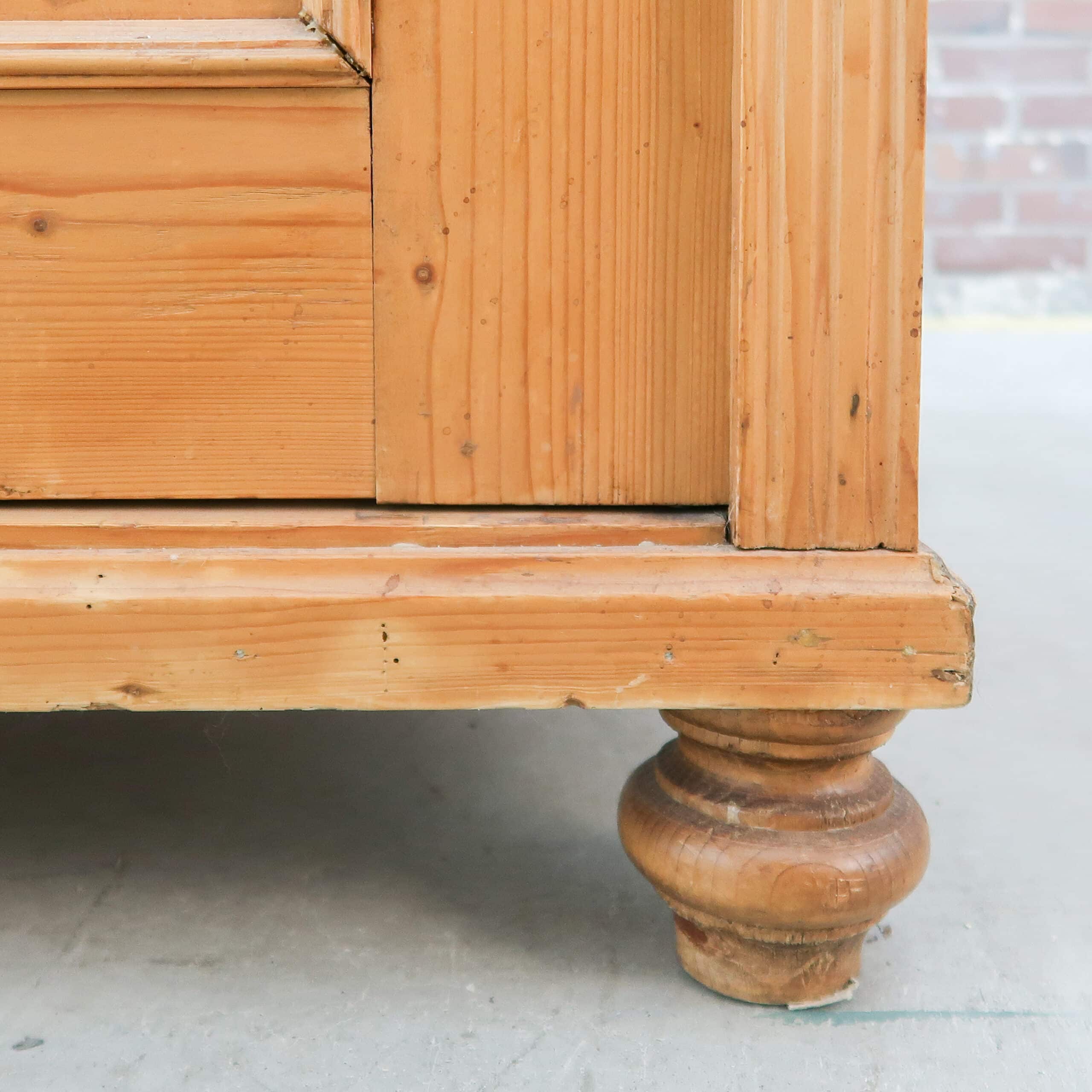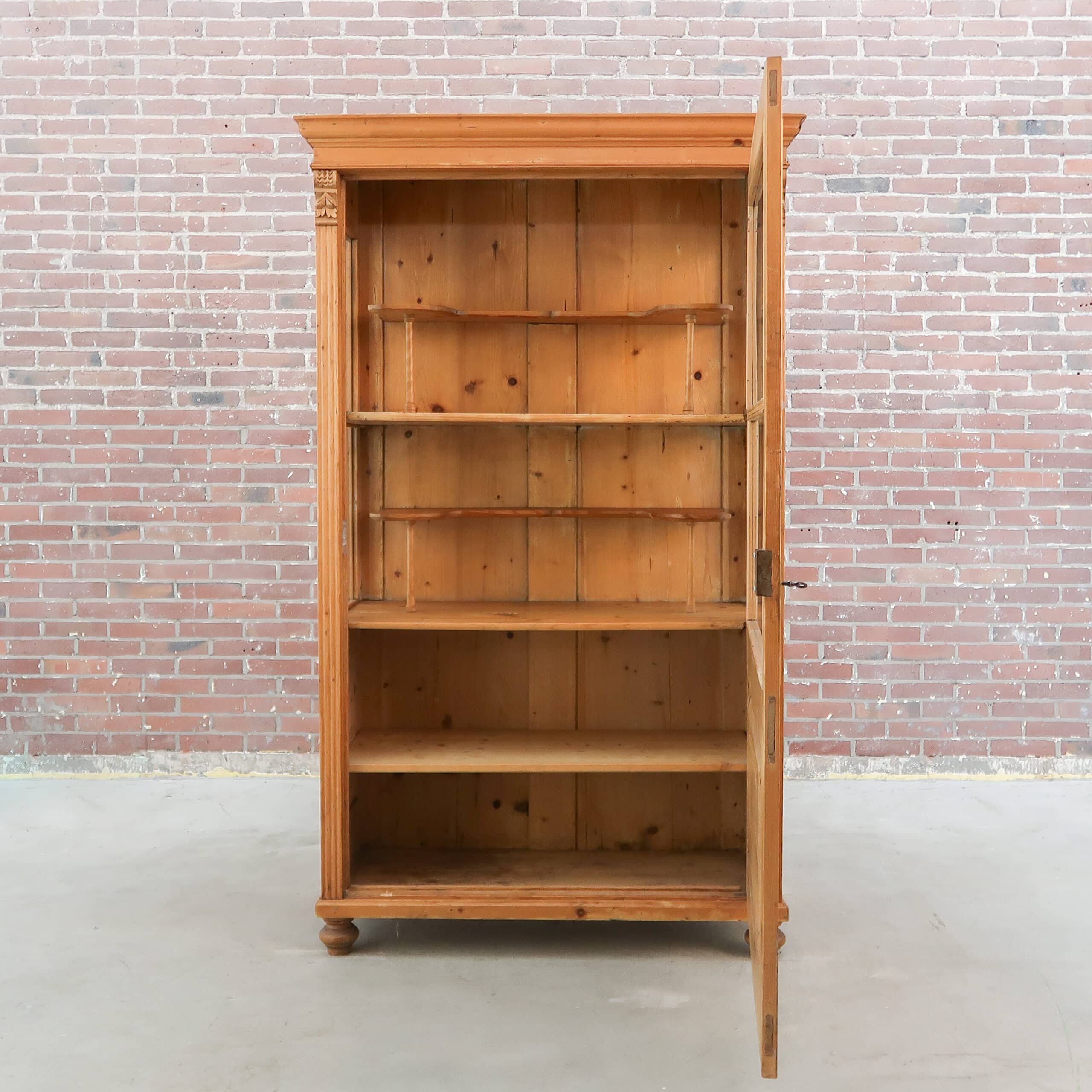 Deze bijzondere antieke grenen vitrinekast heeft rondom glas en een prachtige, hoge kap, waardoor hij een lichte en luchtige uitstraling krijgt. Binnenin vind je de originele sierplanken met gedraaide pootjes — ideaal voor servies, kleding, deco of je mooiste vondsten. Het hout toont doorleefde details en het glas is authentiek getrokken.