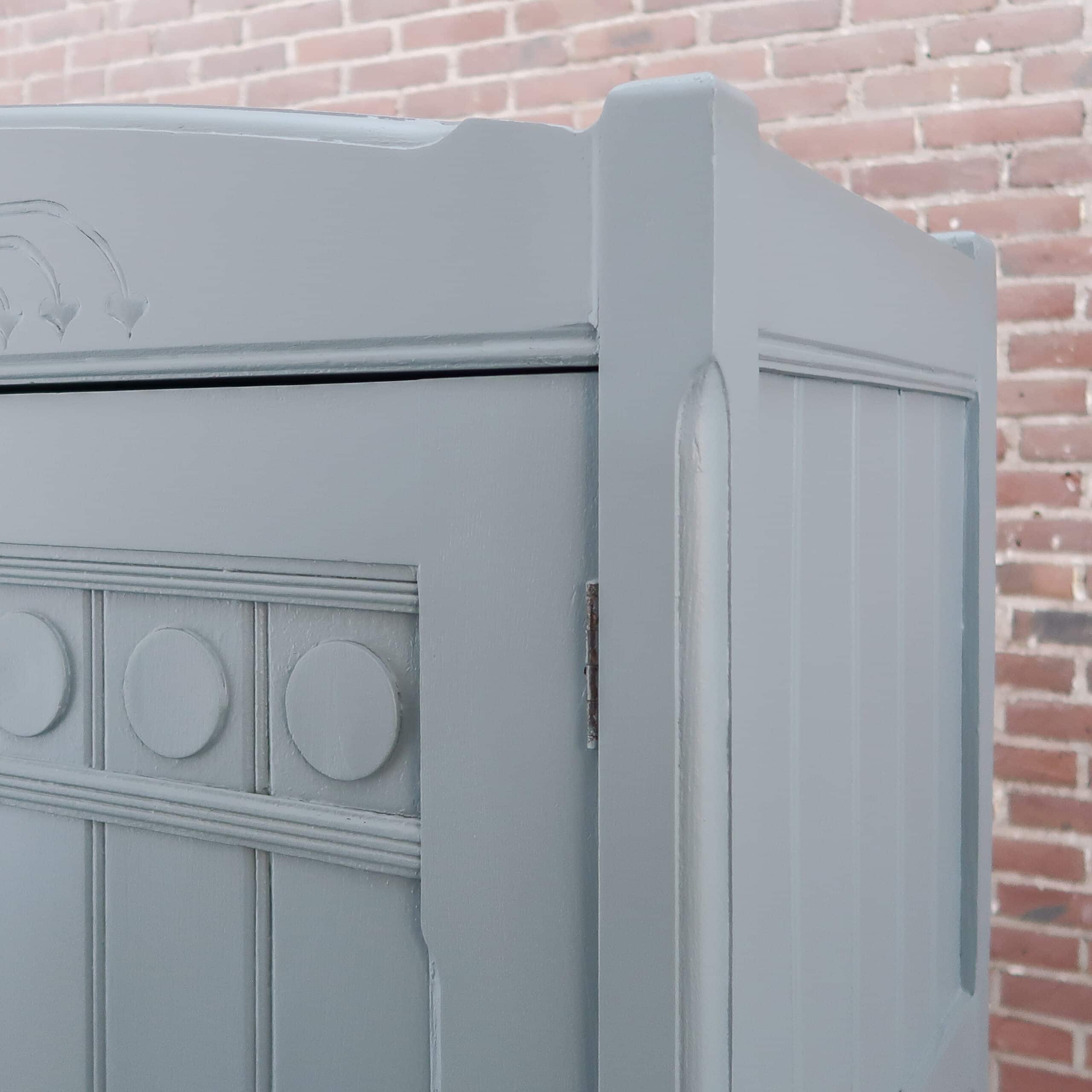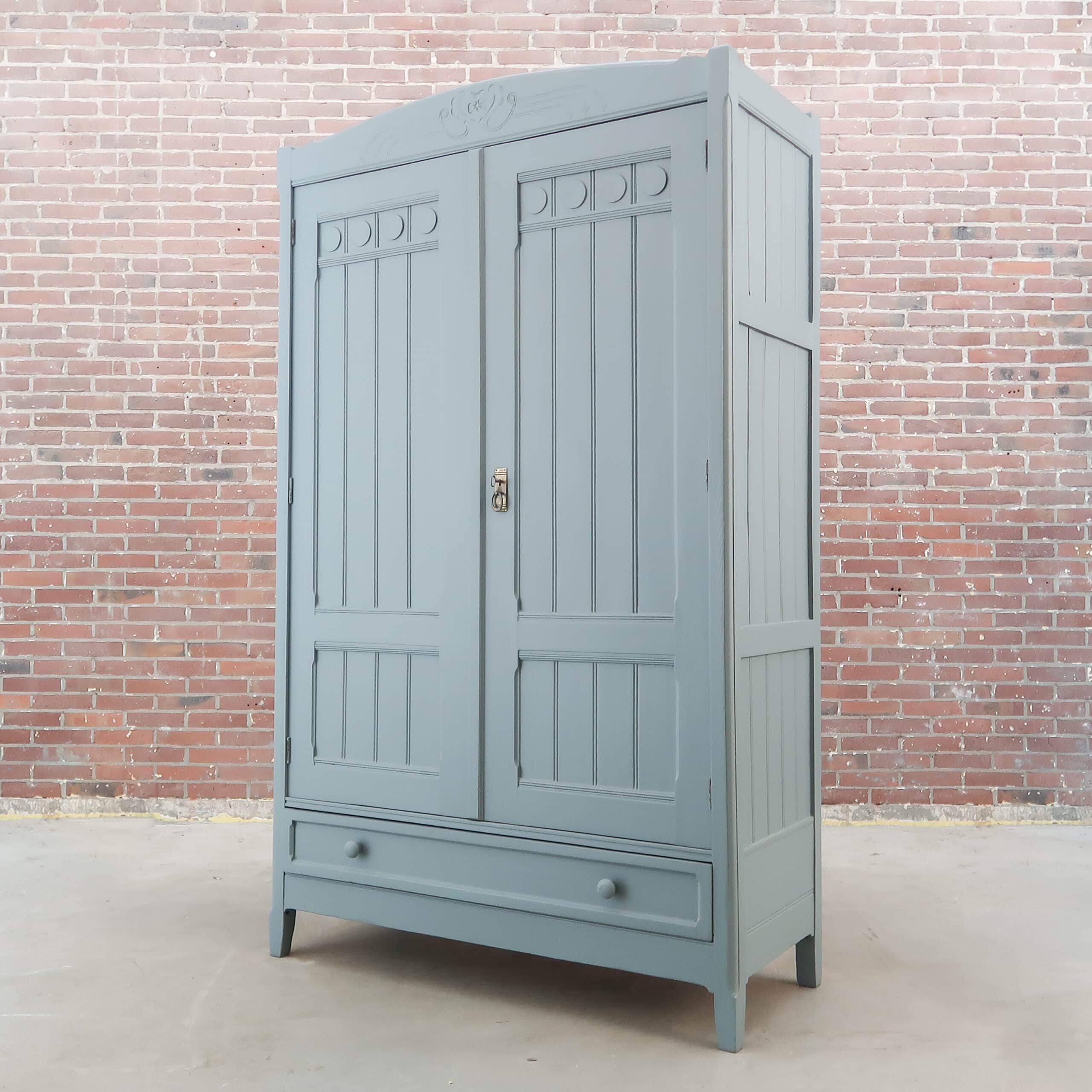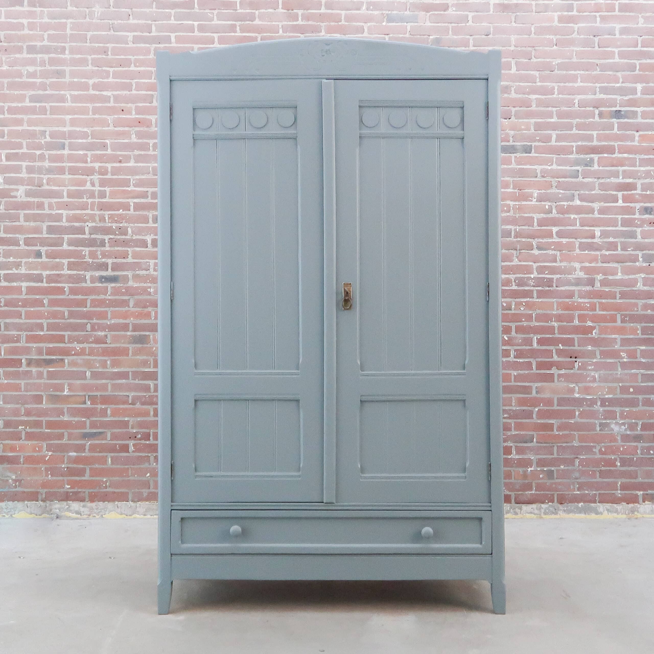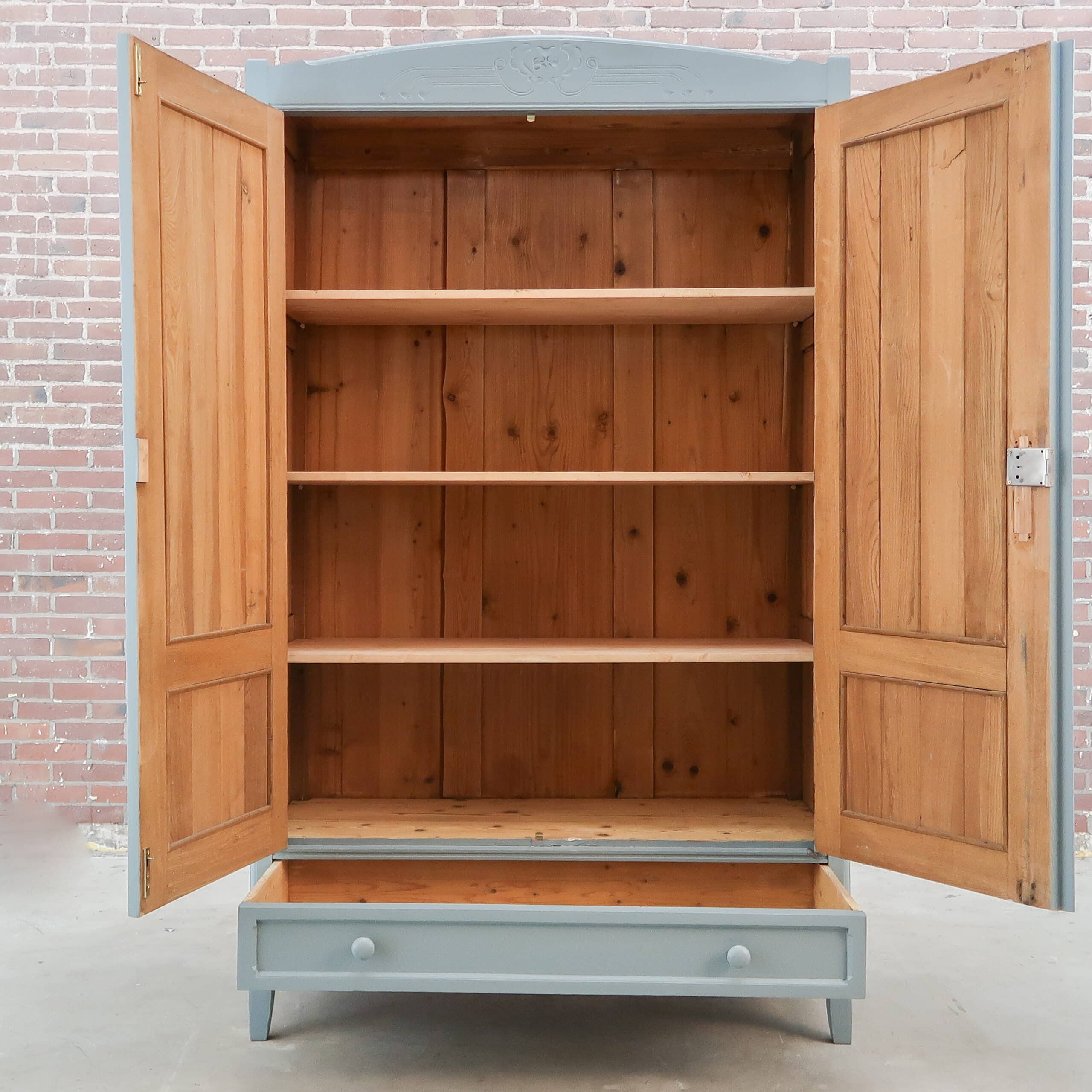 Wederom een prachtige grijze kledingkast uit Hongarije! We hebben haar opgeknapt waar nodig, zo heeft ze naast nieuwe planken ook een zacht grijs kleurtje gekregen.