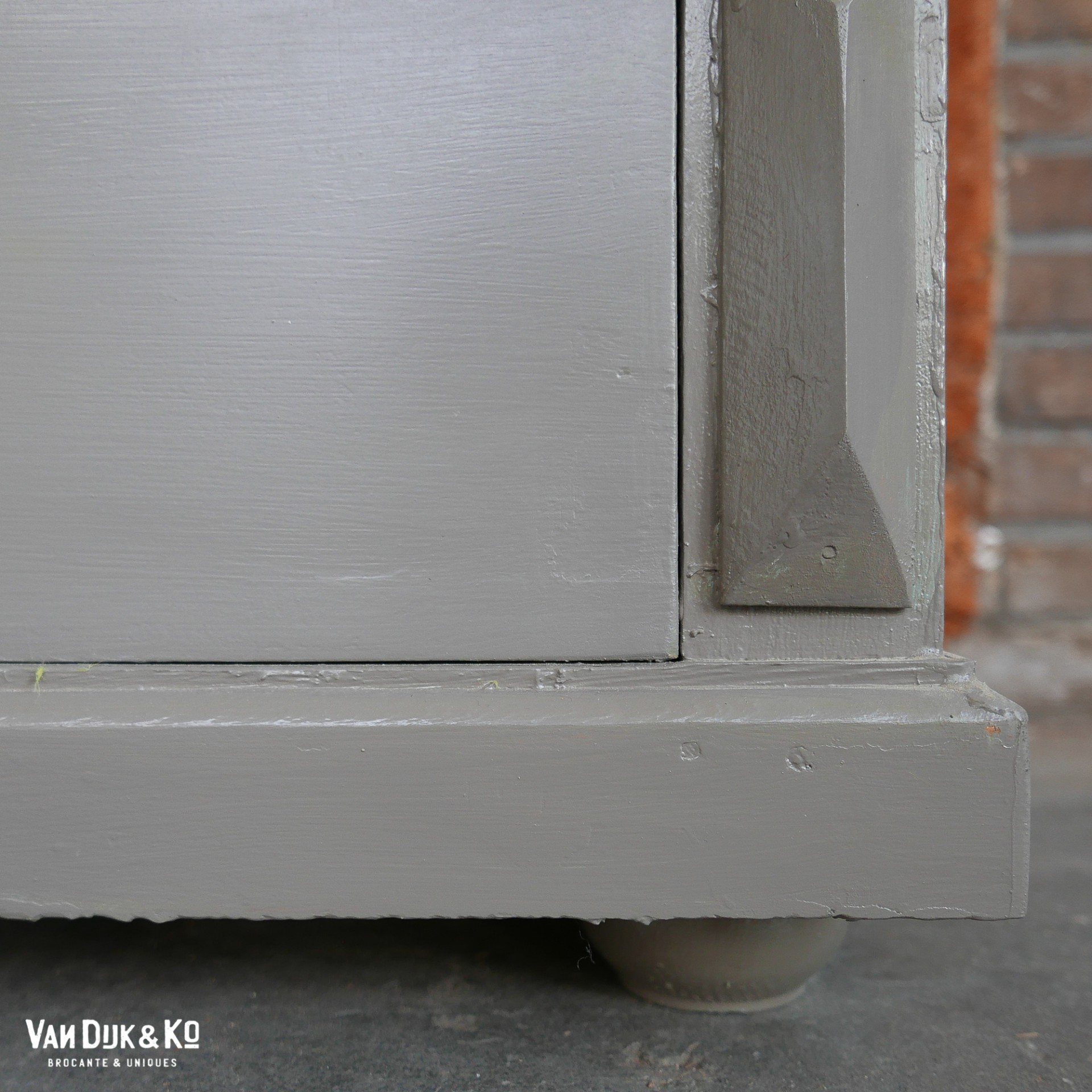 Deze brocante boekenkast is gemaakt van hout. De kast is aan de buitenkant grijs geschilderd en heeft sierlijke krullen aan de zijkanten. De kast is een open kast zonder deuren. De binnenkant van de kast heeft drie houten planken. Onderin heeft de kast een brede lade met twee metalen grepen.