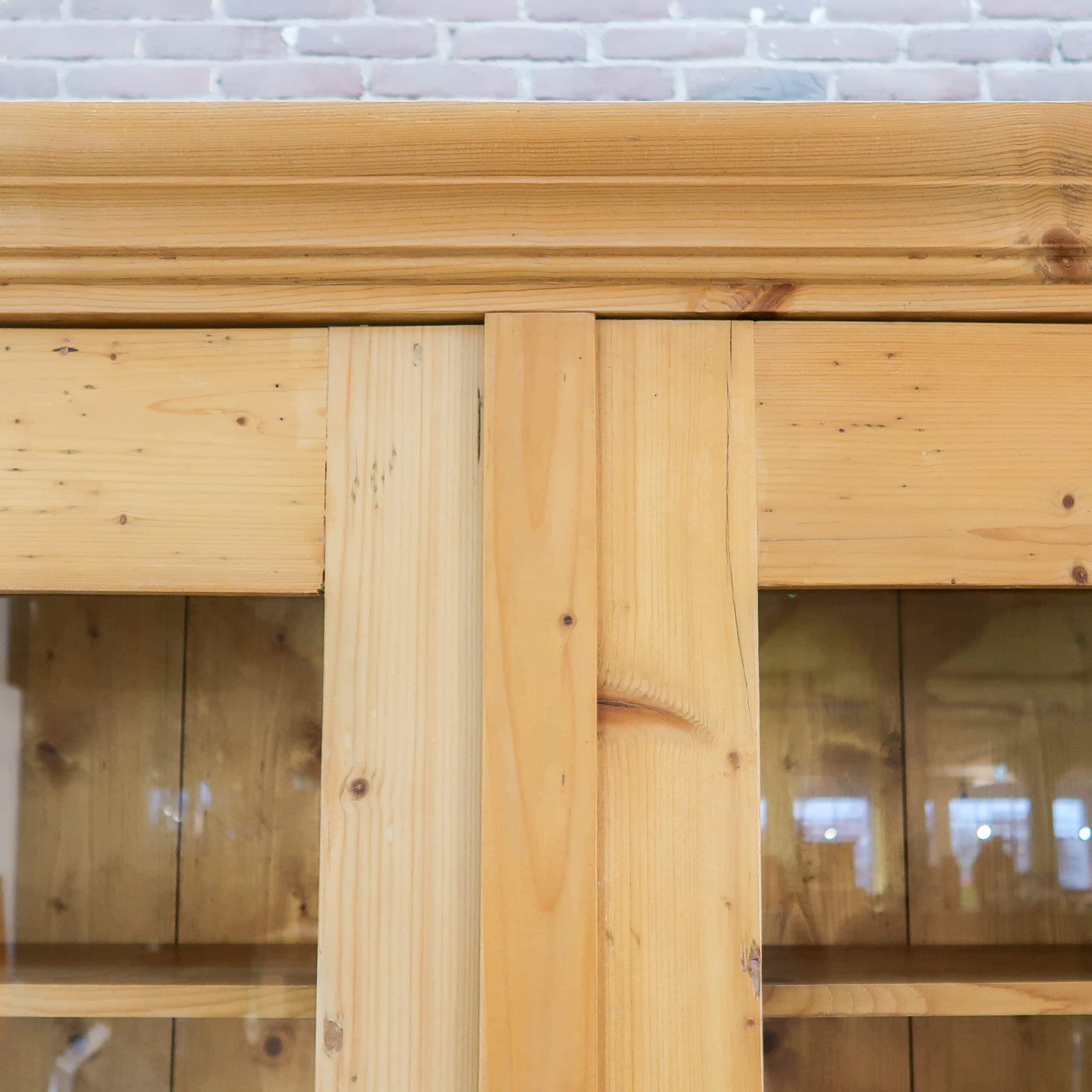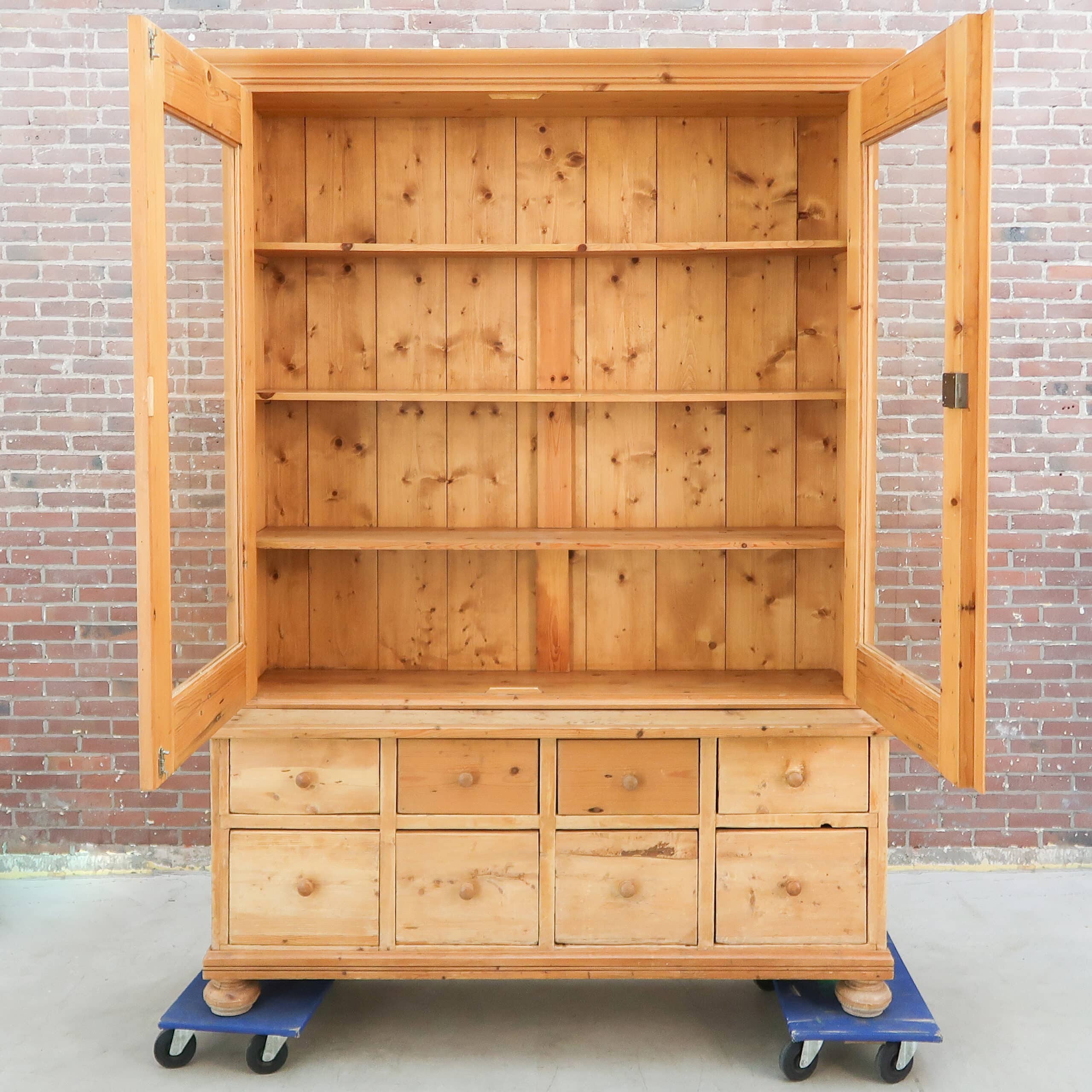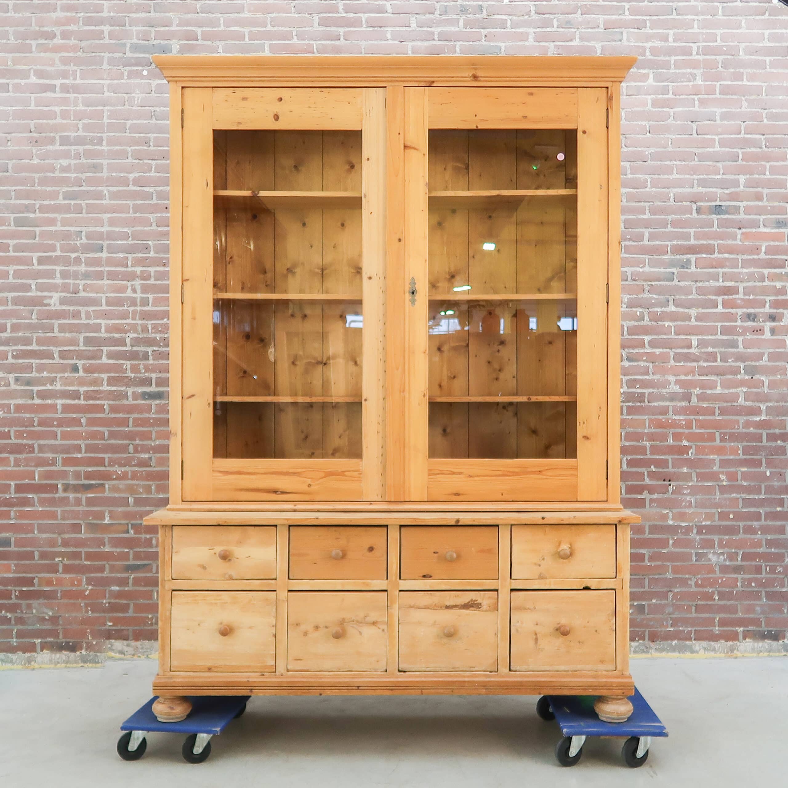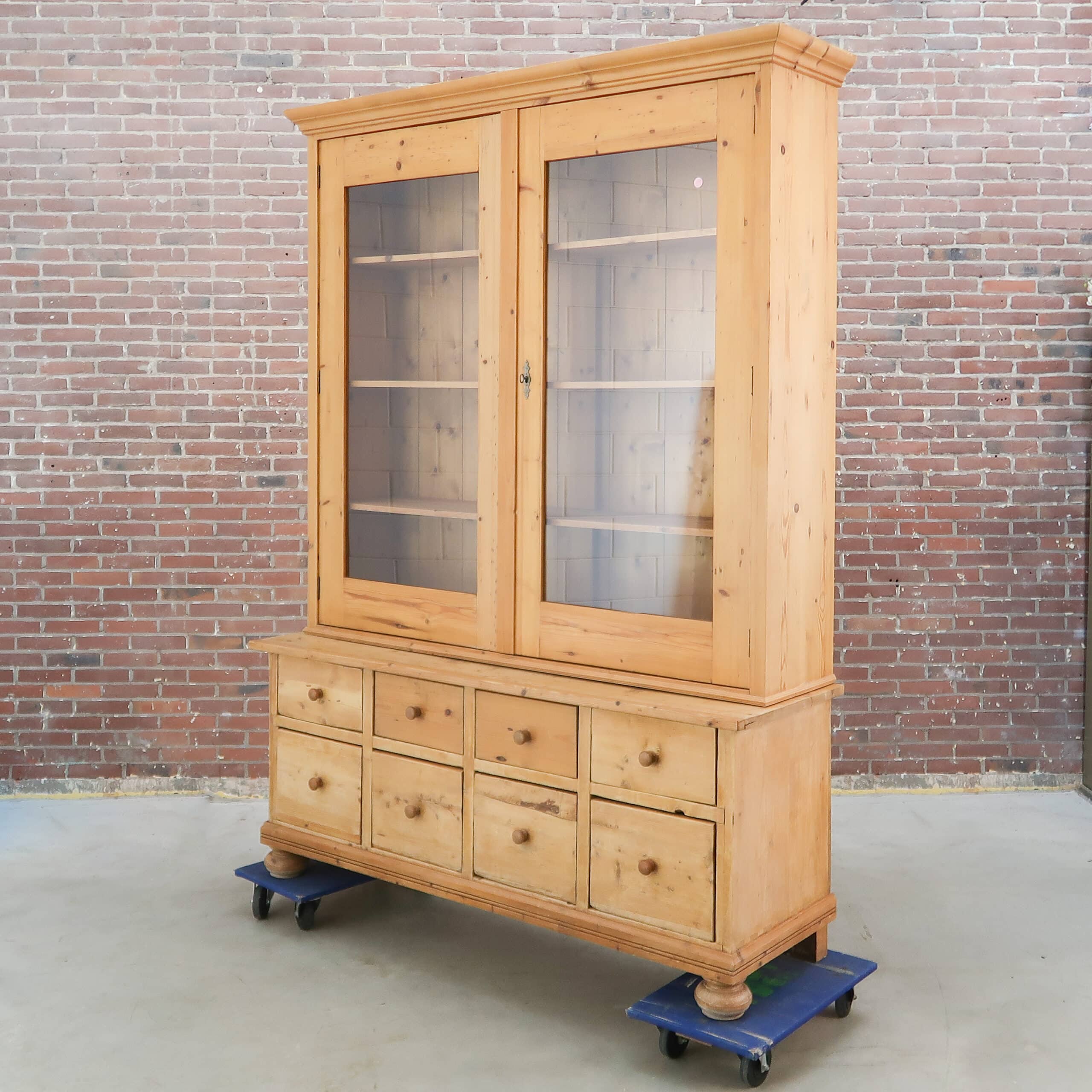 Prachtige oude grenen buffetkast, een stoer en authentiek meubel met veel karakter. De kast bestaat uit een bovenkast met glasdeuren en ruime legplanken, perfect om servies of decoratieve stukken in te tonen. Het onderste deel biedt extra opbergruimte met 8 lades. Door het doorleefde hout en de warme uitstraling past deze kast prachtig in zowel een landelijk als een brocante interieur.