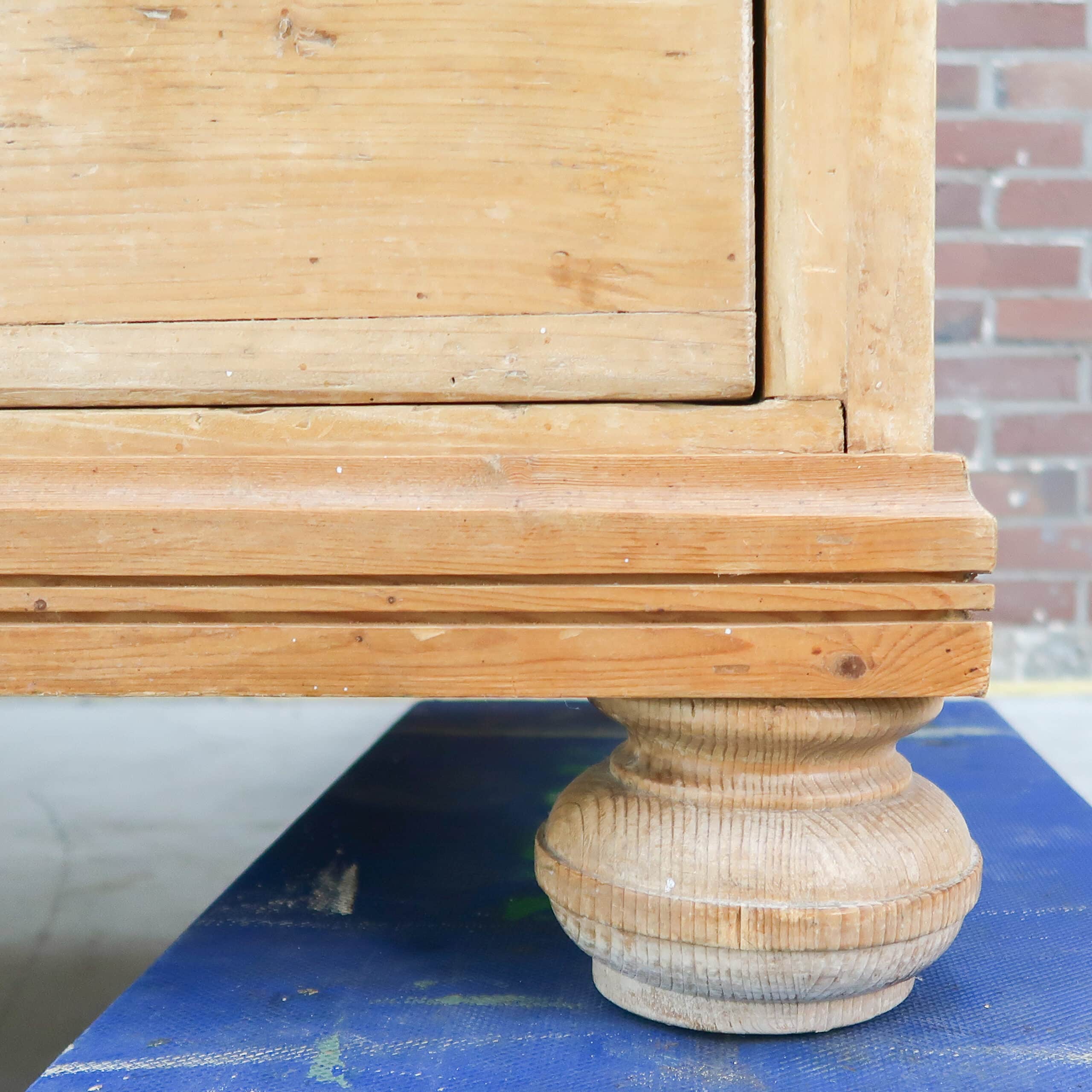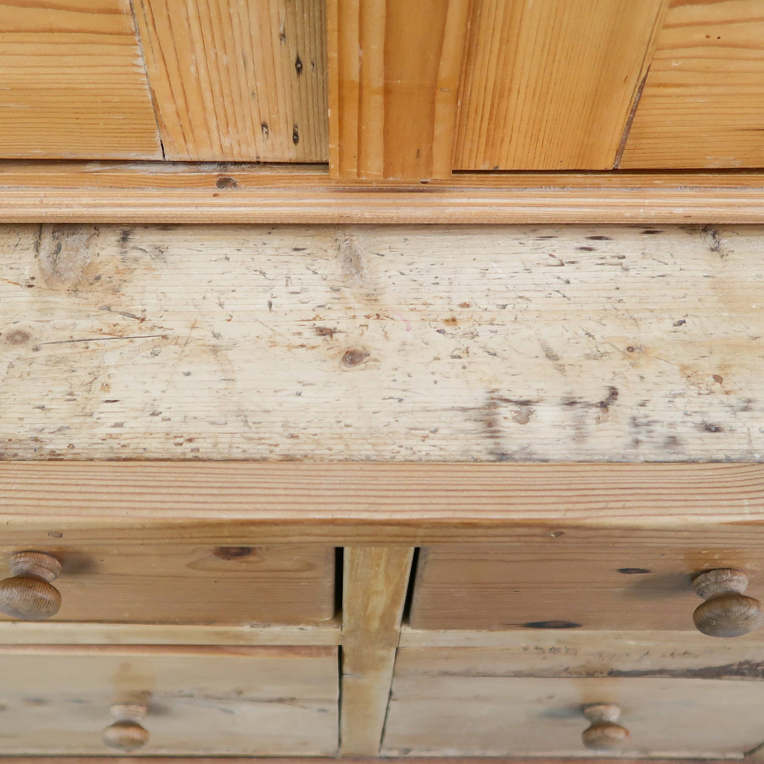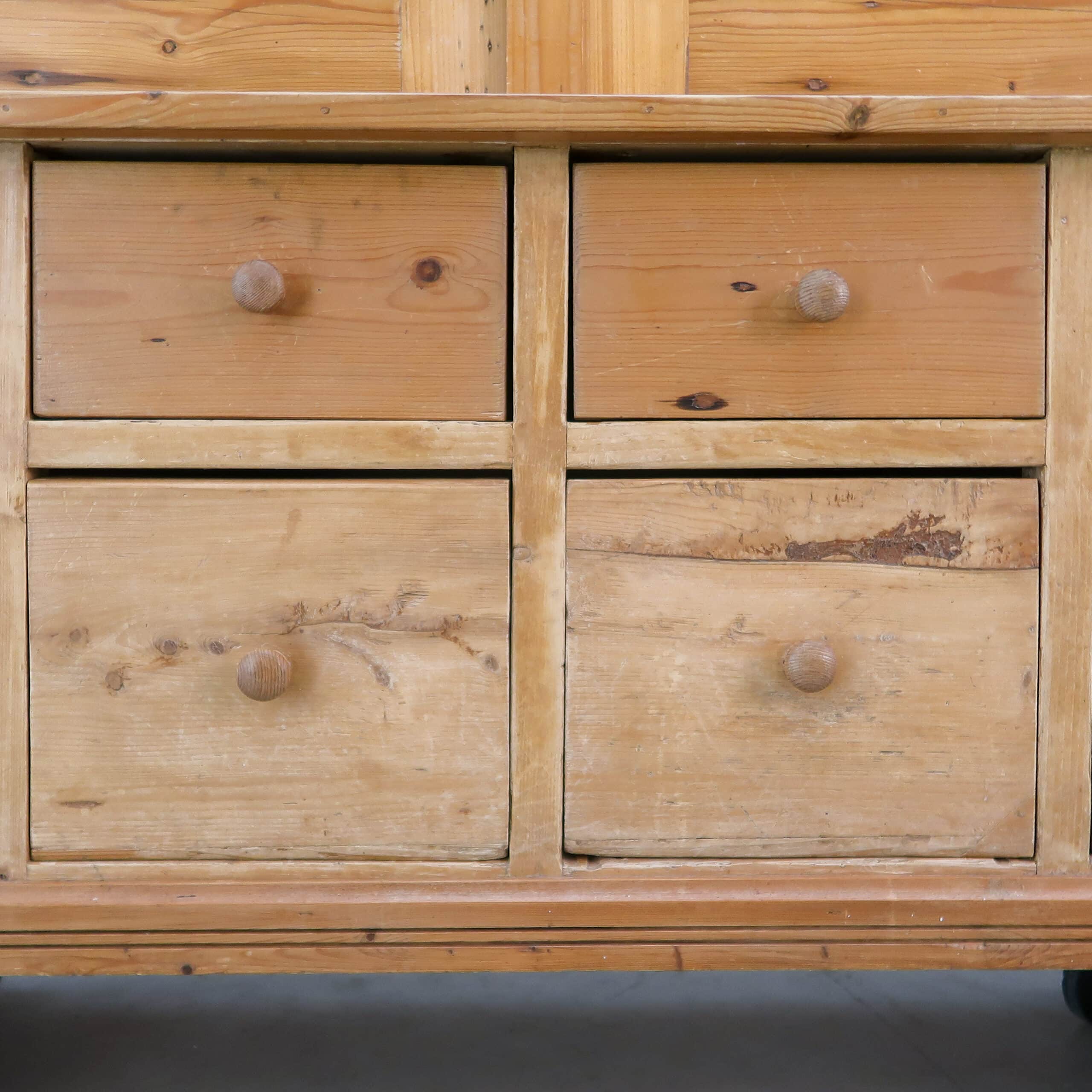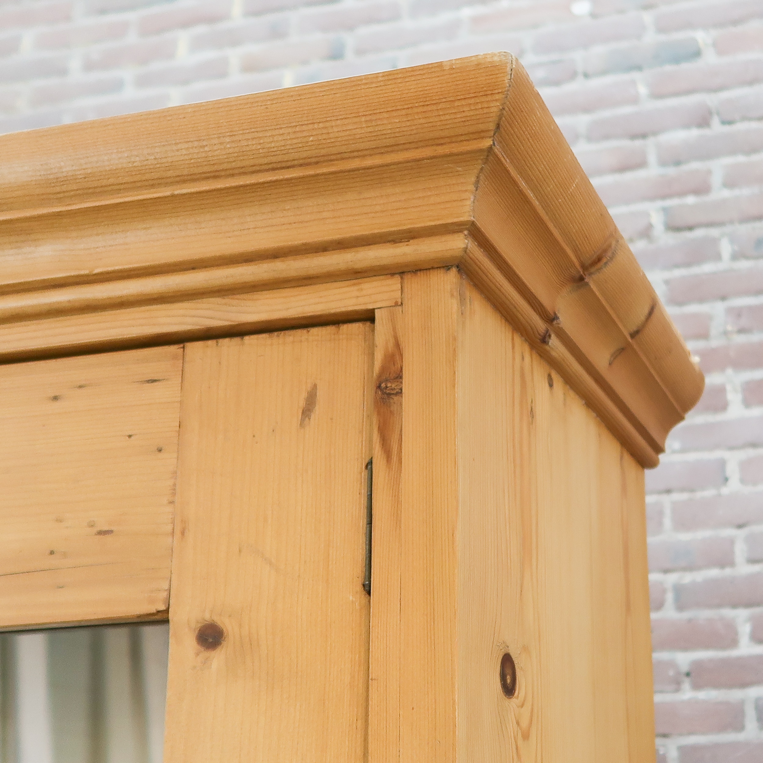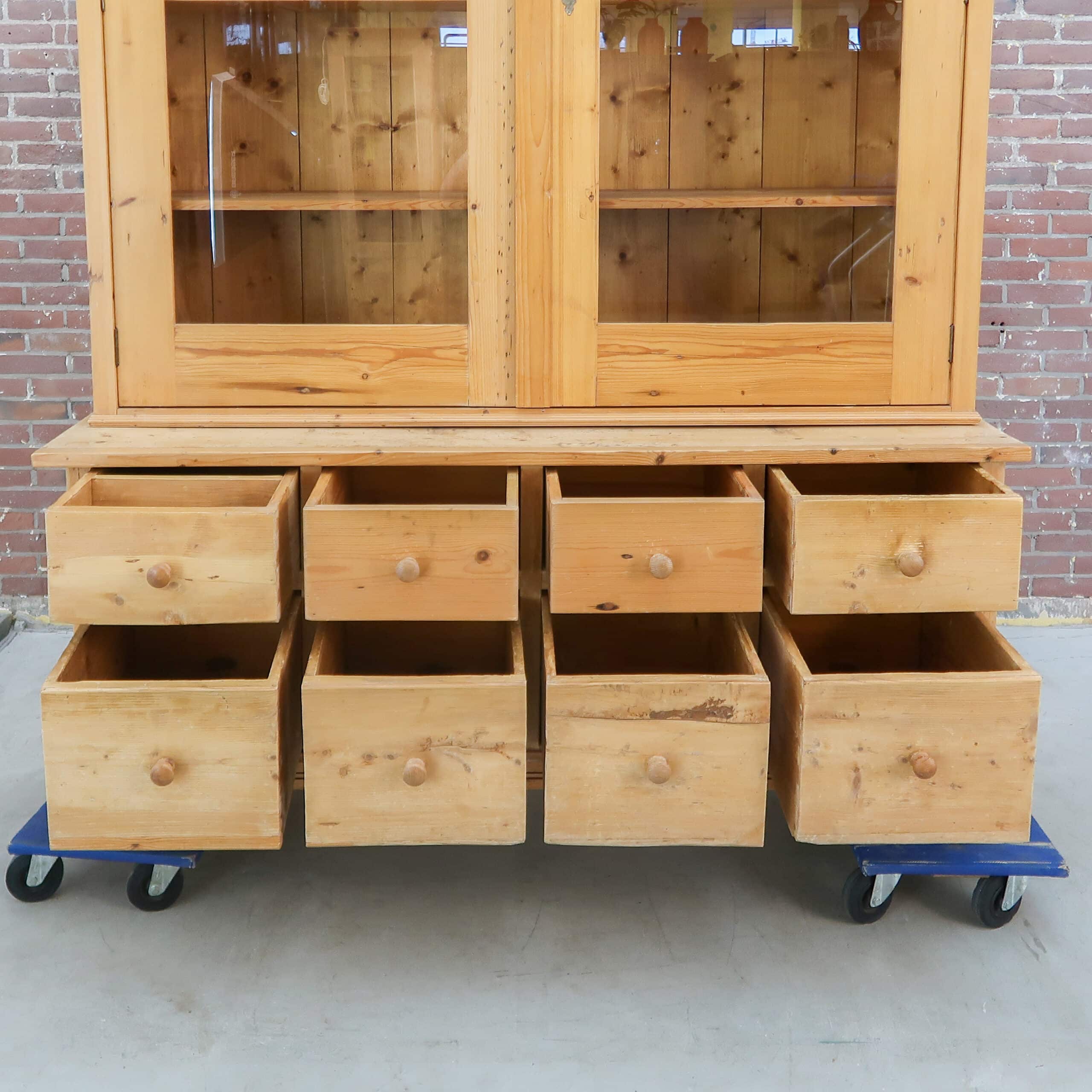 Prachtige oude grenen buffetkast, een stoer en authentiek meubel met veel karakter. De kast bestaat uit een bovenkast met glasdeuren en ruime legplanken, perfect om servies of decoratieve stukken in te tonen. Het onderste deel biedt extra opbergruimte met 8 lades. Door het doorleefde hout en de warme uitstraling past deze kast prachtig in zowel een landelijk als een brocante interieur.