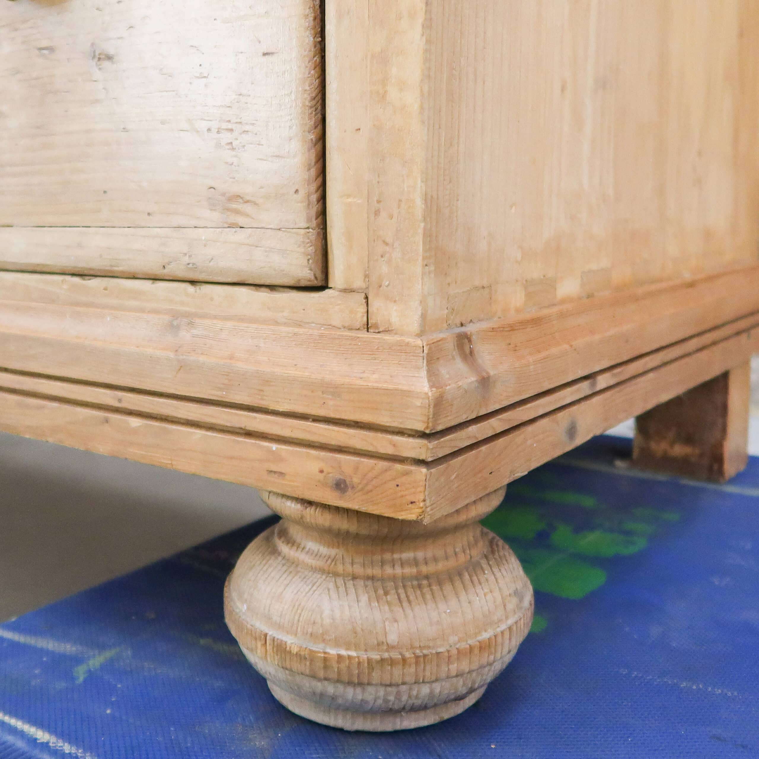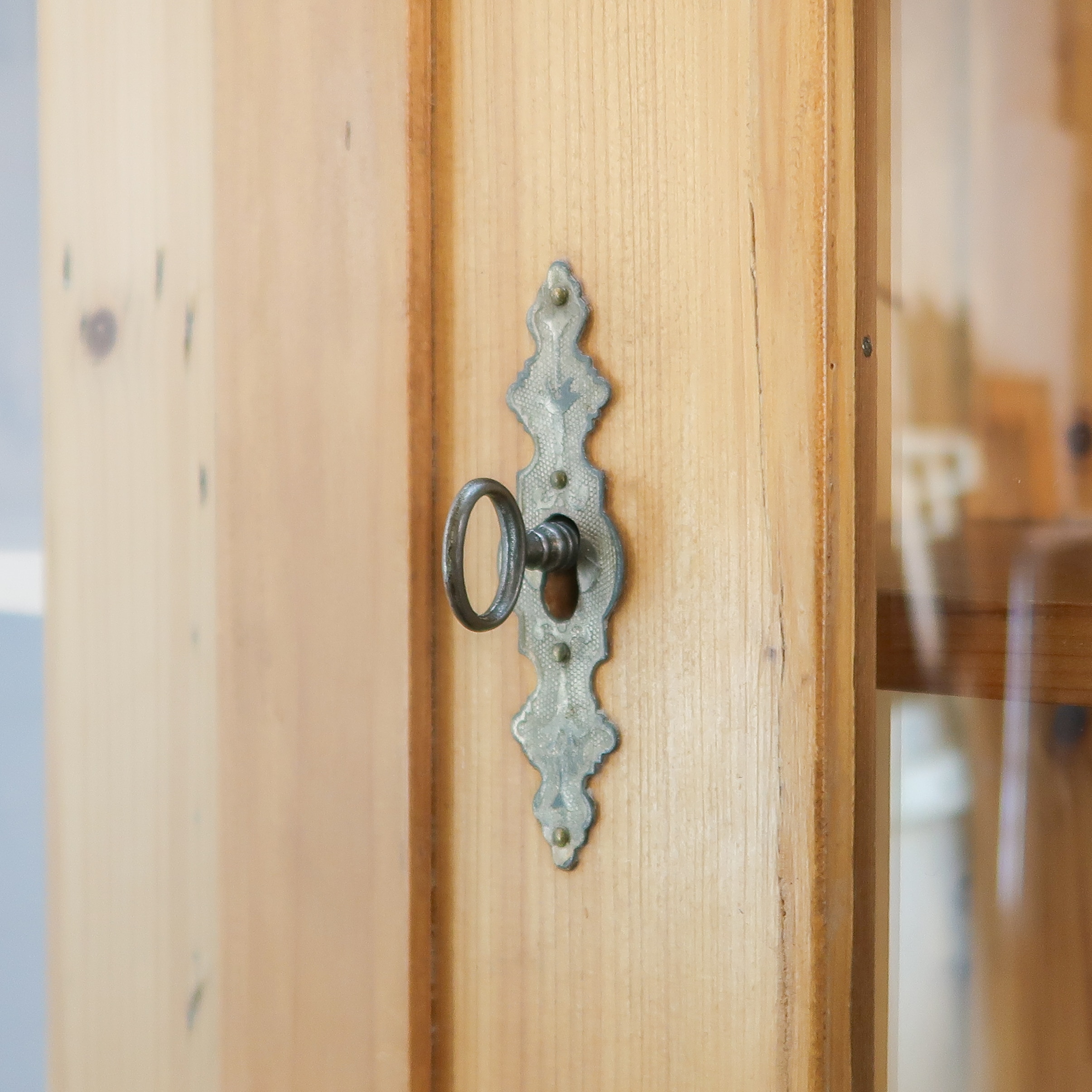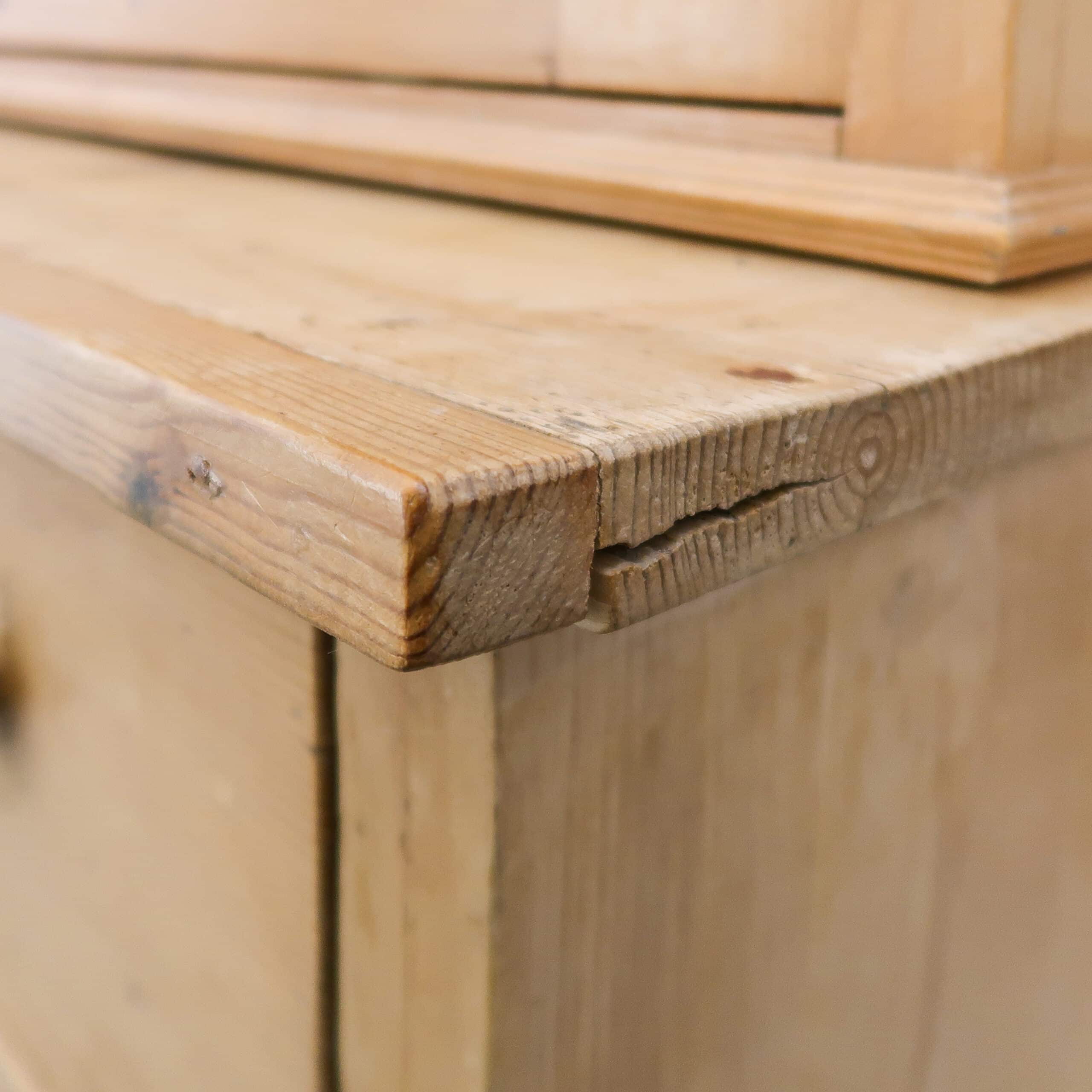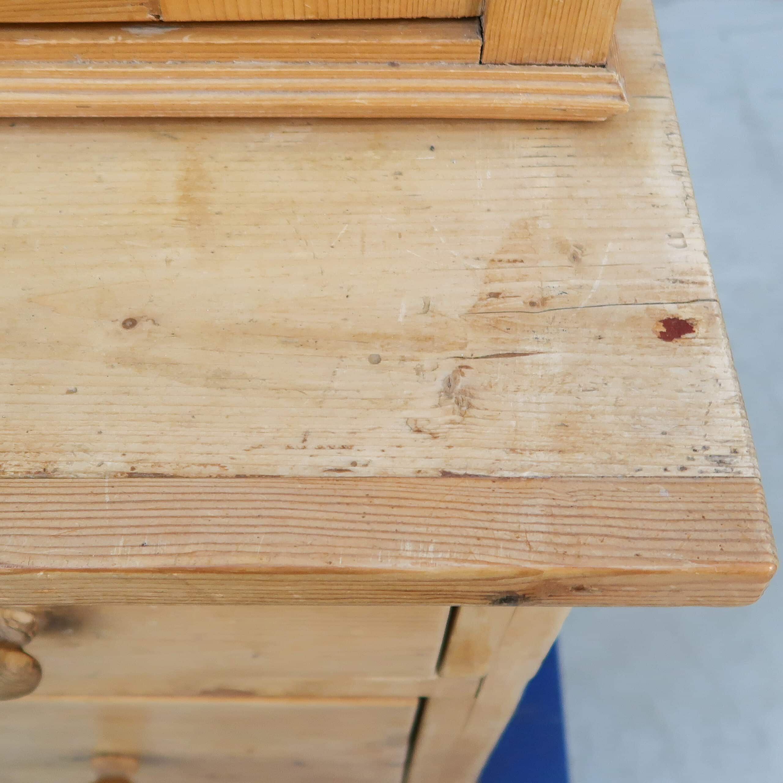 Prachtige oude grenen buffetkast, een stoer en authentiek meubel met veel karakter. De kast bestaat uit een bovenkast met glasdeuren en ruime legplanken, perfect om servies of decoratieve stukken in te tonen. Het onderste deel biedt extra opbergruimte met 8 lades. Door het doorleefde hout en de warme uitstraling past deze kast prachtig in zowel een landelijk als een brocante interieur.