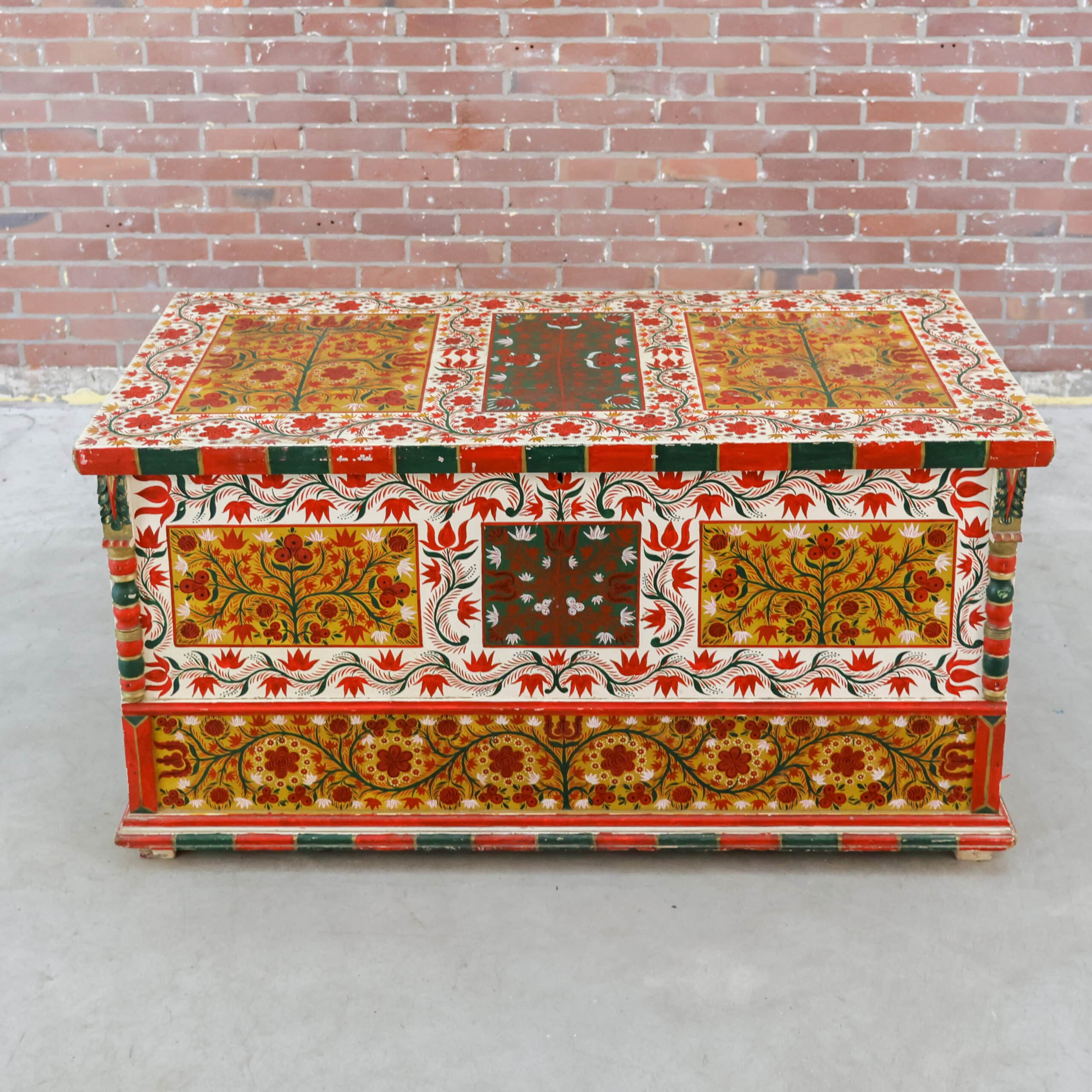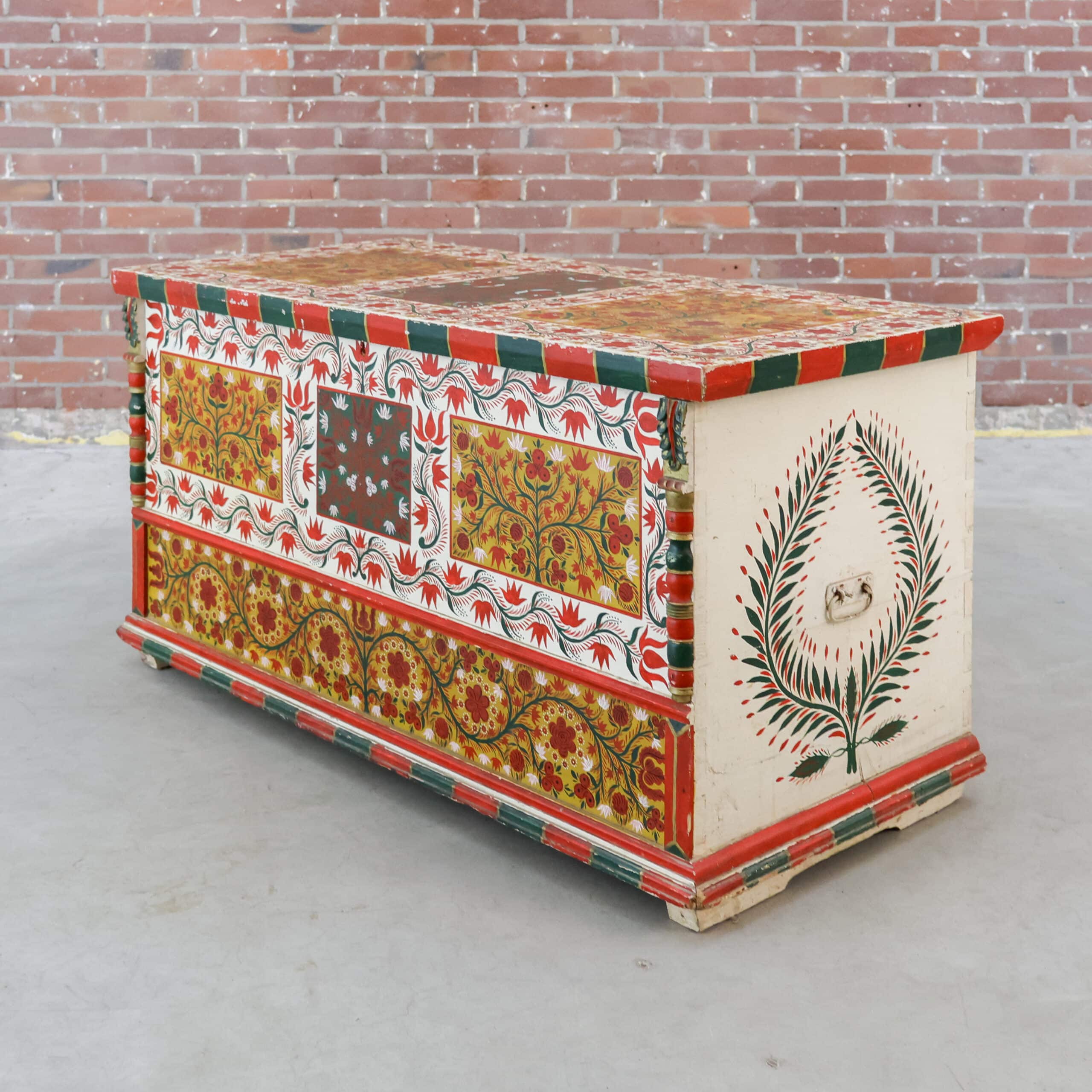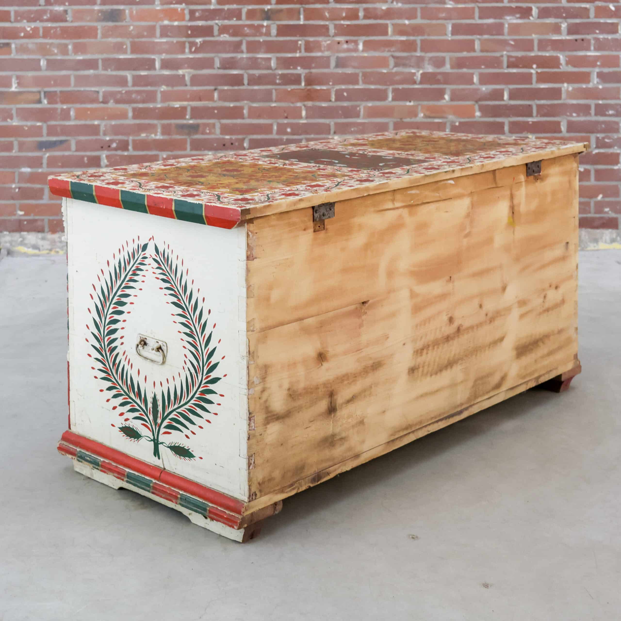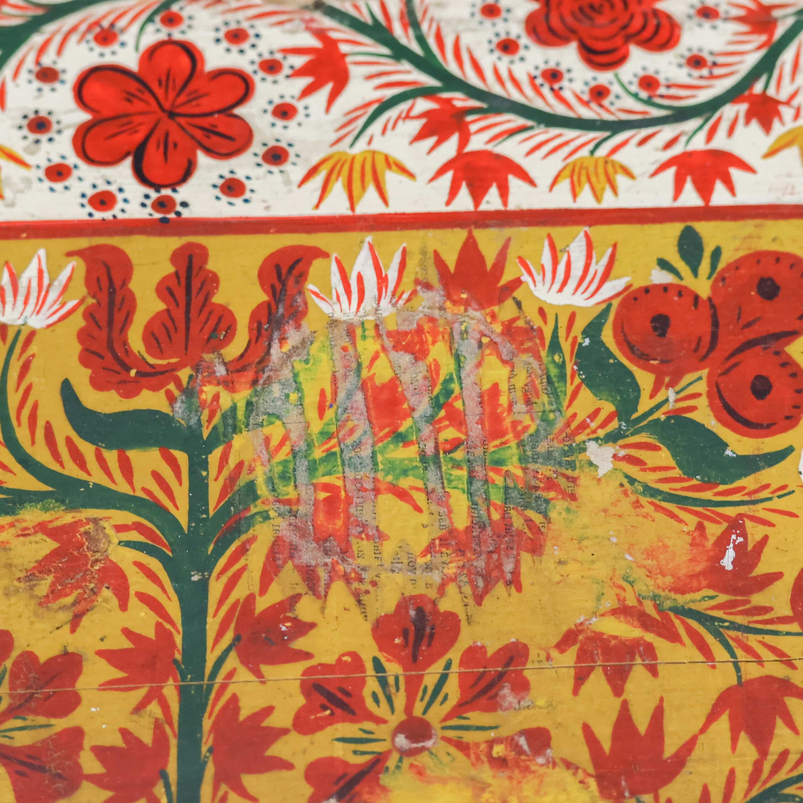 Zelden komen we nog zo’n prachtexemplaar tegen! Deze handbeschilderde houten kist is nog helemaal in originele staat, echt een sfeermaker dus. De beschilderingen en het hout zijn door de jaren heen hier en daar verweerd, zie foto’s.