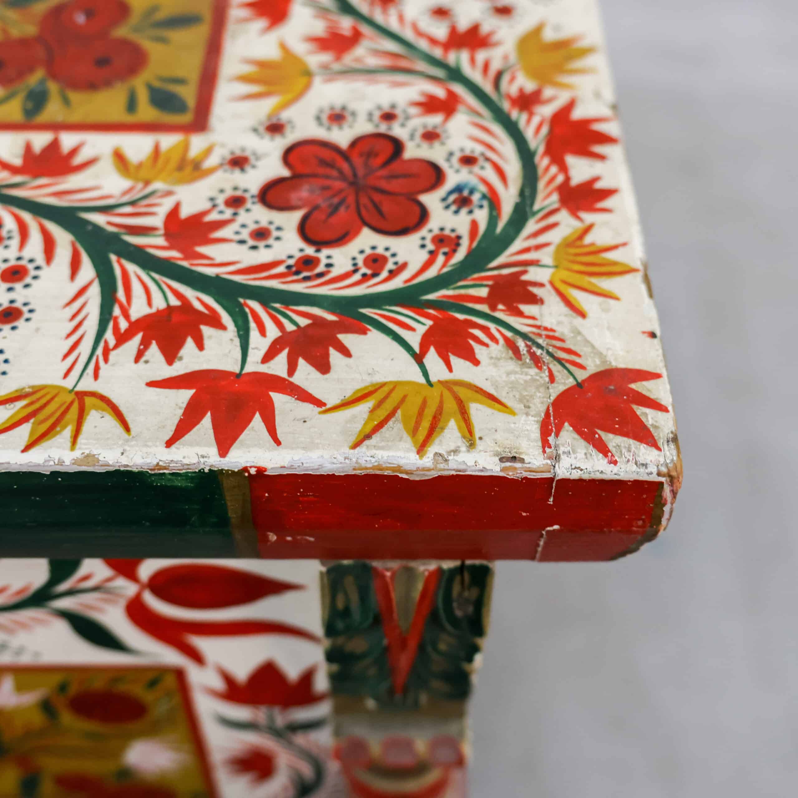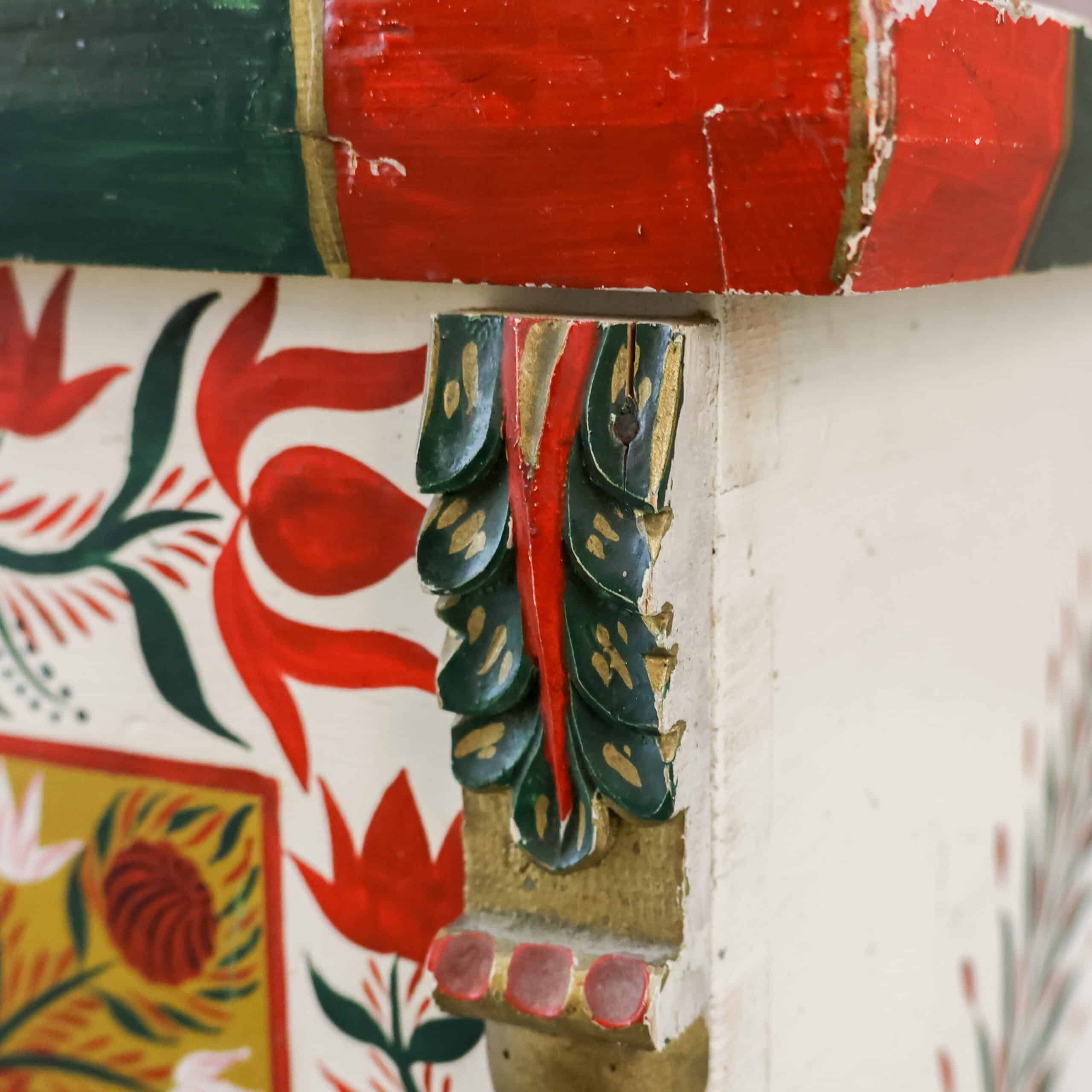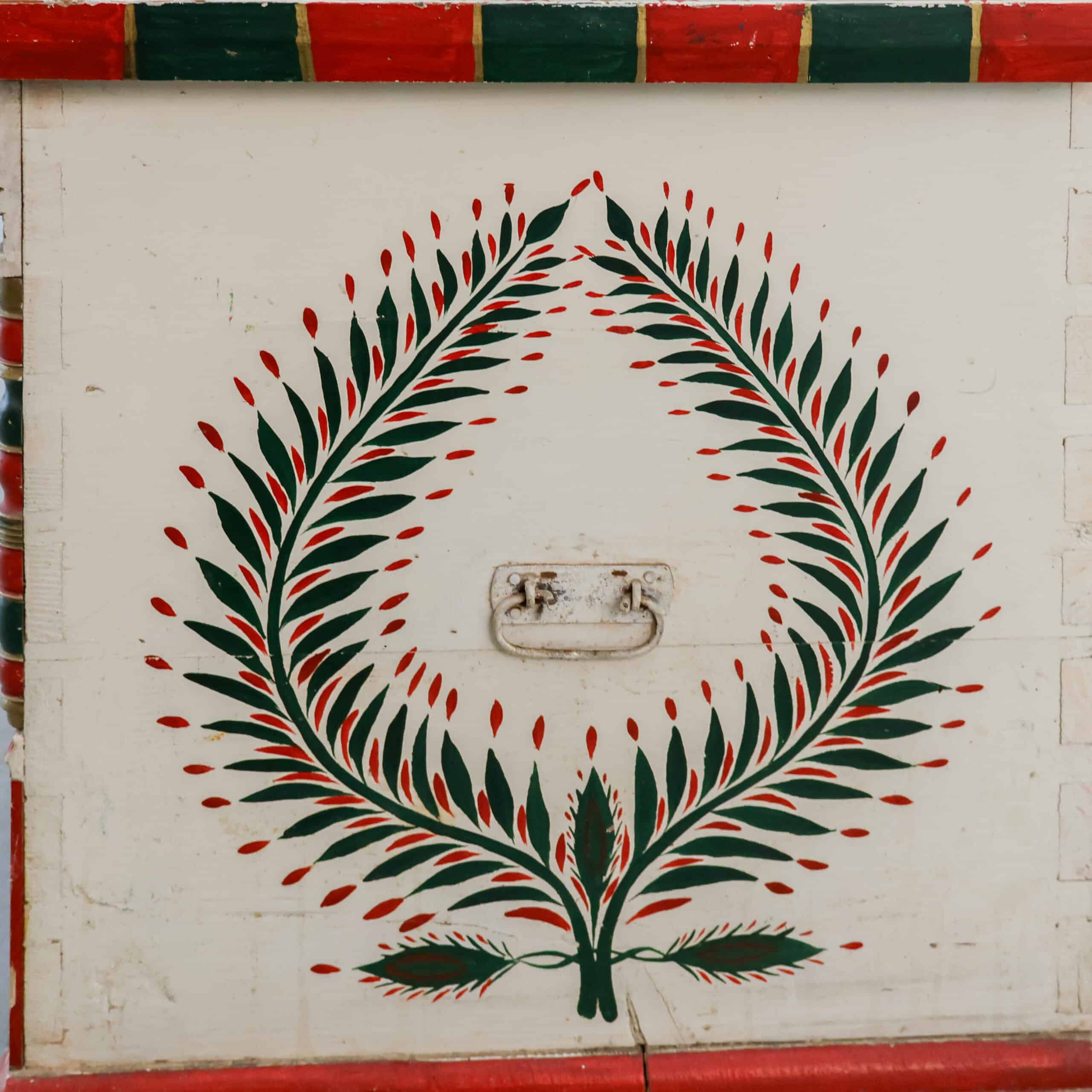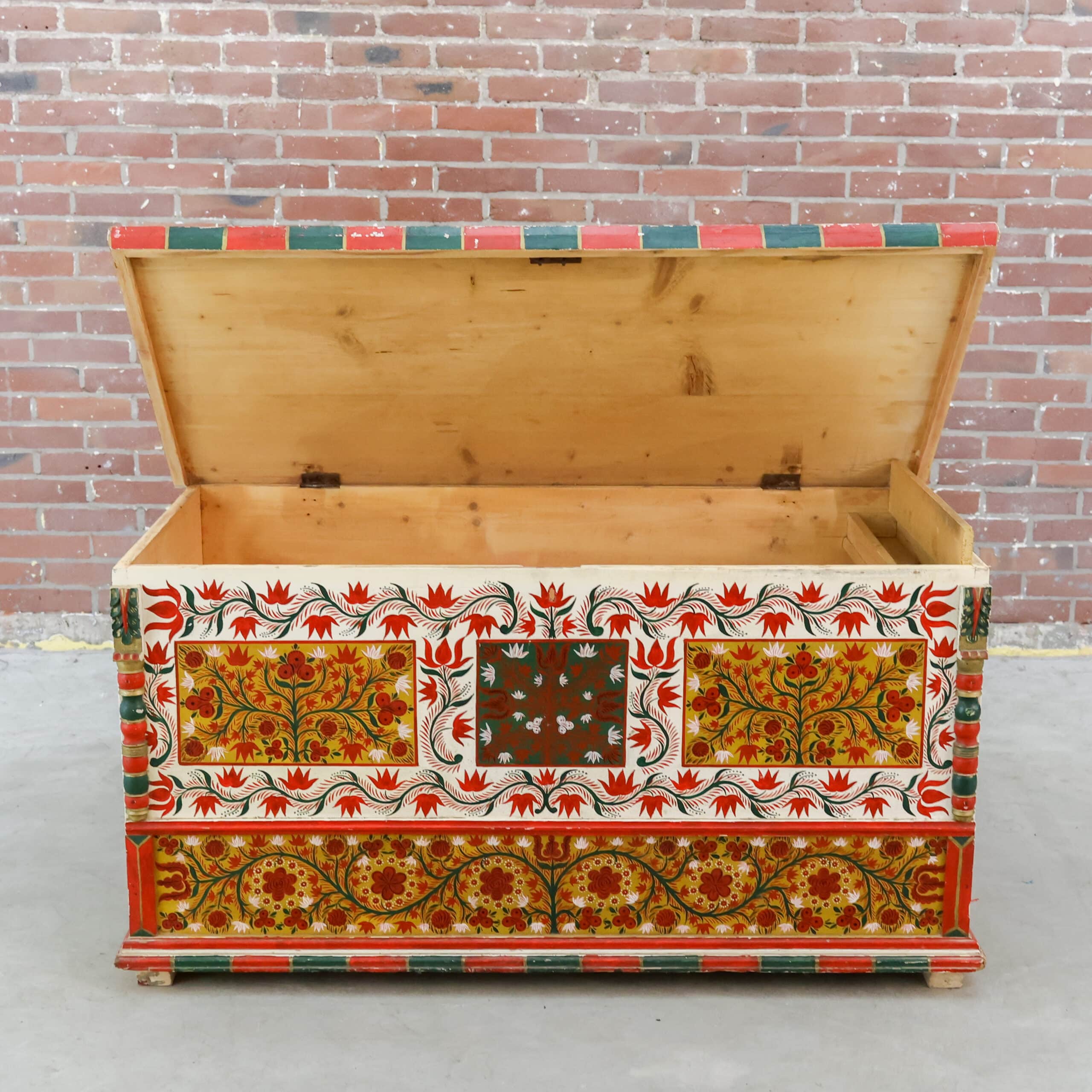 Zelden komen we nog zo’n prachtexemplaar tegen! Deze handbeschilderde houten kist is nog helemaal in originele staat, echt een sfeermaker dus. De beschilderingen en het hout zijn door de jaren heen hier en daar verweerd, zie foto’s.