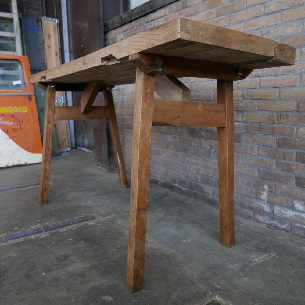 Deze hoge slachttafel is gemaakt van hout. Een tafel die je (winkel) interieur een industriële uitstraling zal geven. Het dikke bovenblad heeft een prachtige kleur. De tafel staat op vier robuuste poten en heeft een hoogte van 90 cm, zodat je er ook staande achter zou kunnen werken.