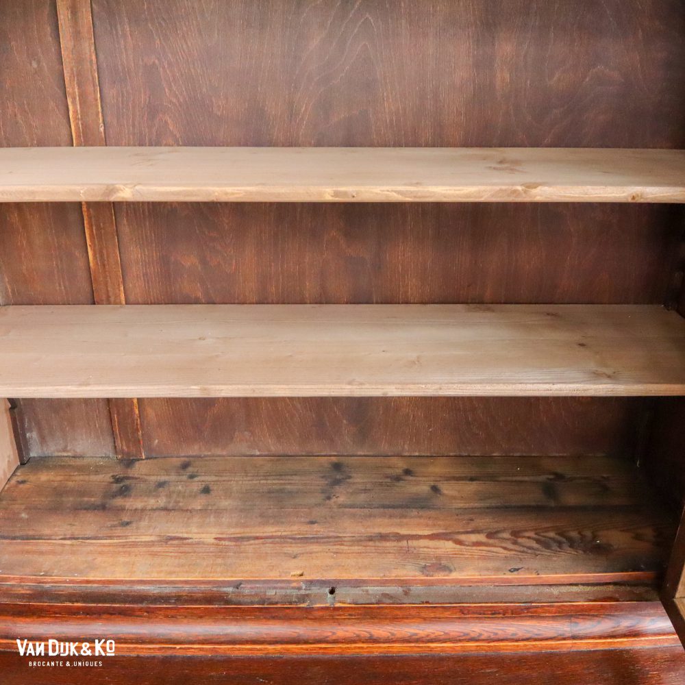 Wederom zo’n mooie joekel van een vitrinekast uit Hongarije! We hebben haar opgeknapt waar nodig maar zoveel mogelijk in haar mooie originele staat gelaten. Handig: de legplanken van deze beauty zijn verstelbaar.