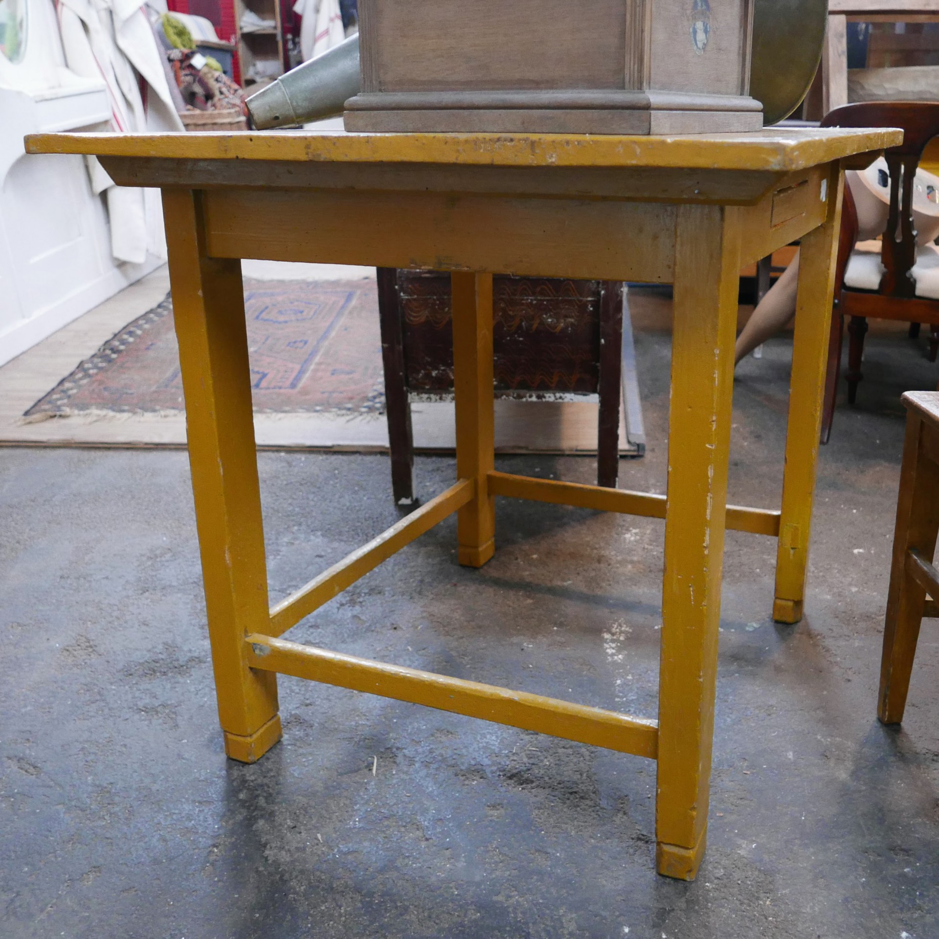 Brocante gele tafel, gemaakt van hout. Het tafeltje heeft geel frame en een geel tafelblad. Prima eettafel in een kleine keuken. Toont gebruikerssporen.