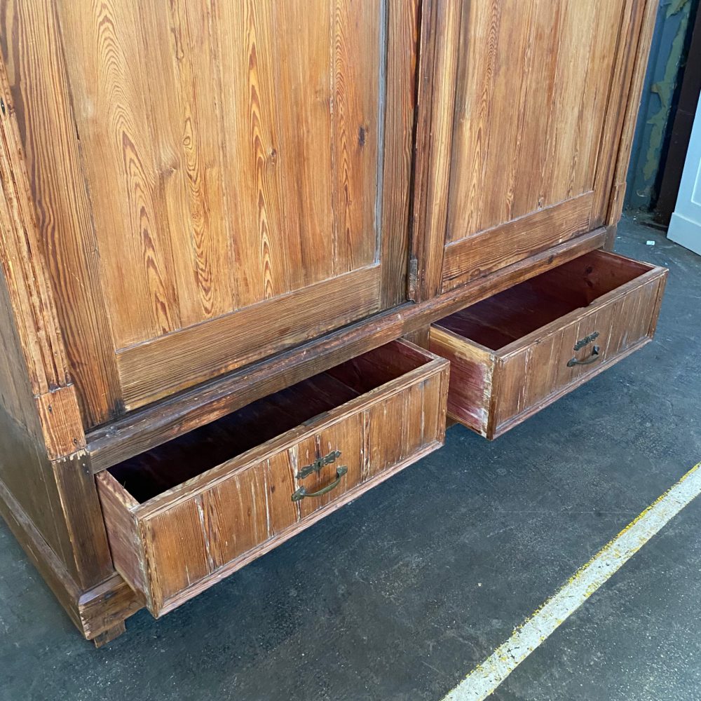 Deze grote kledingkast is gemaakt van hout. De kast kan uit elkaar. De kledingkast heeft twee grote schuifdeuren deuren naar één grote ruimte met drie planken. De planken zijn nog beplakt met plakplastic van de vorige eigenaar. Onderin heeft de linnenkast twee grote lades met metalen grepen. De kast toont gebruikerssporen.