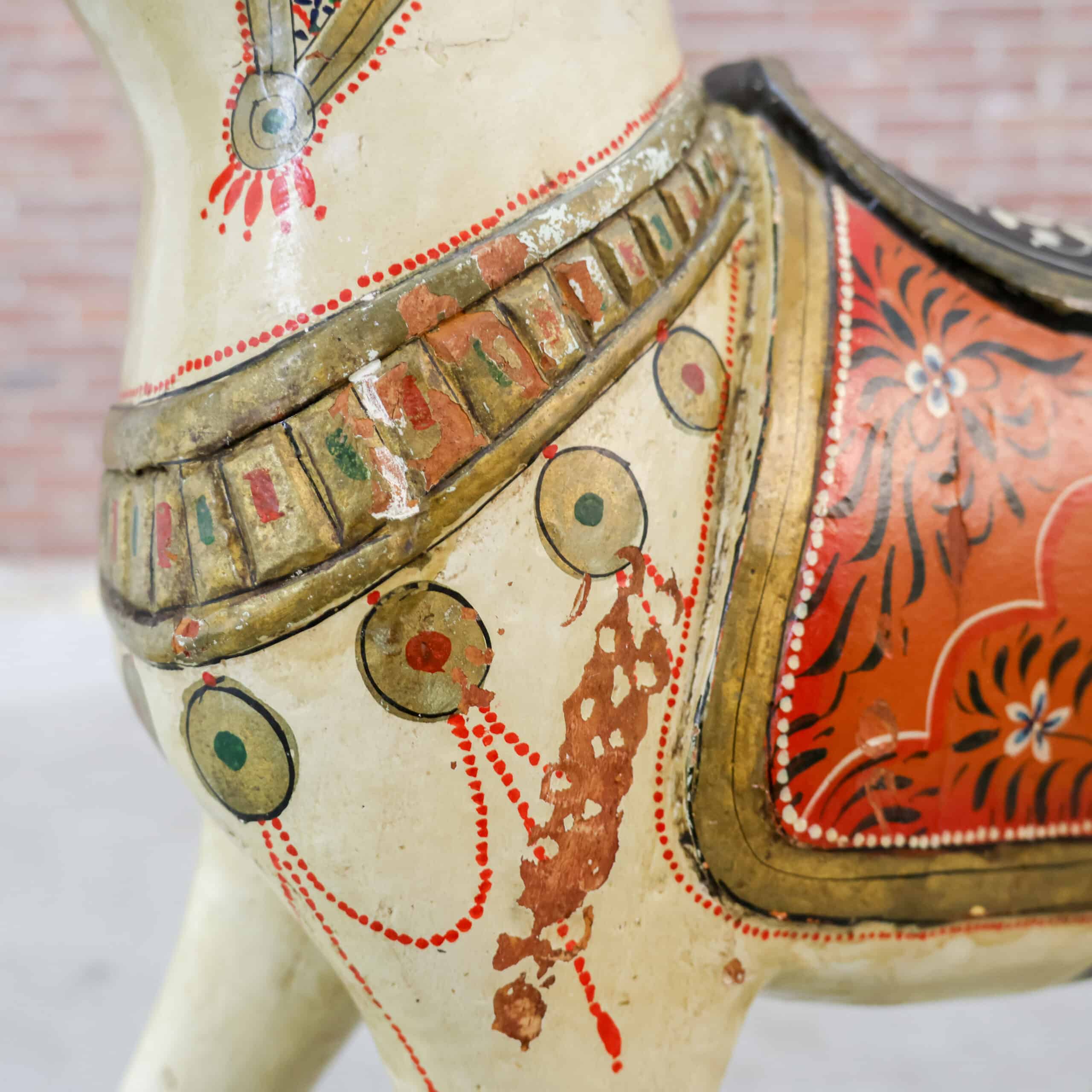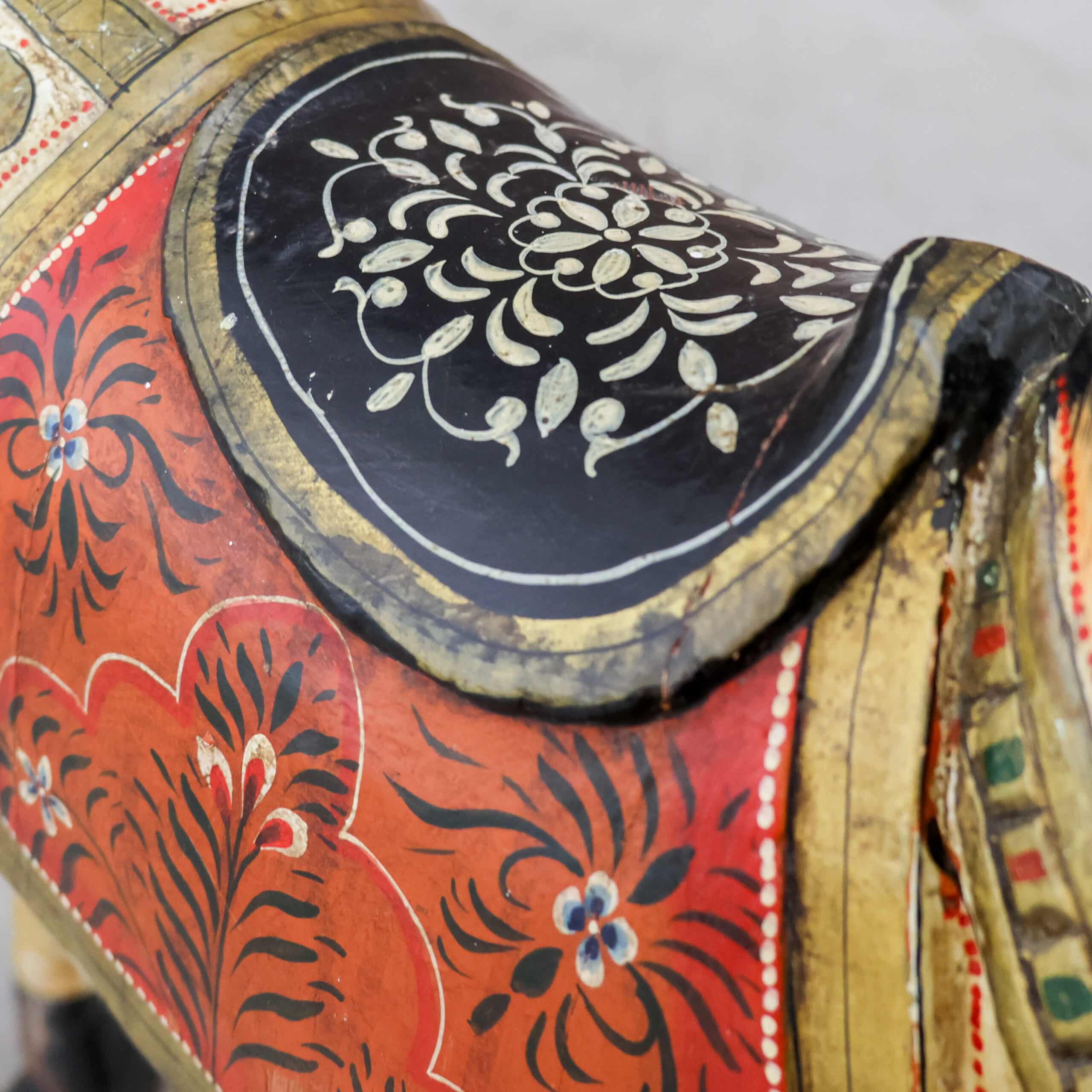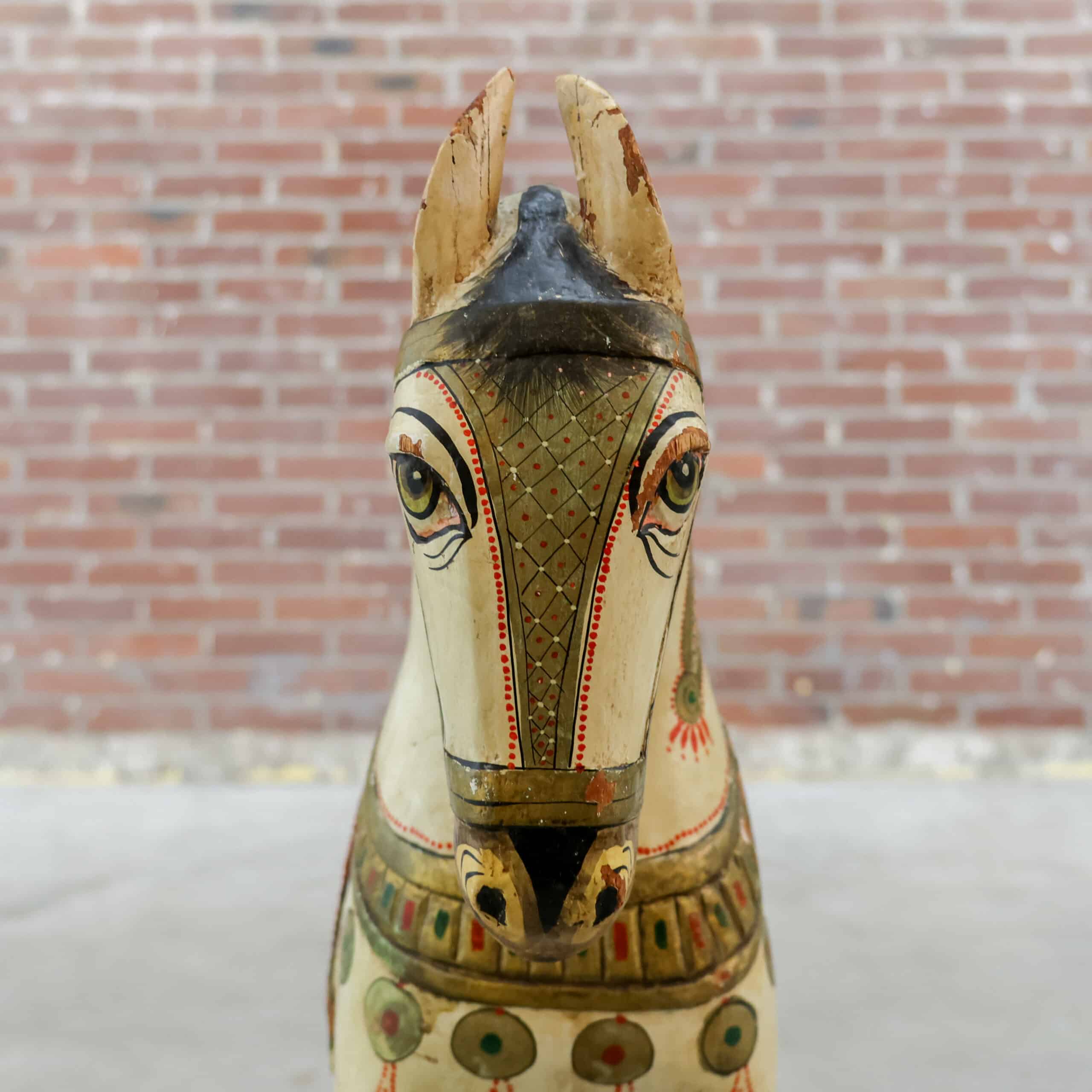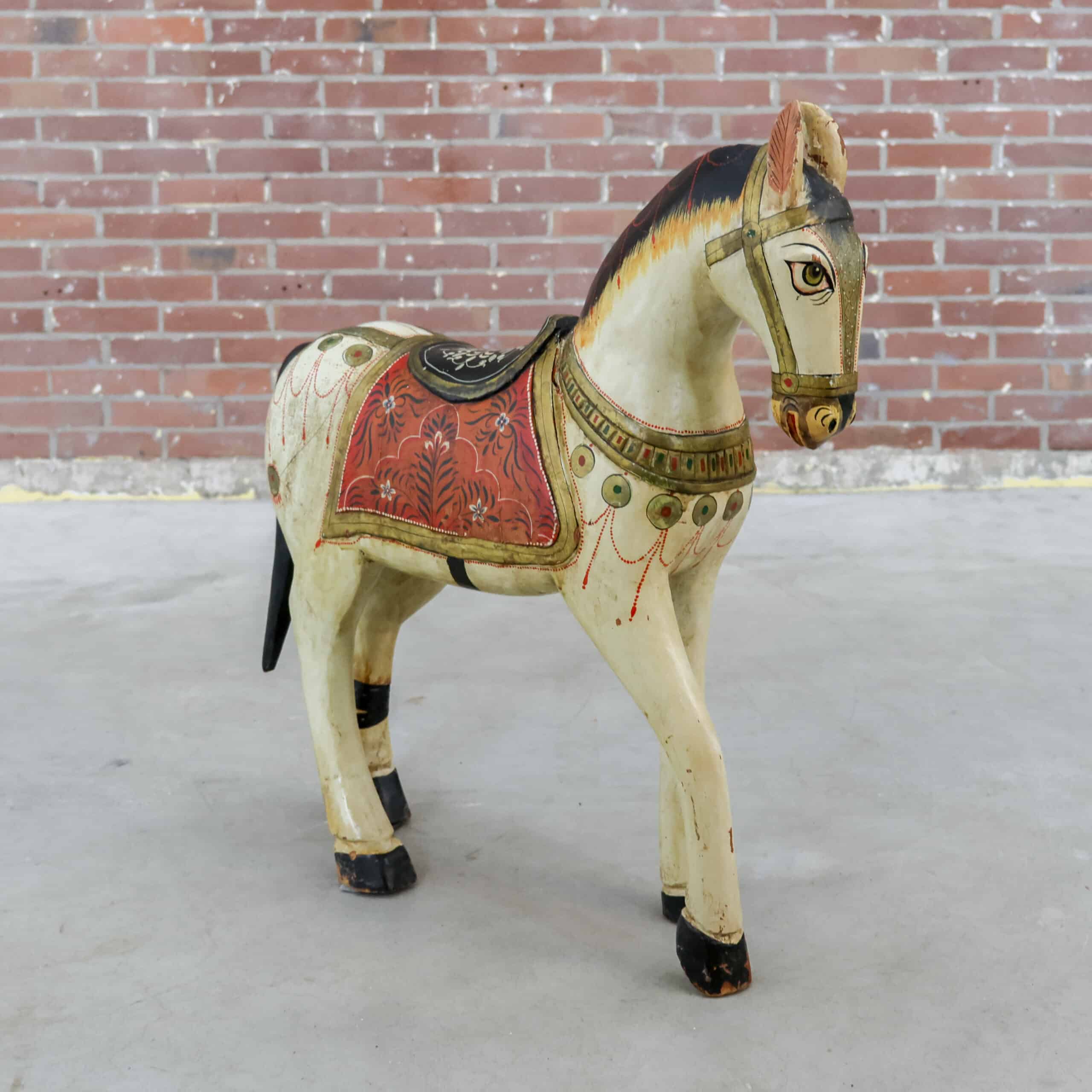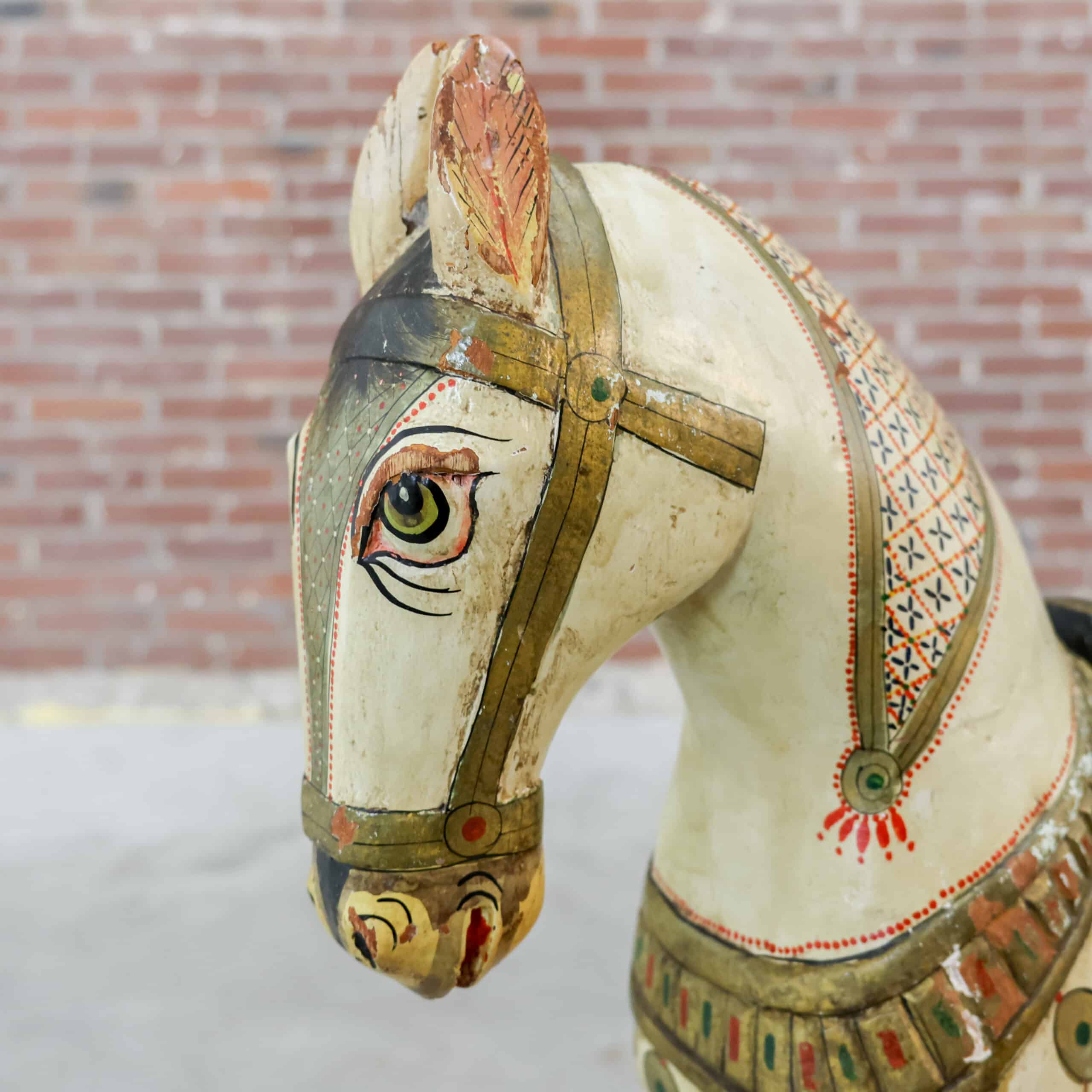 Prachtig oud houten sierpaard van 78 cm hoog, met een warme, doorleefde uitstraling en rijk beschilderde details. De originele verf, siermotieven en het zadel geven het paard een nostalgische kermis- of carrouselachtige charme. Door de jaren heen heeft het stuk gebruikssporen gekregen, wat juist zorgt voor karakter en authenticiteit.