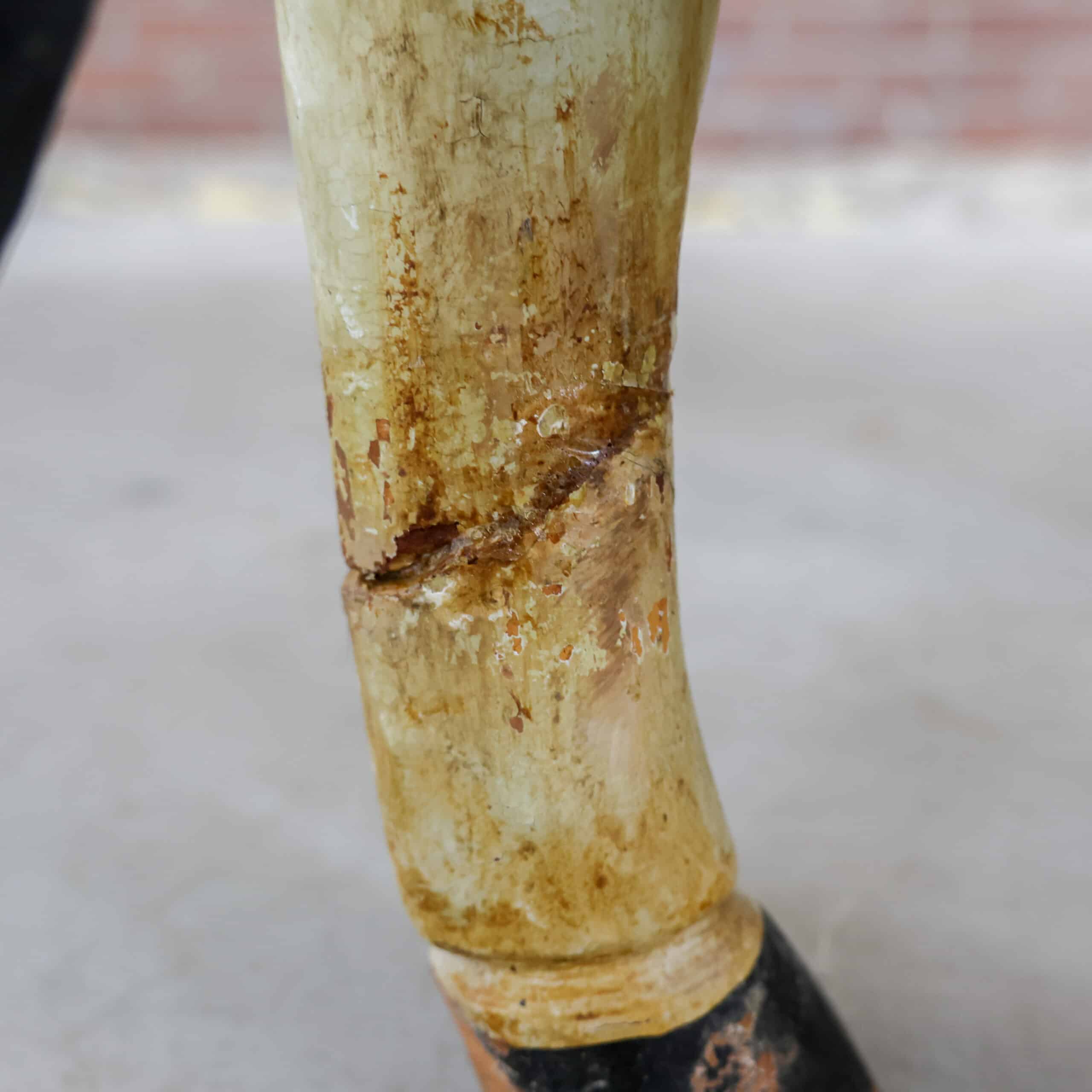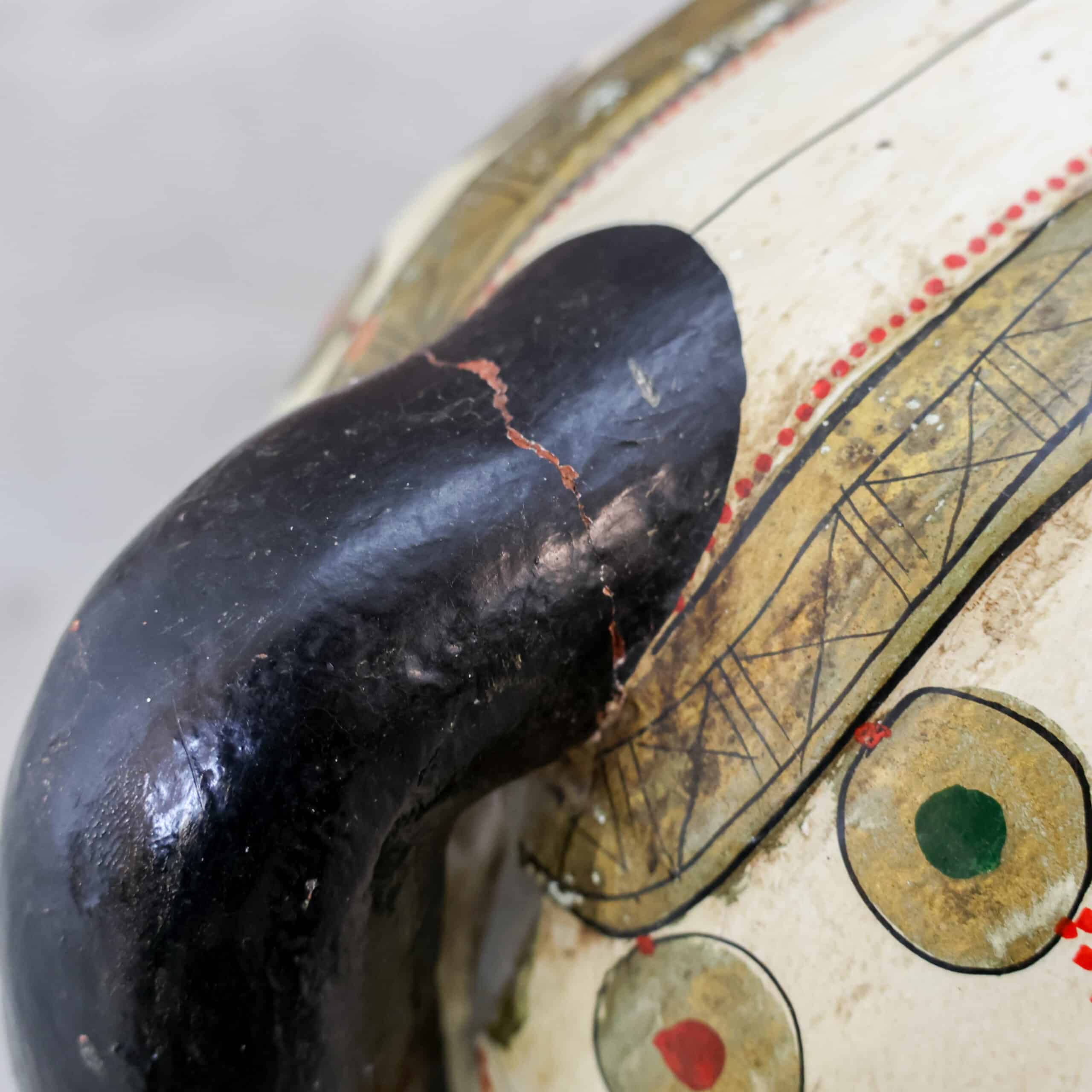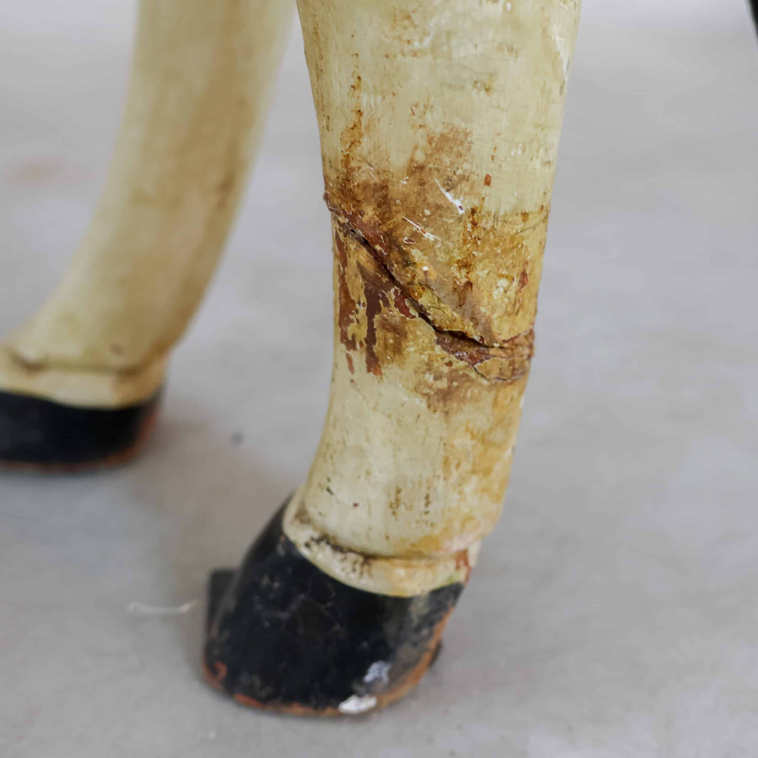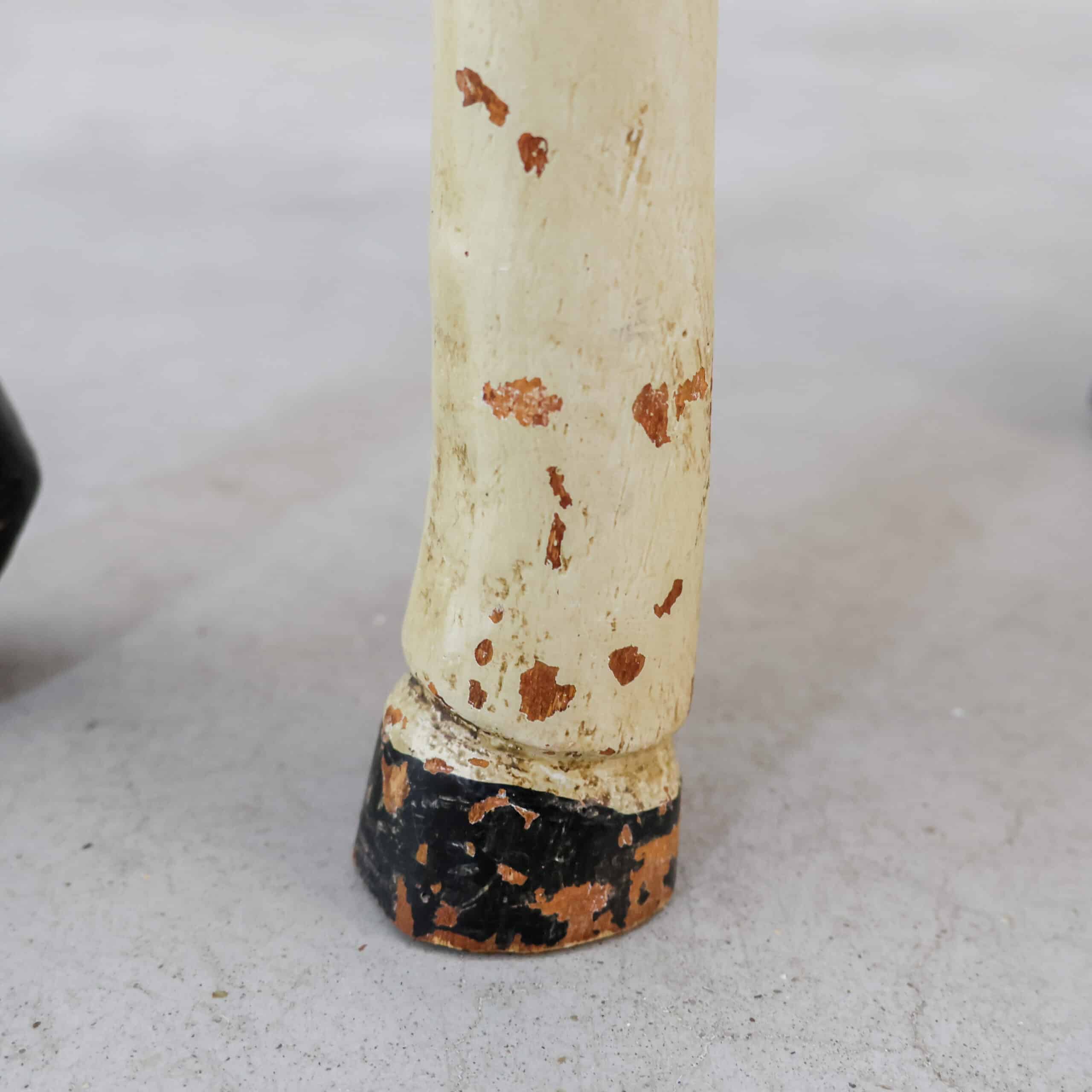 Aan het achterbeen zit een duidelijke oude beschadiging/scheur (zie detailfoto’s). Dit doet niets af aan de decoratieve uitstraling, maar is wel zichtbaar en daarom meegenomen in de prijs. Juist deze imperfecties maken het een uniek en sfeervol object voor in een interieur, etalage of kinderkamer.