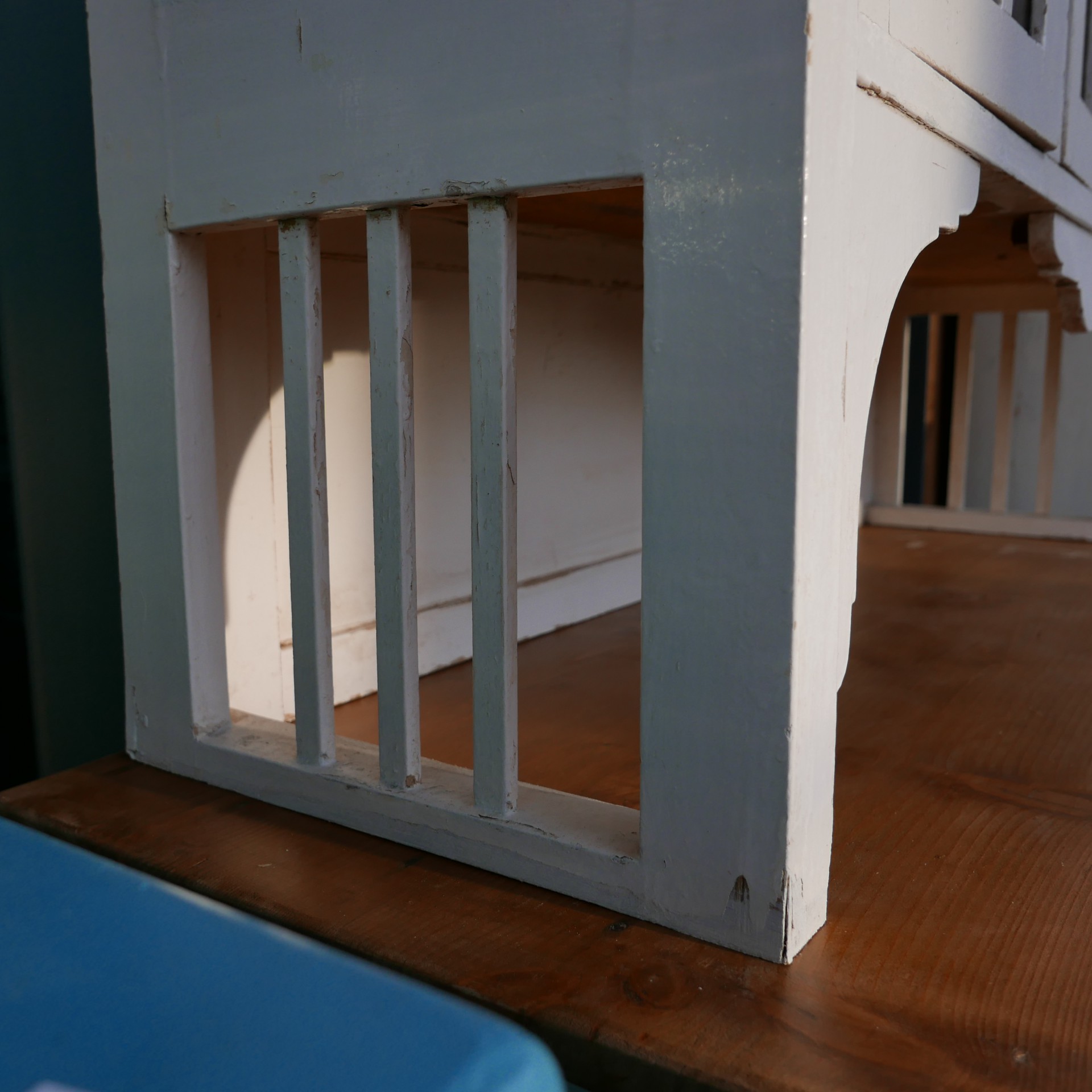 Deze buffetkast is gemaakt van hout en wit. De keukenkast bestaat uit twee delen die op elkaar staan. De bovenkast heeft drie glazen deuren naar een ruimte met een plank. Boven het middelste deurtje zit een nis. Het bovenblad van de onderkast is gemaakt van onbewerkt hout. De onderkast heeft twee lades met metalen grepen en twee dichte deuren met een plank binnenin. De kast toont gebruikerssporen.