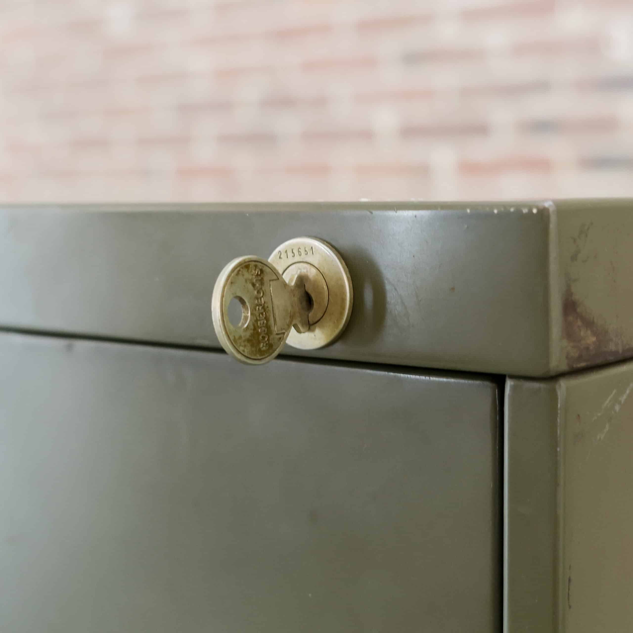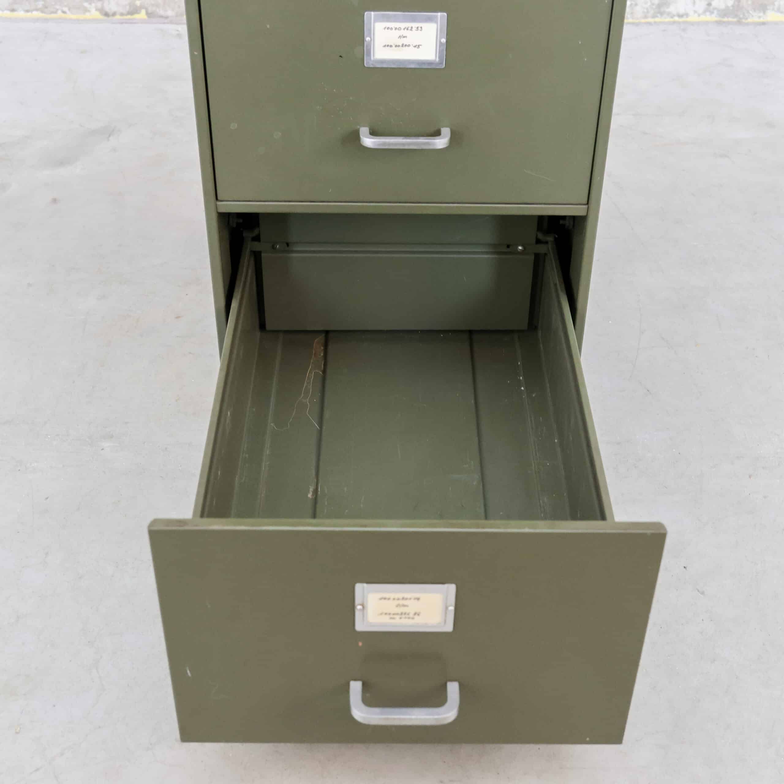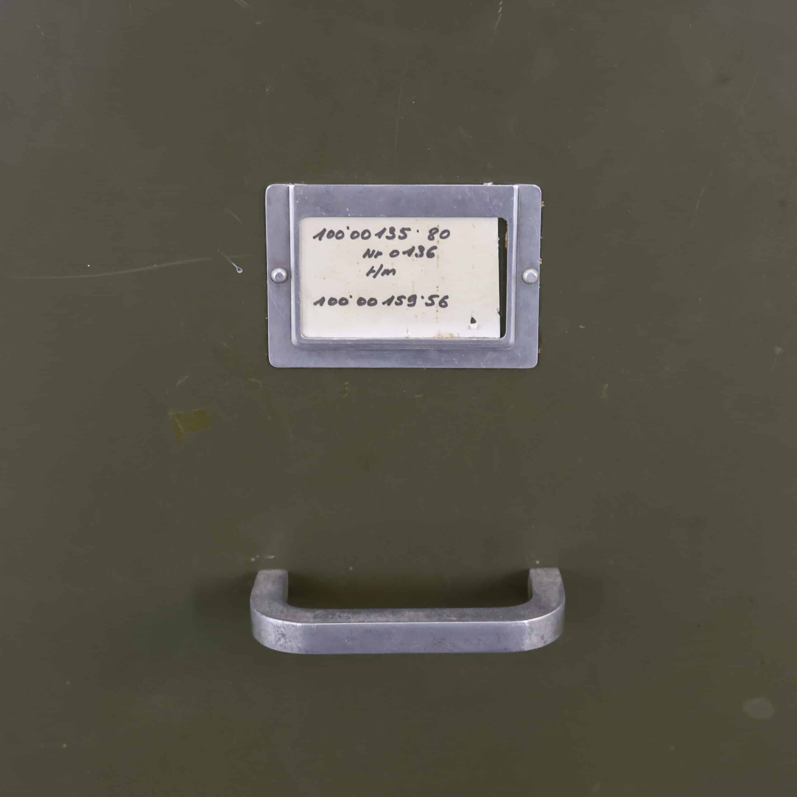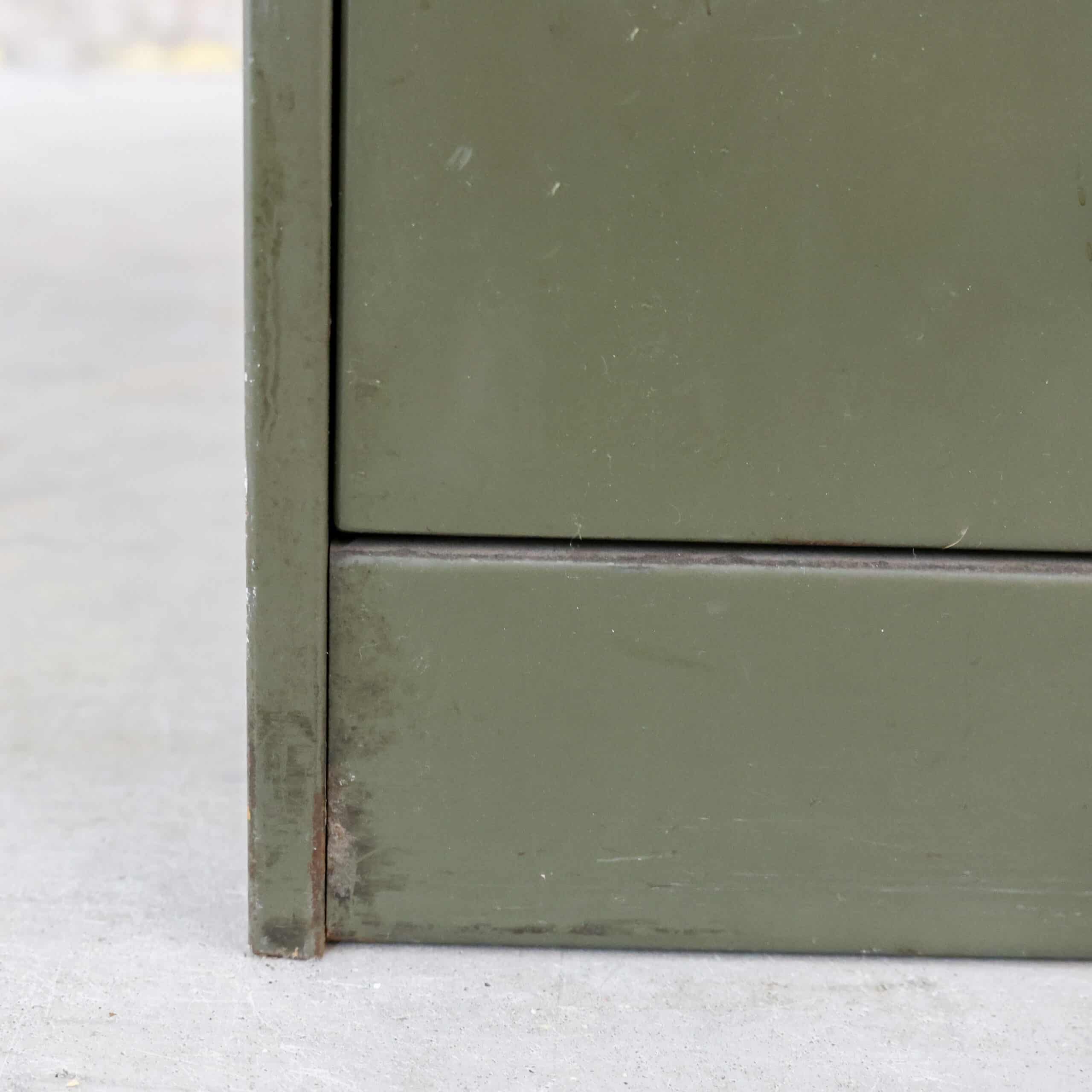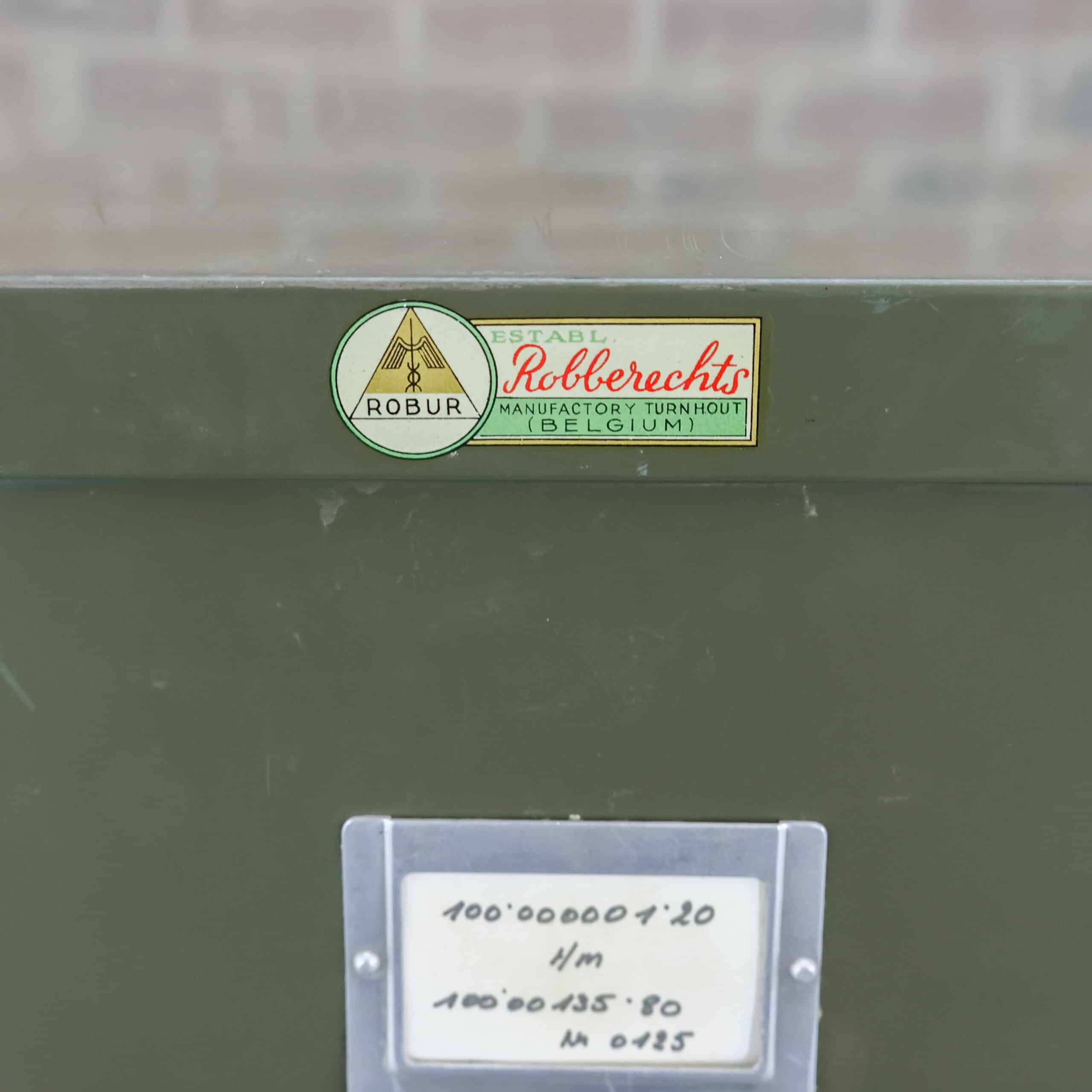 Deze industriële archiefkast van Robberechts uit Turnhout (België) is een authentiek mid-century meubel met een stoere uitstraling. De legergroene metalen kast is door de jaren intensief gebruikt, wat heeft gezorgd voor een prachtige, doorleefde patina. Krassen, plekjes en lichte slijtage geven de kast juist zijn charme en karakter. Een eerlijk, robuust en sfeervol meubel dat perfect past in een industrieel of eclectisch interieur.
