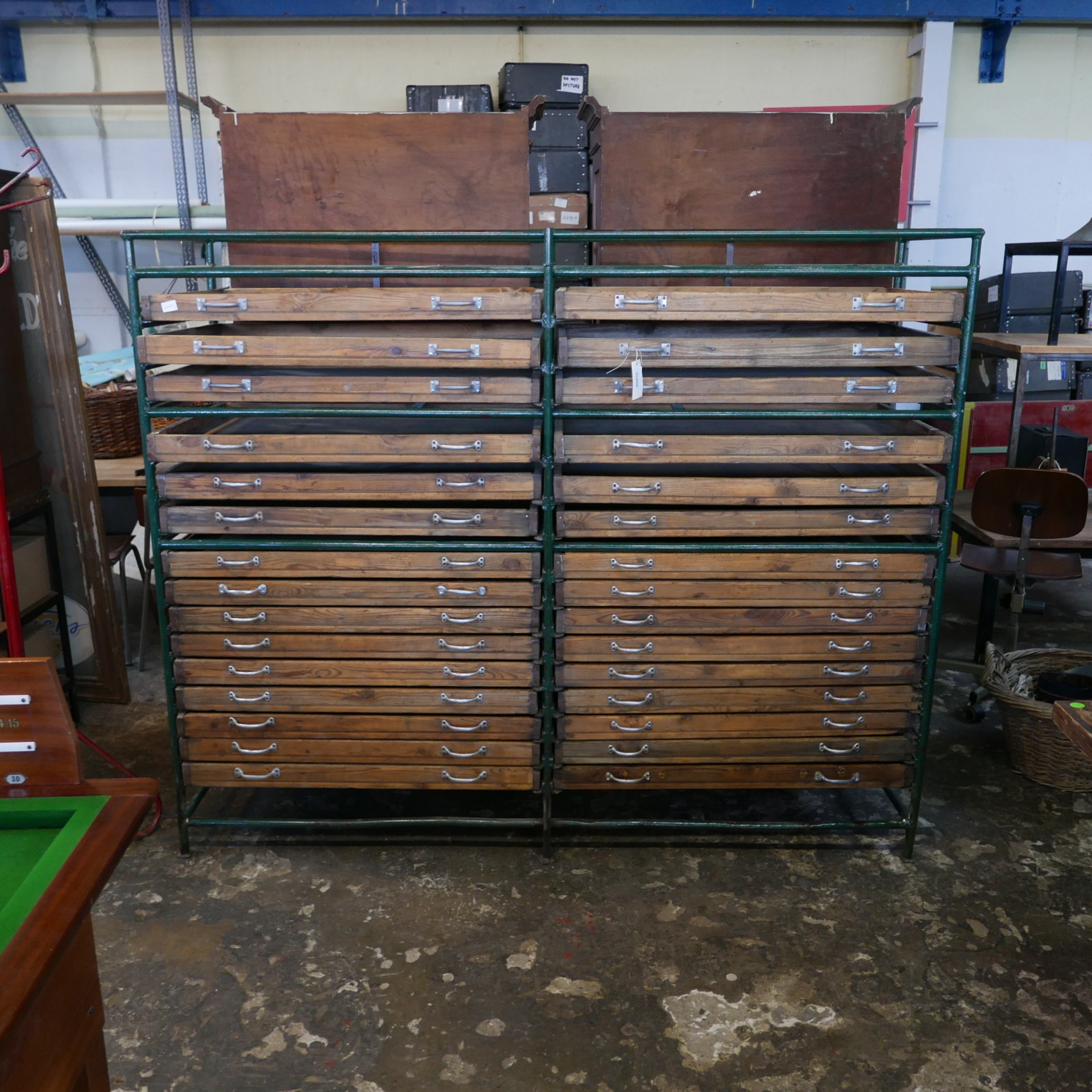 Deze grote vintage ladekast is gemaakt van groene metalen buizen en heeft een industriële uitstraling. De kast heeft in totaal 30 lades met ieder een identiek metalen greep. In de lades kun je tekeningen of papier opbergen. De kast toont gebruikerssporen.